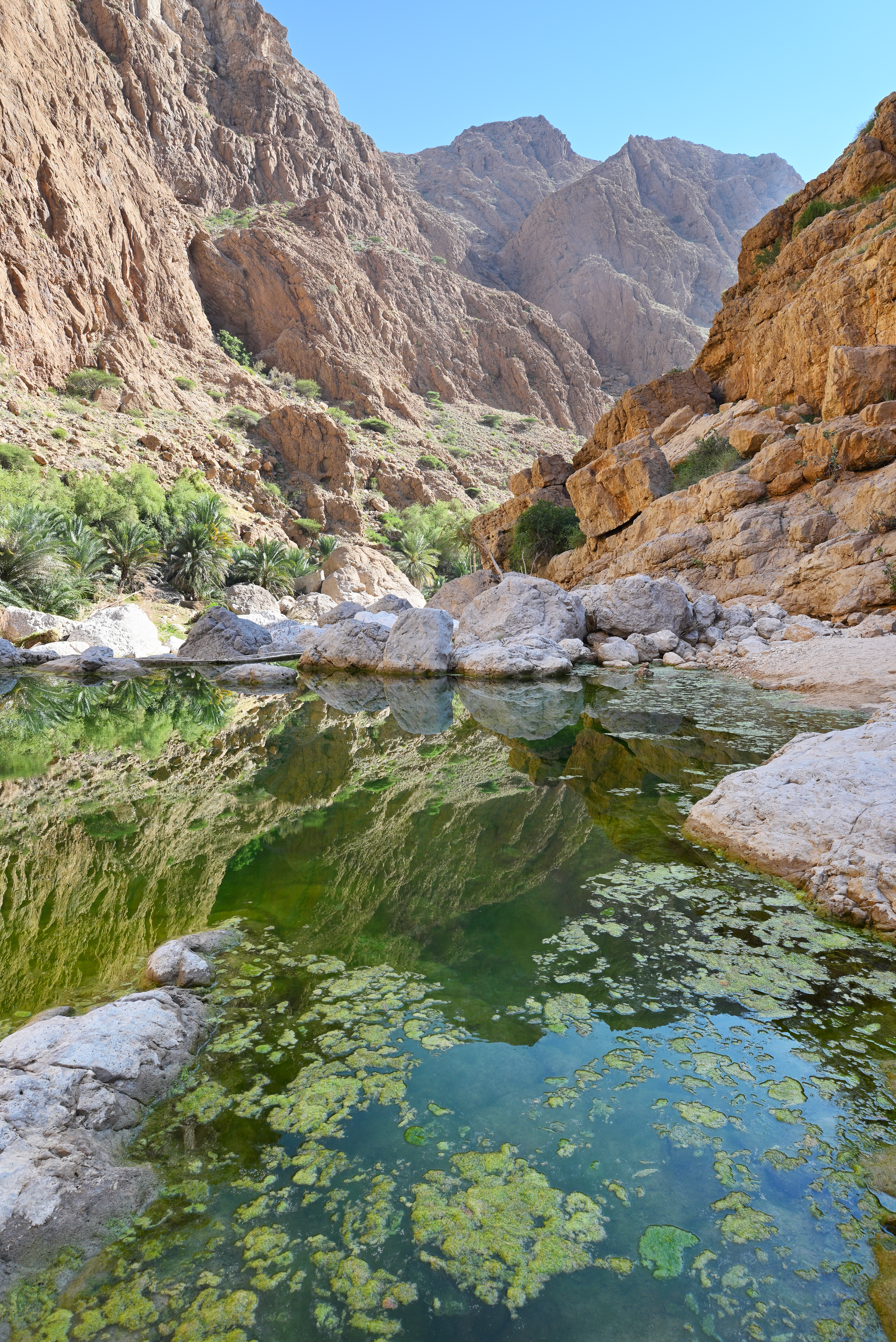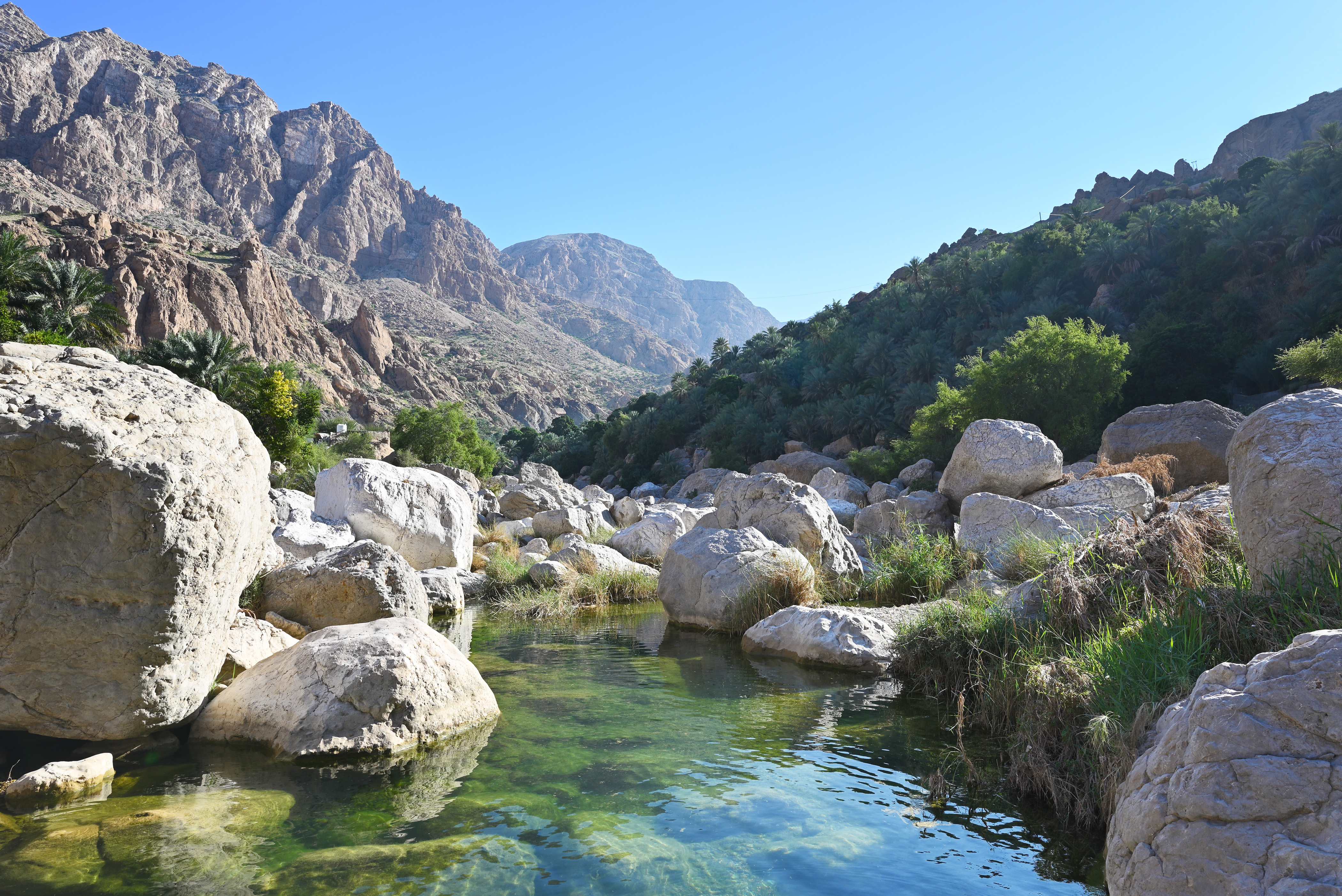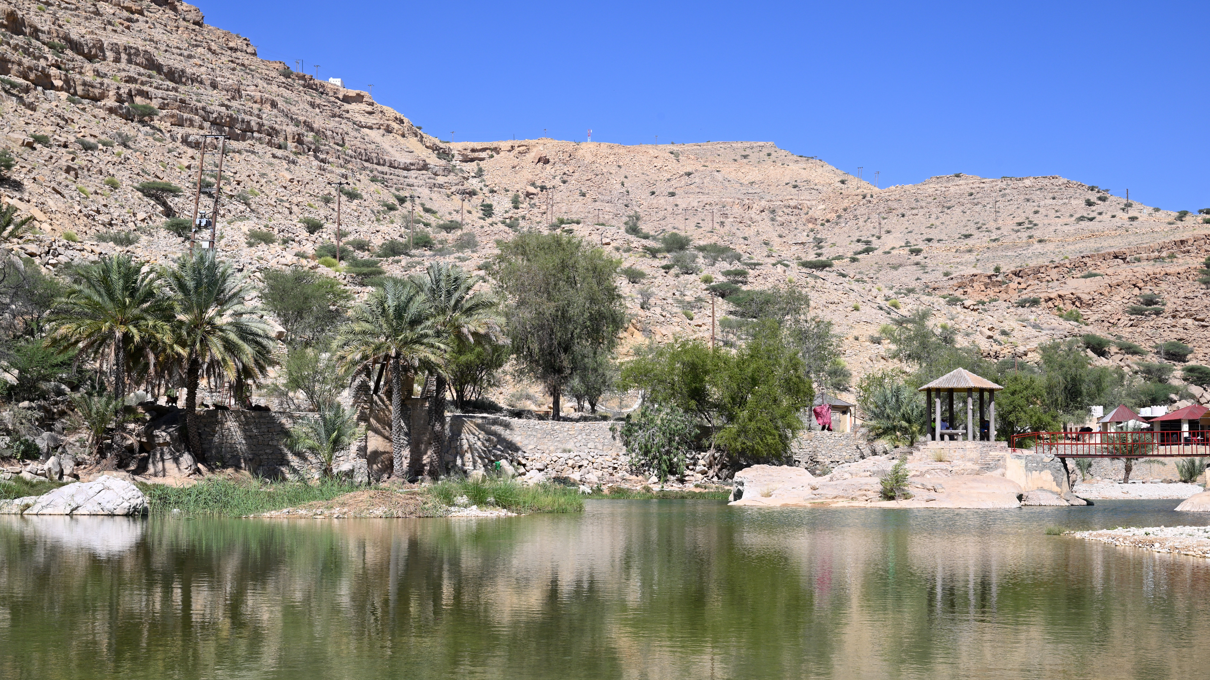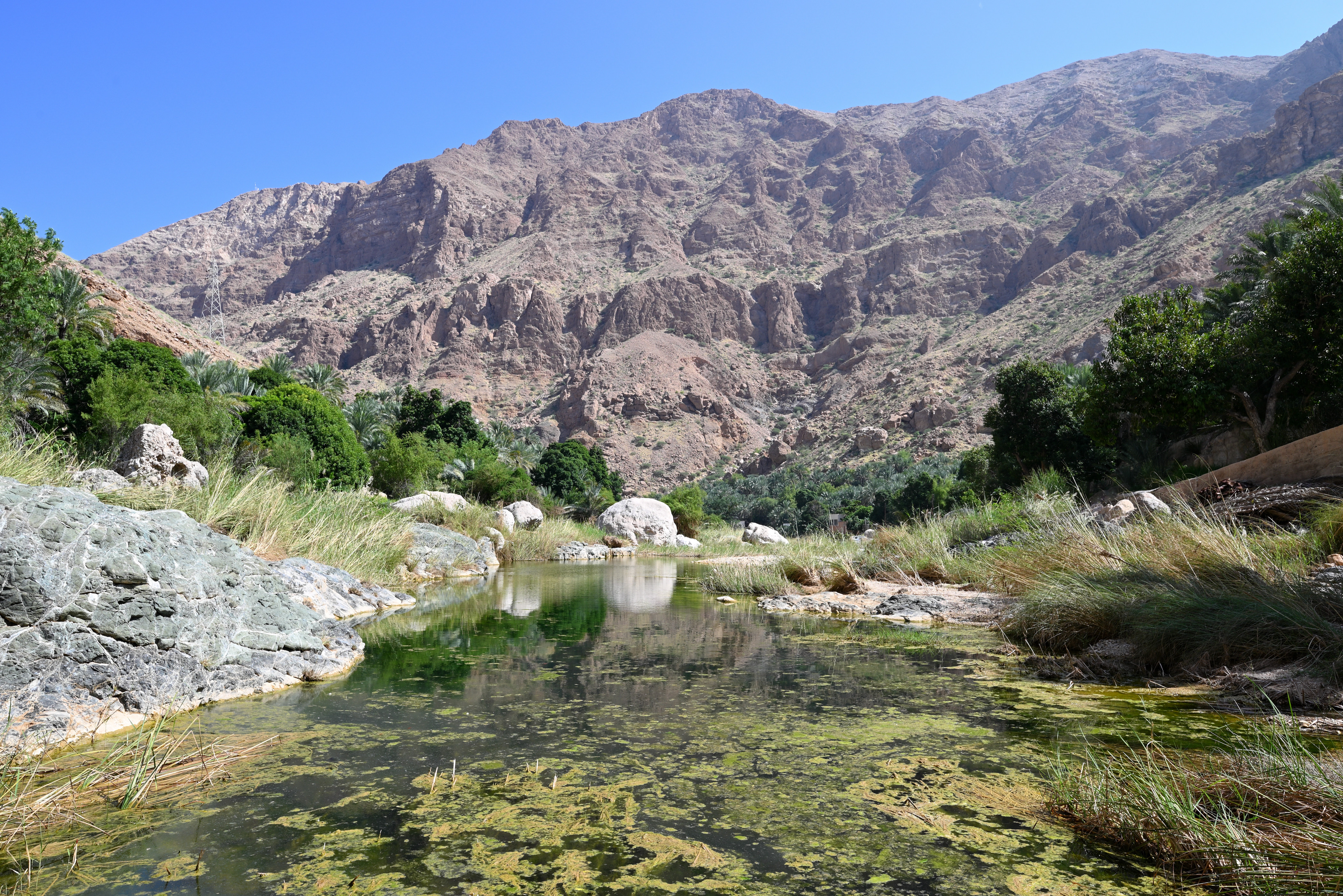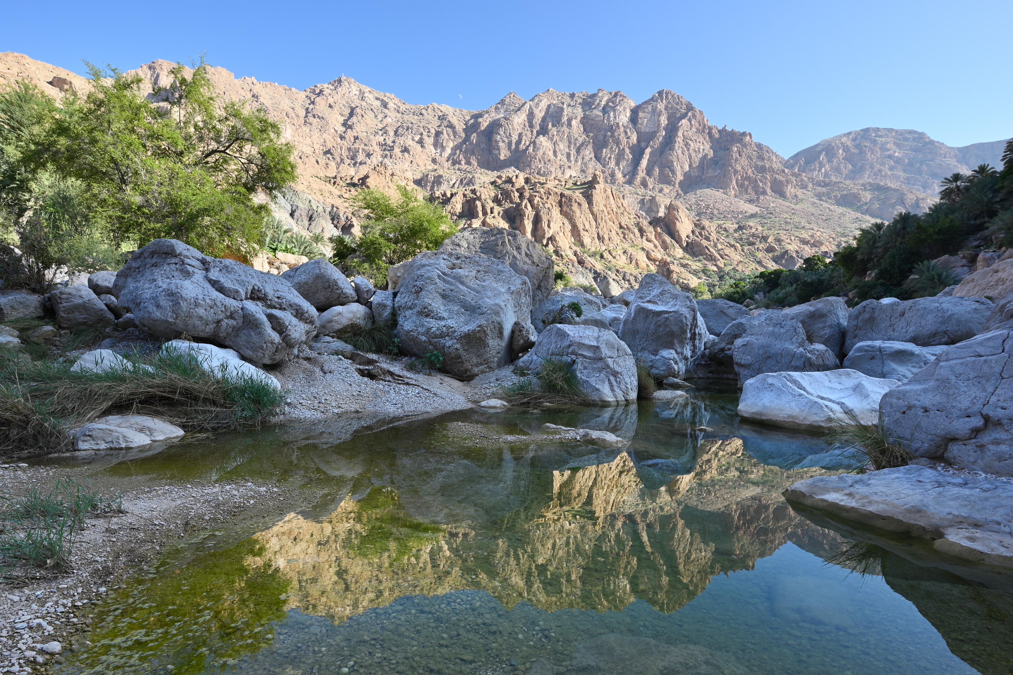 Am nächsten Tag steht eine Wanderung im berühmten Wadi Shab auf dem Programm. Der Canyon ist beeindruckend, mit steilen Felswänden und glasklaren Pools. Auch wenn die jüngsten Regenfälle das Grün etwas gedämpft haben, hat die Landschaft nichts von ihrer Magie verloren. Zum Glück sind wir früh unterwegs, denn auf dem Rückweg begegnen wir einer regelrechten Menschenflut.