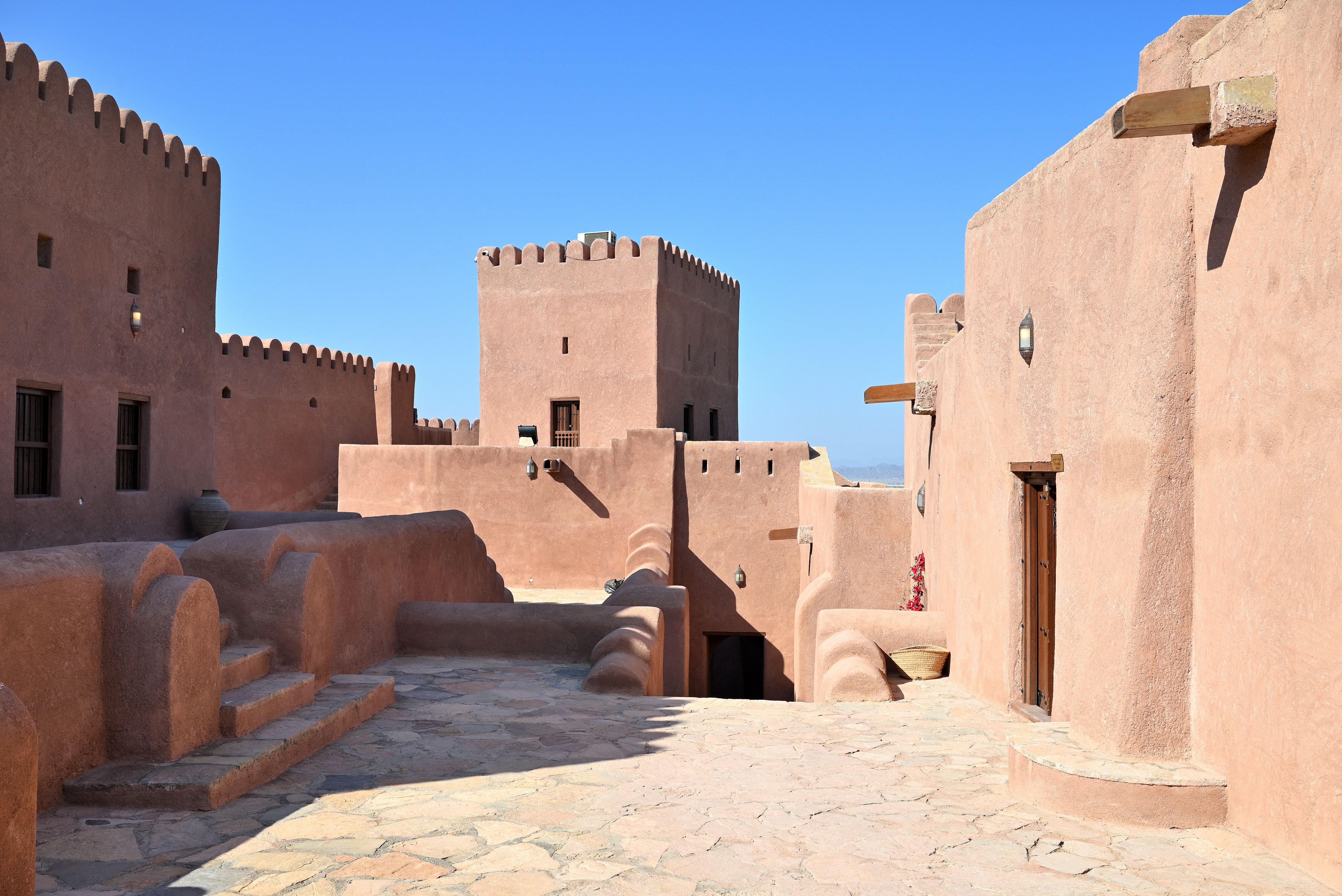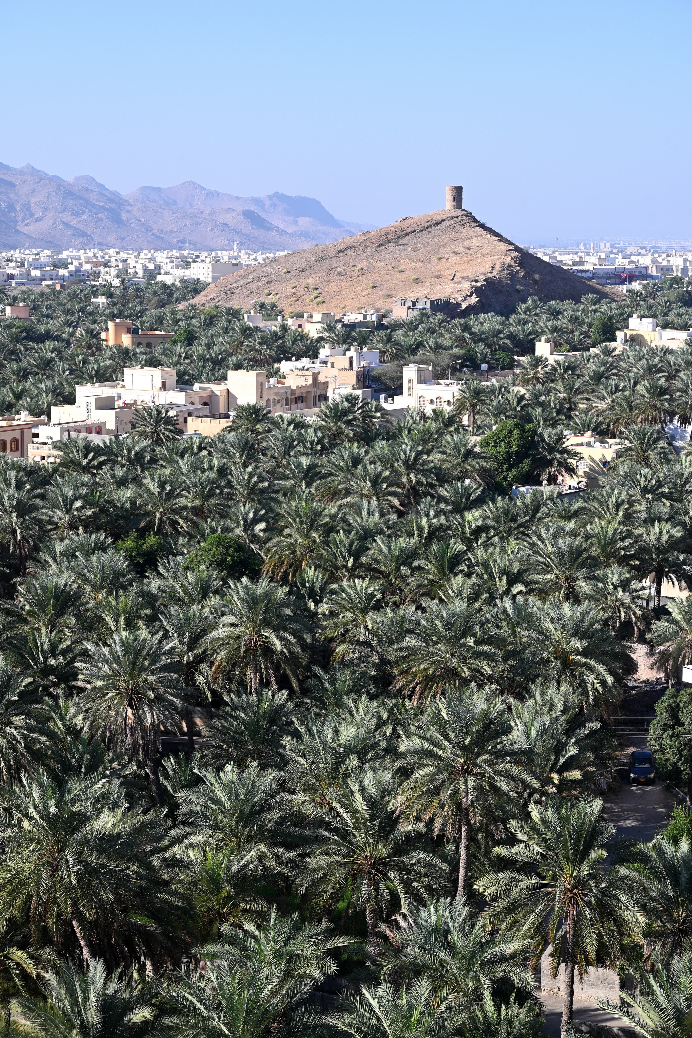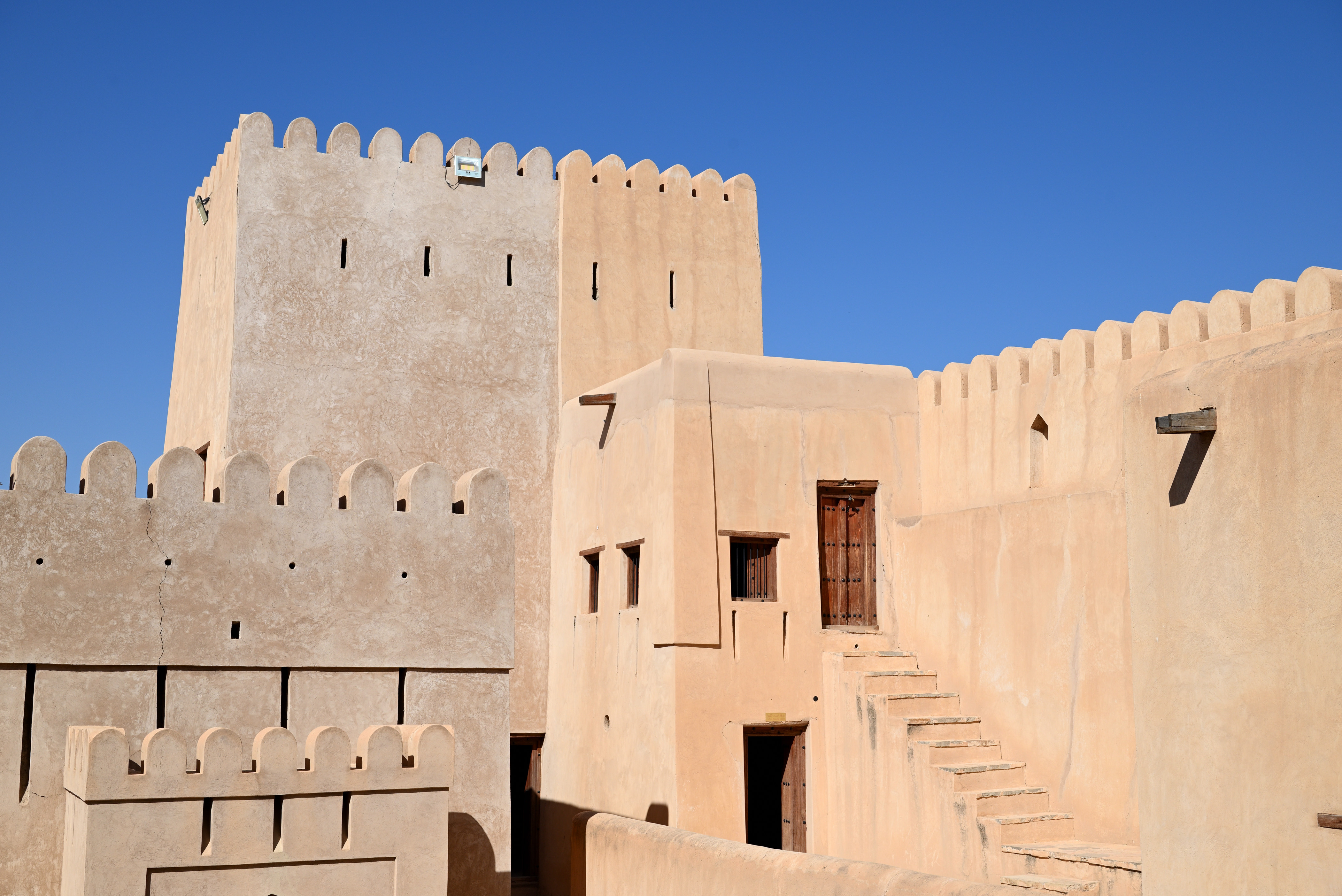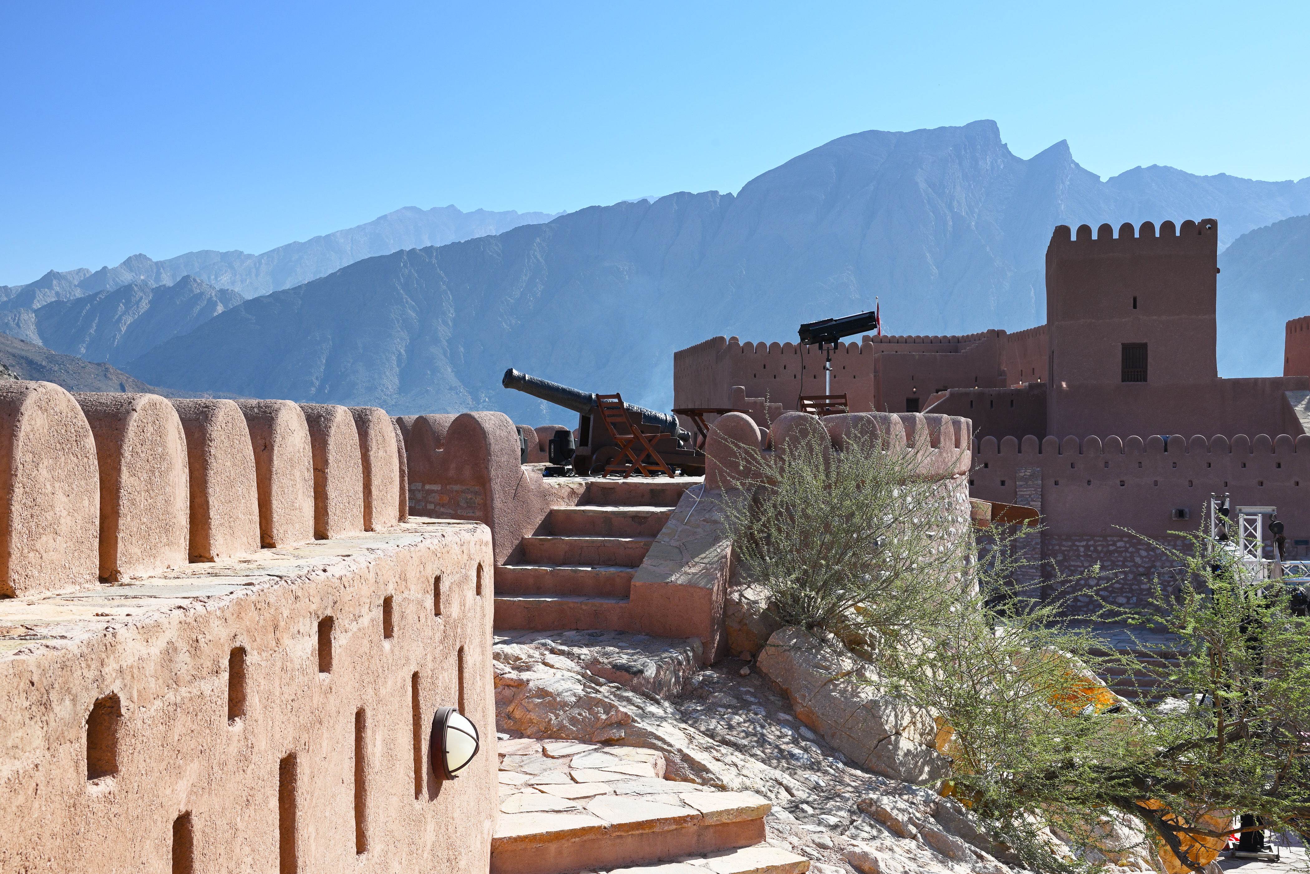 Der dritte Tag bringt den ersten großen Ortswechsel: Wir verlassen Maskat und brechen auf in Richtung Nizwa. Unsere Route führt uns durch das mächtige Hadschar-Gebirge. Zunächst halten wir jedoch am Fort von Nakhal. Die massiven Mauern und die Aussicht von den Türmen über die grünen Oasen und Berge hinterlassen uns staunend.
