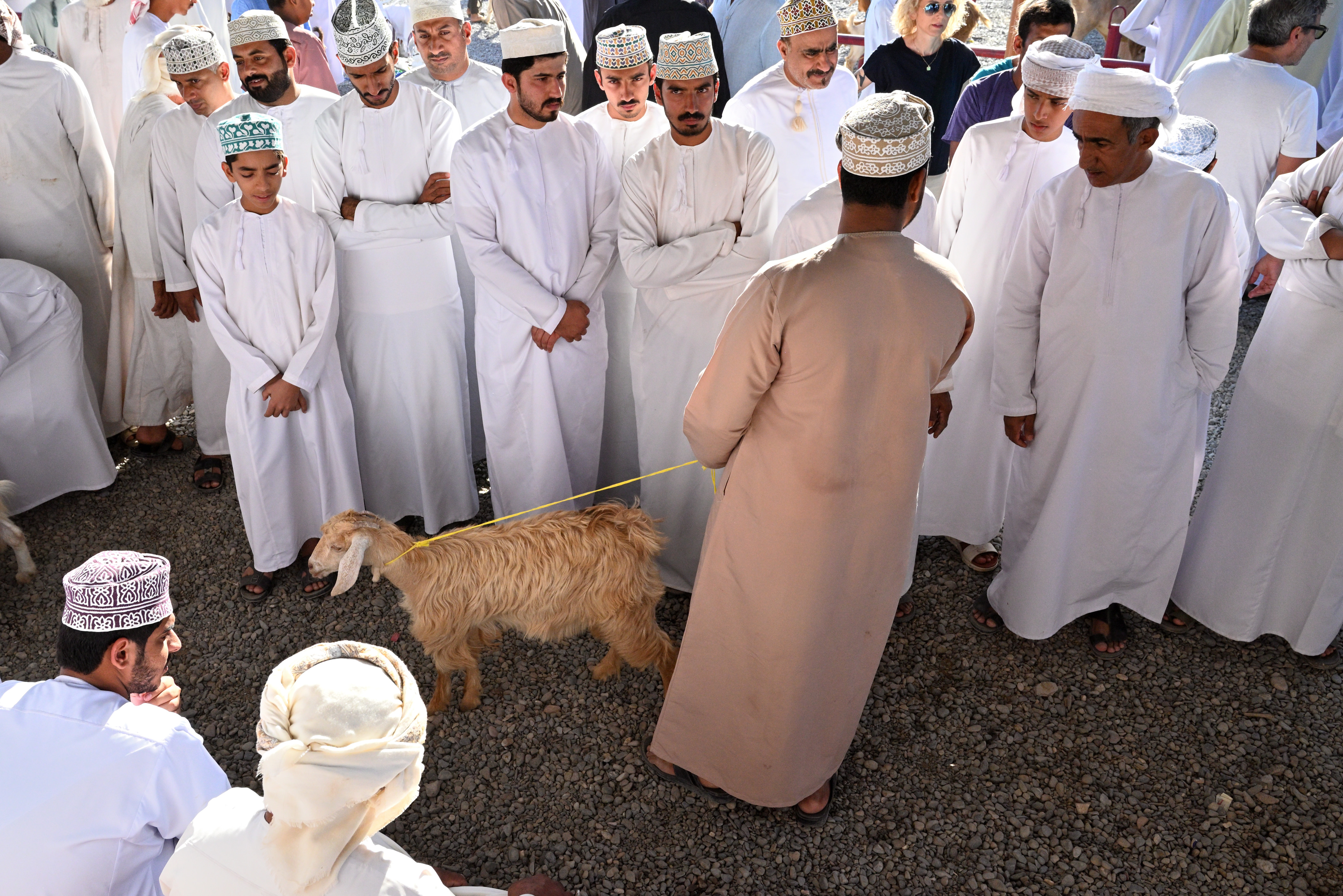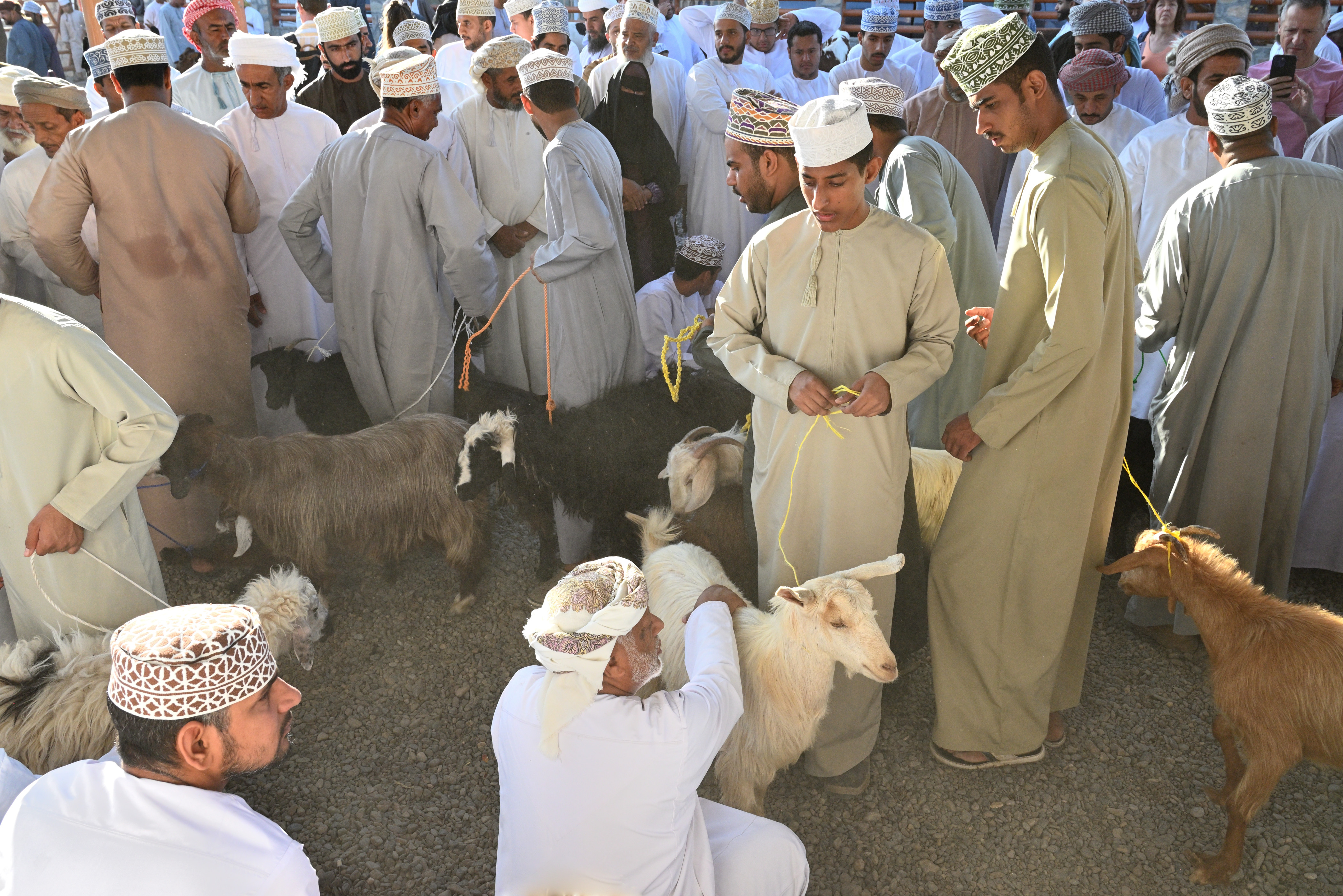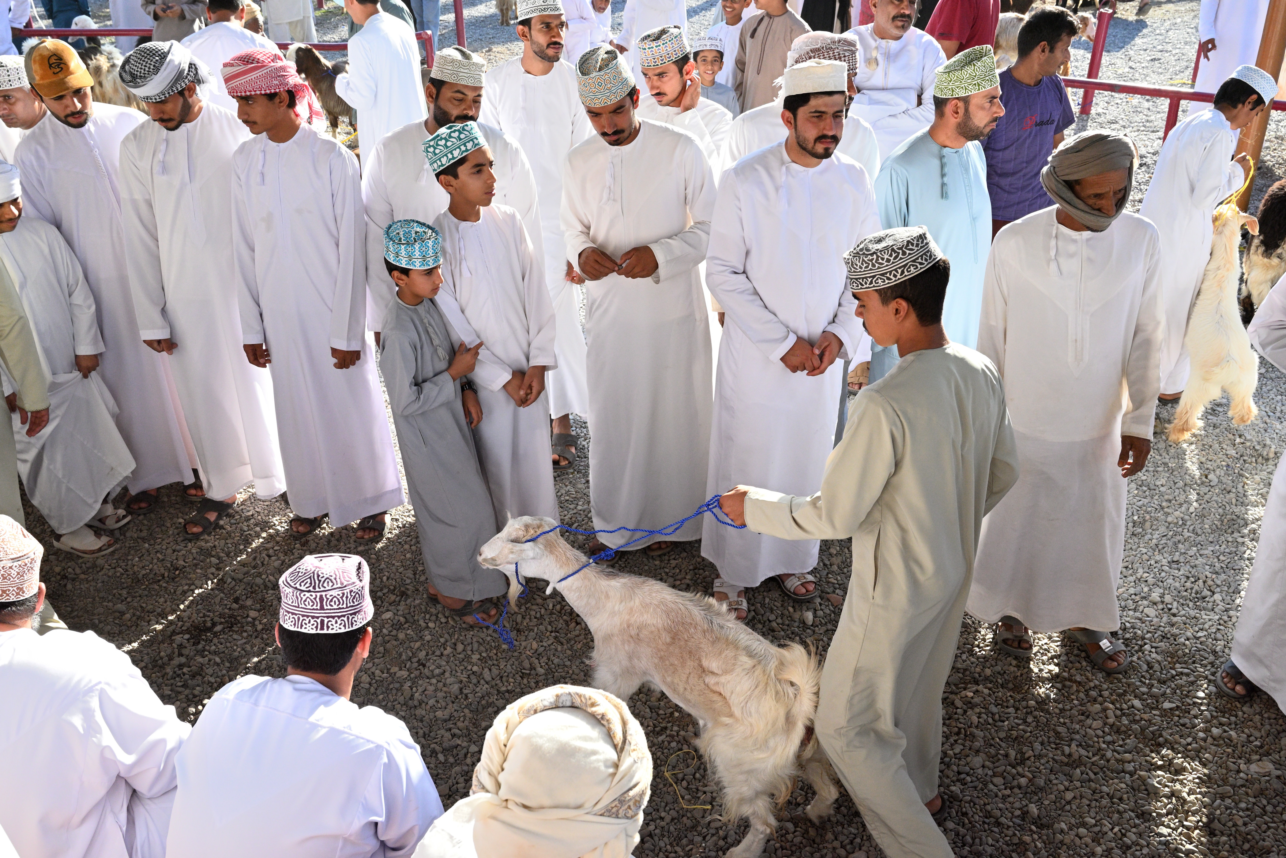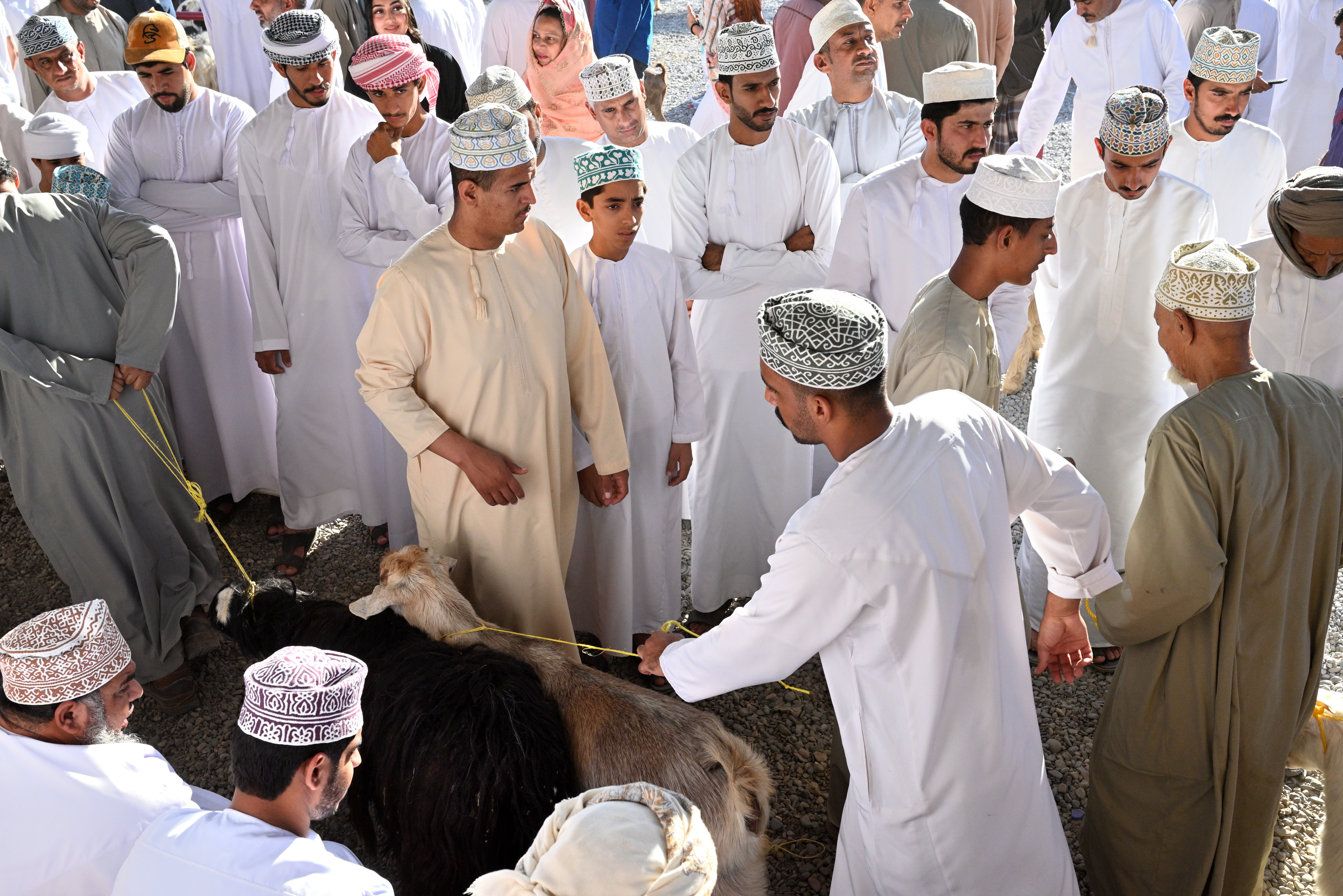 Heute erwartet uns ein ganz besonderes Erlebnis: der traditionelle Viehmarkt in Nizwa am Freitag. Schon in den frühen Morgenstunden füllt sich der Platz mit Bauern und Händlern aus der gesamten Region. Es herrscht ein quirliges Durcheinander, während Ziegen und Kühe in einem Kreis vorgeführt und lautstark versteigert werden. Die Tiere meckern und muhen, Gebote werden gerufen, und die Menge schart sich eng um die Verkäufer - ein lebendiges Spektakel, das chaotisch wirkt aber perfekt organisiert ist.