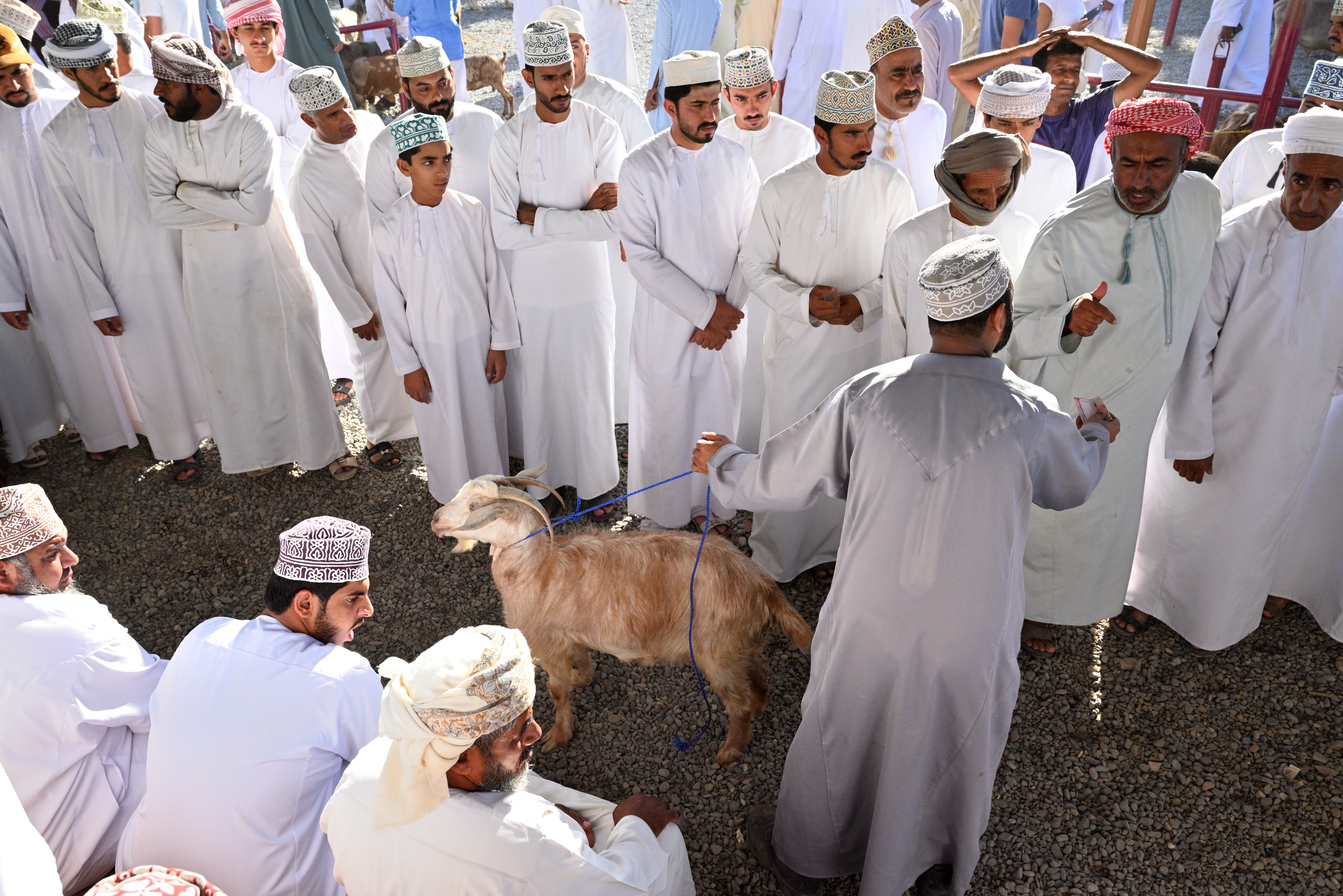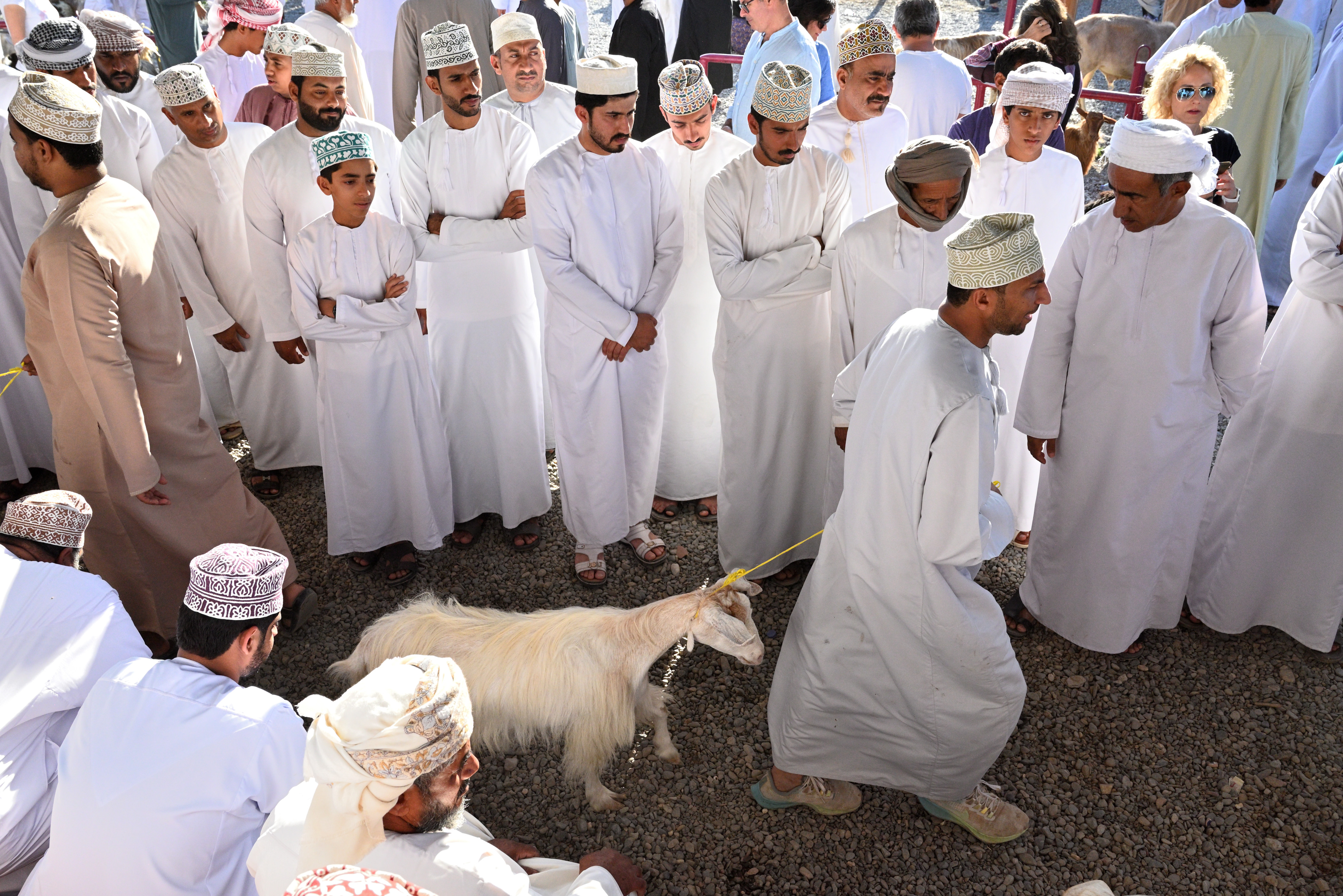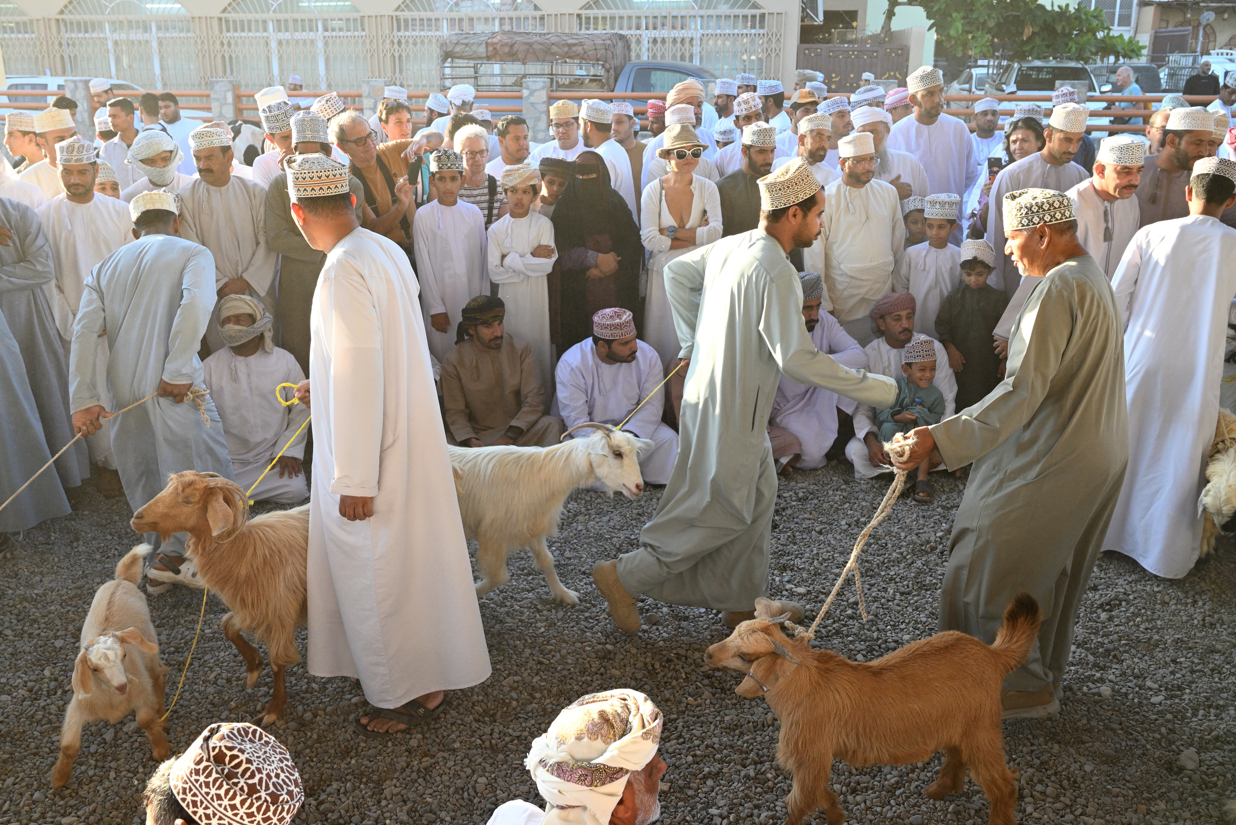 Heute erwartet uns ein ganz besonderes Erlebnis: der traditionelle Viehmarkt in Nizwa am Freitag. Schon in den frühen Morgenstunden füllt sich der Platz mit Bauern und Händlern aus der gesamten Region. Es herrscht ein quirliges Durcheinander, während Ziegen und Kühe in einem Kreis vorgeführt und lautstark versteigert werden. Die Tiere meckern und muhen, Gebote werden gerufen, und die Menge schart sich eng um die Verkäufer - ein lebendiges Spektakel, das chaotisch wirkt aber perfekt organisiert ist.
