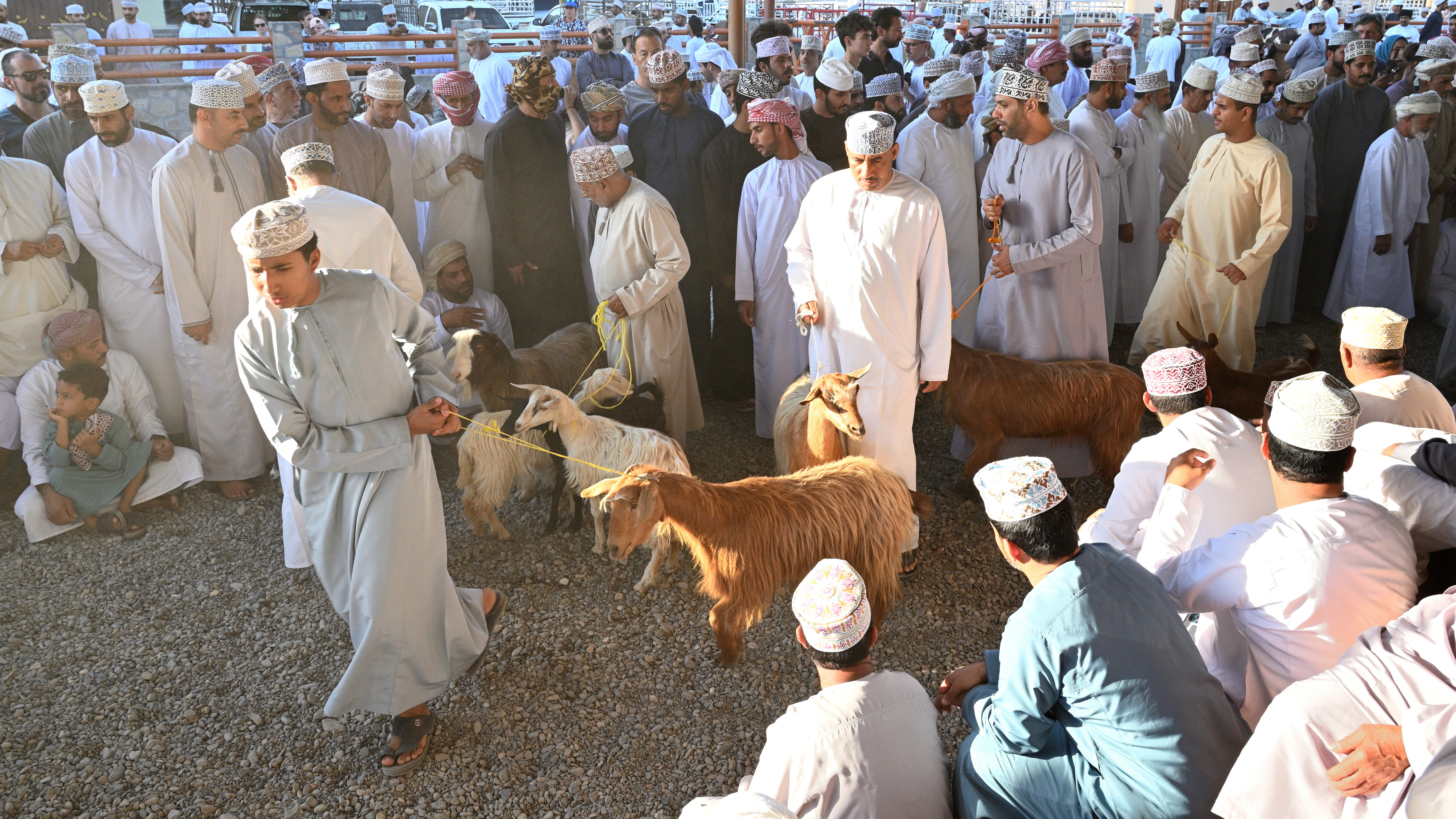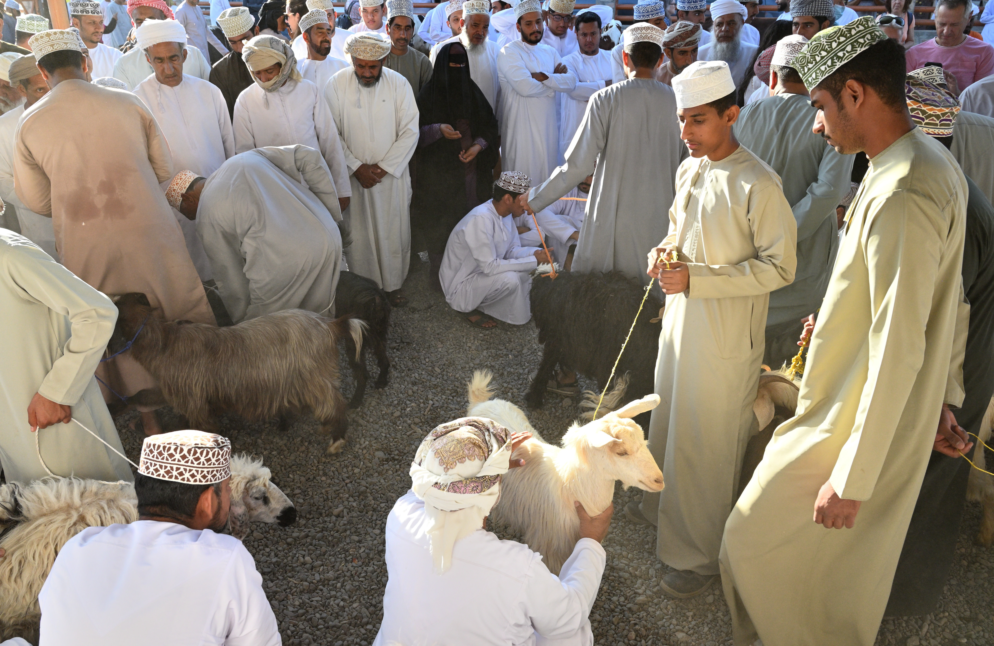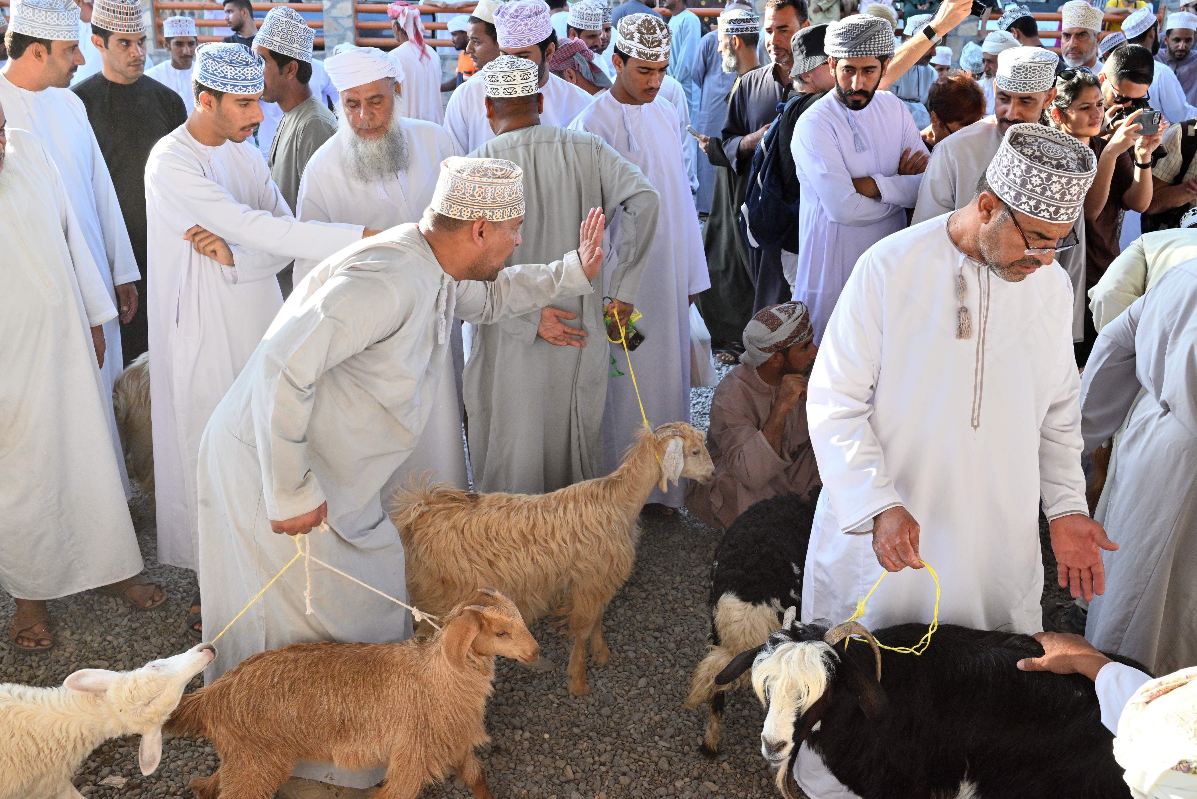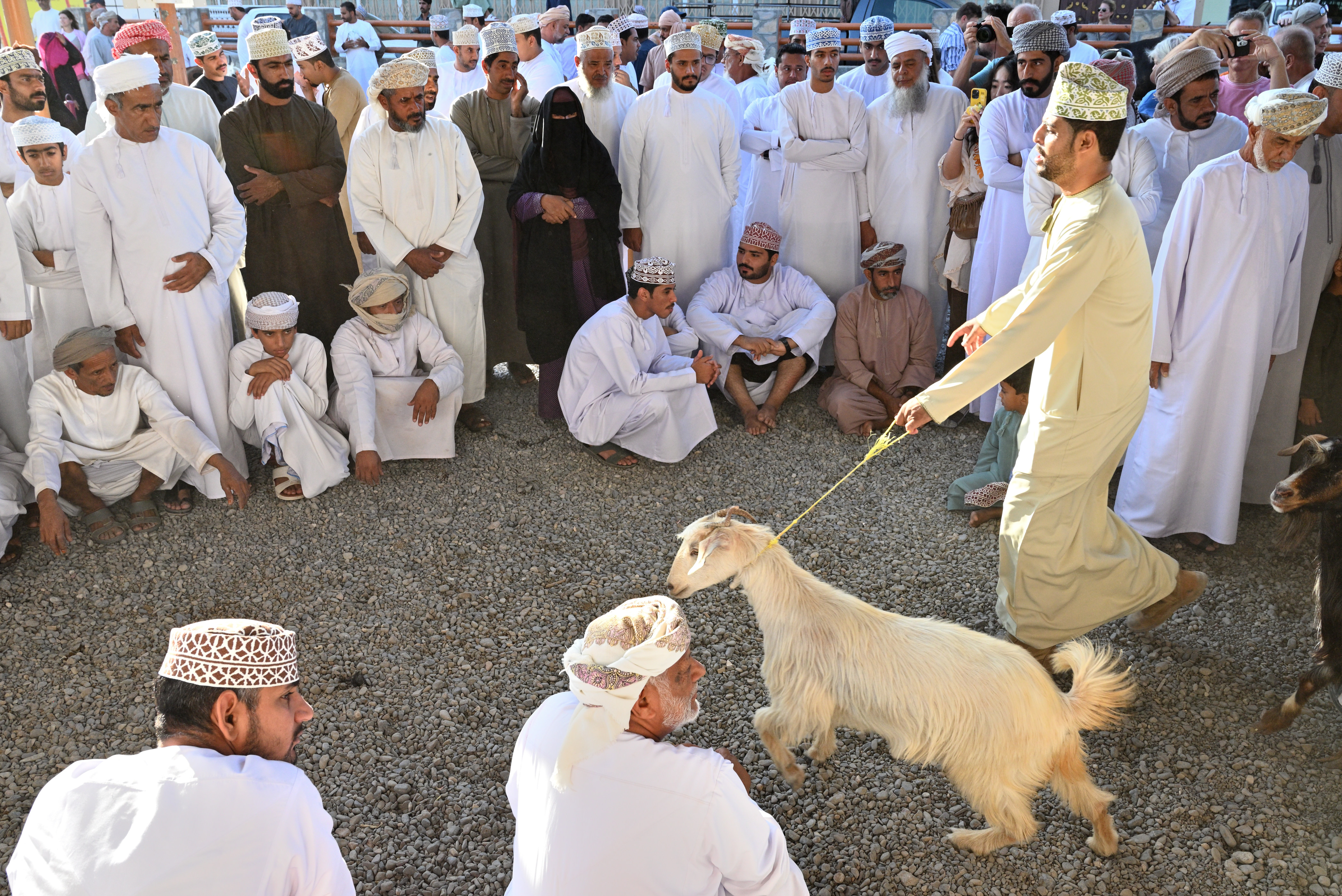 Heute erwartet uns ein ganz besonderes Erlebnis: der traditionelle Viehmarkt in Nizwa am Freitag. Schon in den frühen Morgenstunden füllt sich der Platz mit Bauern und Händlern aus der gesamten Region. Es herrscht ein quirliges Durcheinander, während Ziegen und Kühe in einem Kreis vorgeführt und lautstark versteigert werden. Die Tiere meckern und muhen, Gebote werden gerufen, und die Menge schart sich eng um die Verkäufer - ein lebendiges Spektakel, das chaotisch wirkt aber perfekt organisiert ist.