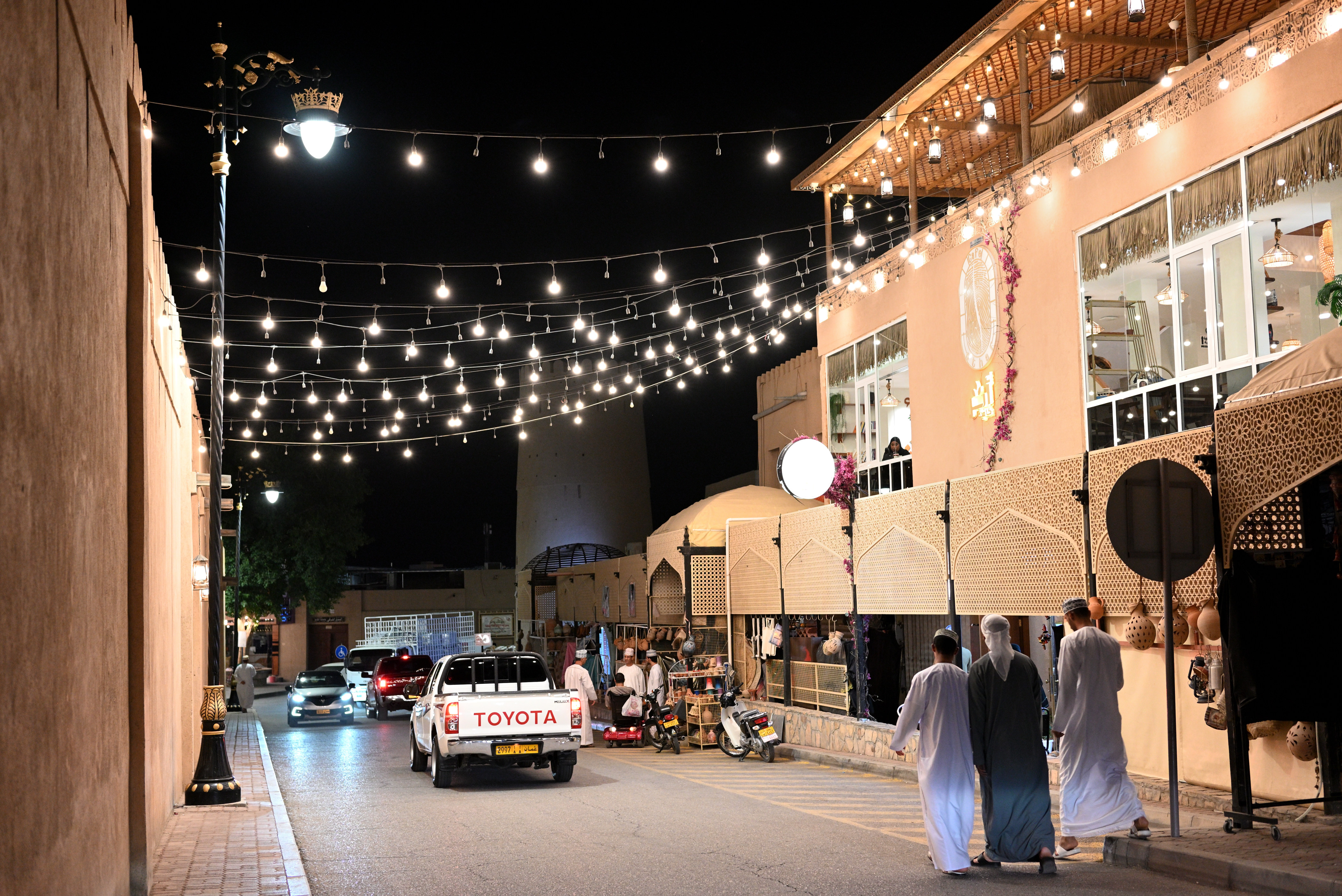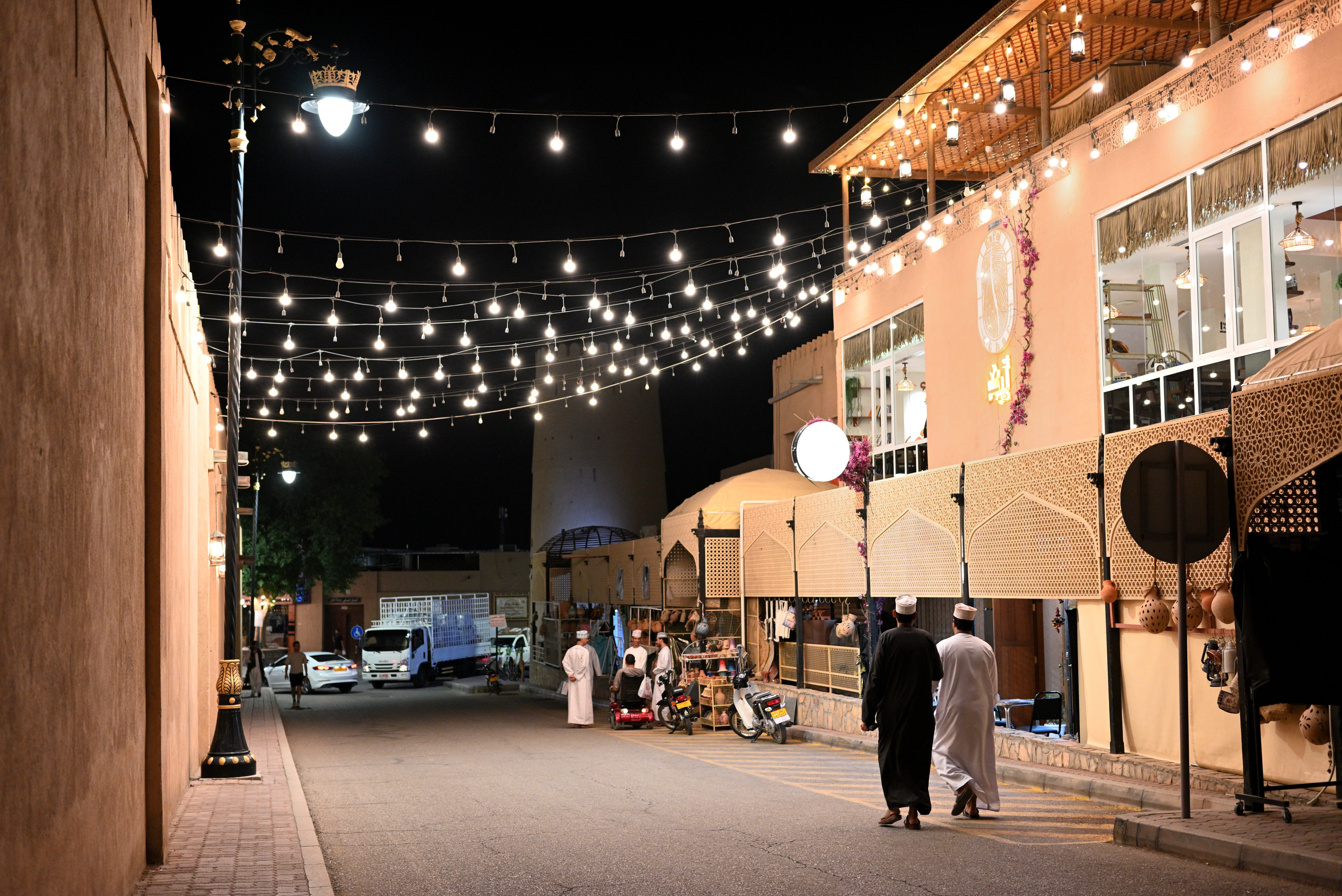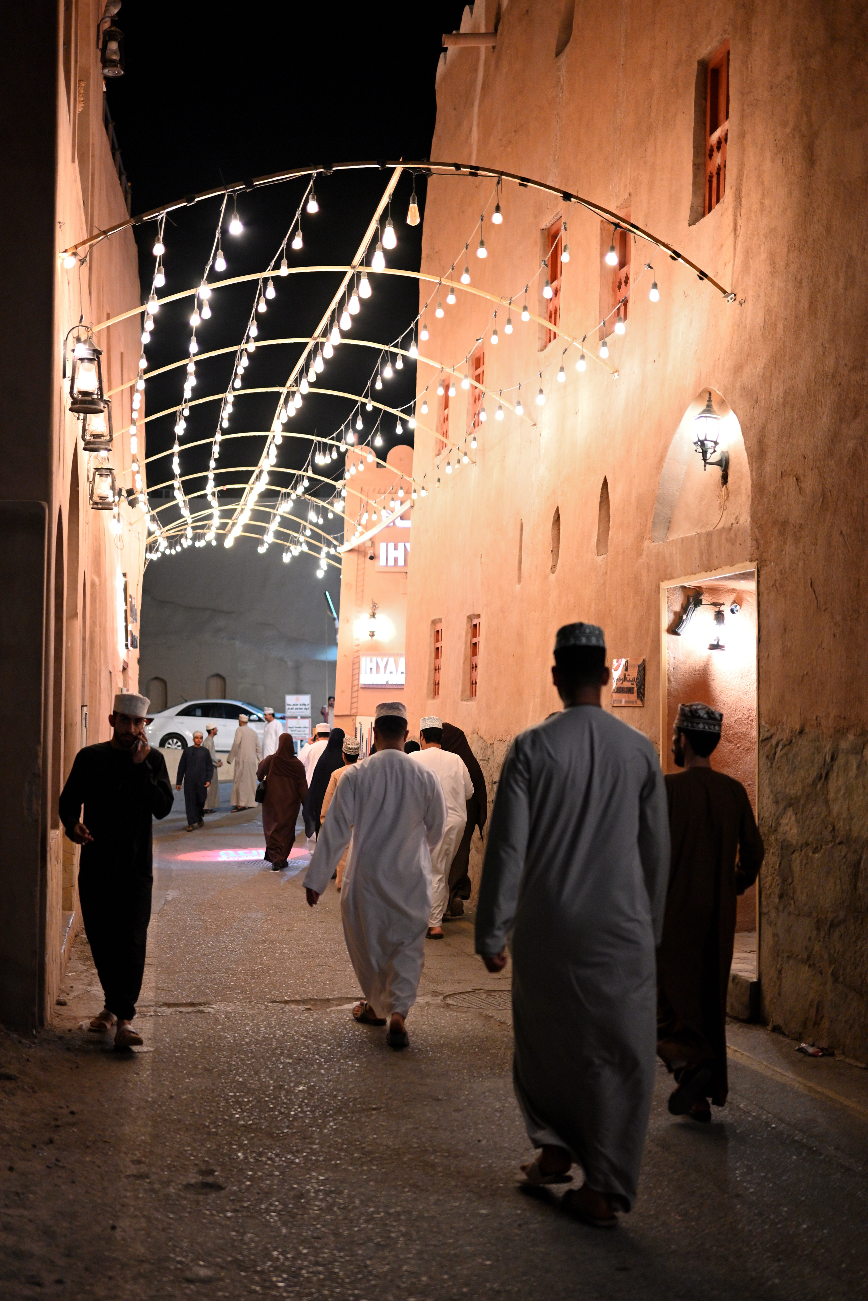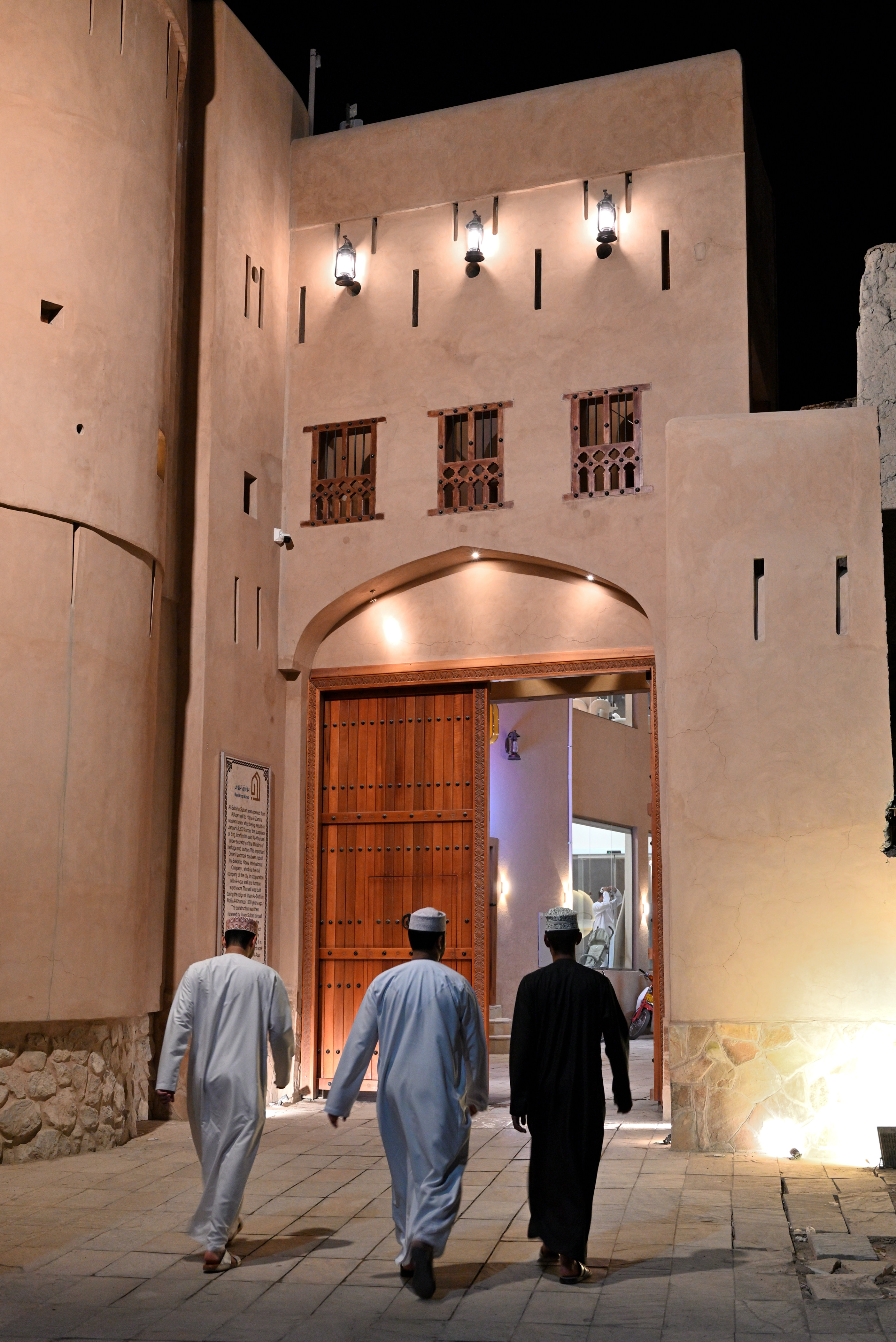 Nach diesem intensiven Markterlebnis besichtigen wir das imposante Nizwa Fort. Die dicken Mauern und die Aussichtstürme versetzen uns zurück in vergangene Zeiten. Plötzlich erklingt Musik und Männer führen einen traditionellen omanischen Tanz auf, während Kinder ausgelassen dazu spielen. Die Atmosphäre ist magisch - wie aus den Geschichten von 1001 Nacht. Nach dem Abendessen schlendern wir durch die Altstadt, wo die Männer in ihren eleganten Dishdashas und farbenfroh bestickten Kofias umhergehen. Das lebendige Treiben und die Lichter lassen uns den Tag mit einem warmen Gefühl ausklingen. Wir sind wahrhaftig im Orient angekommen.