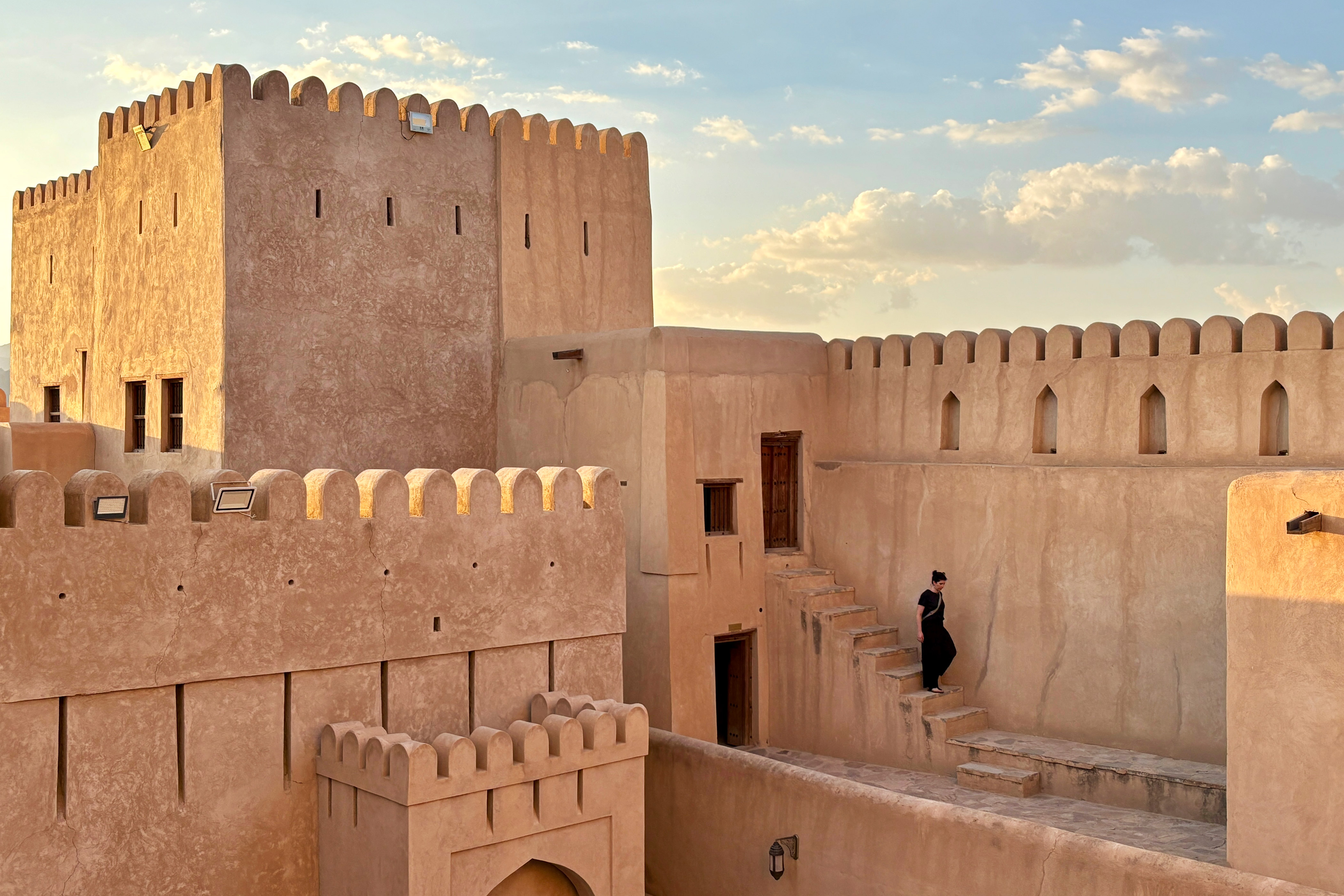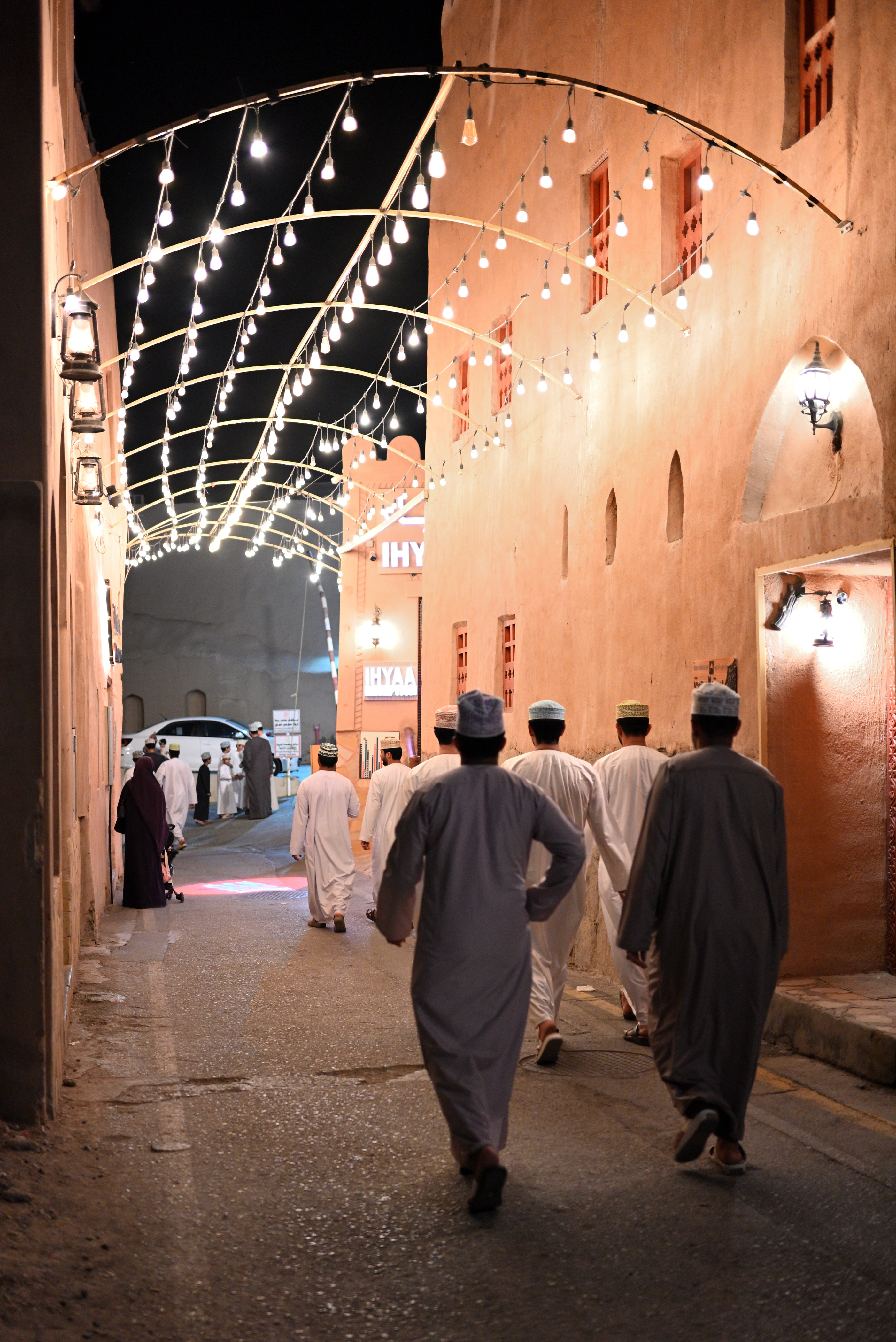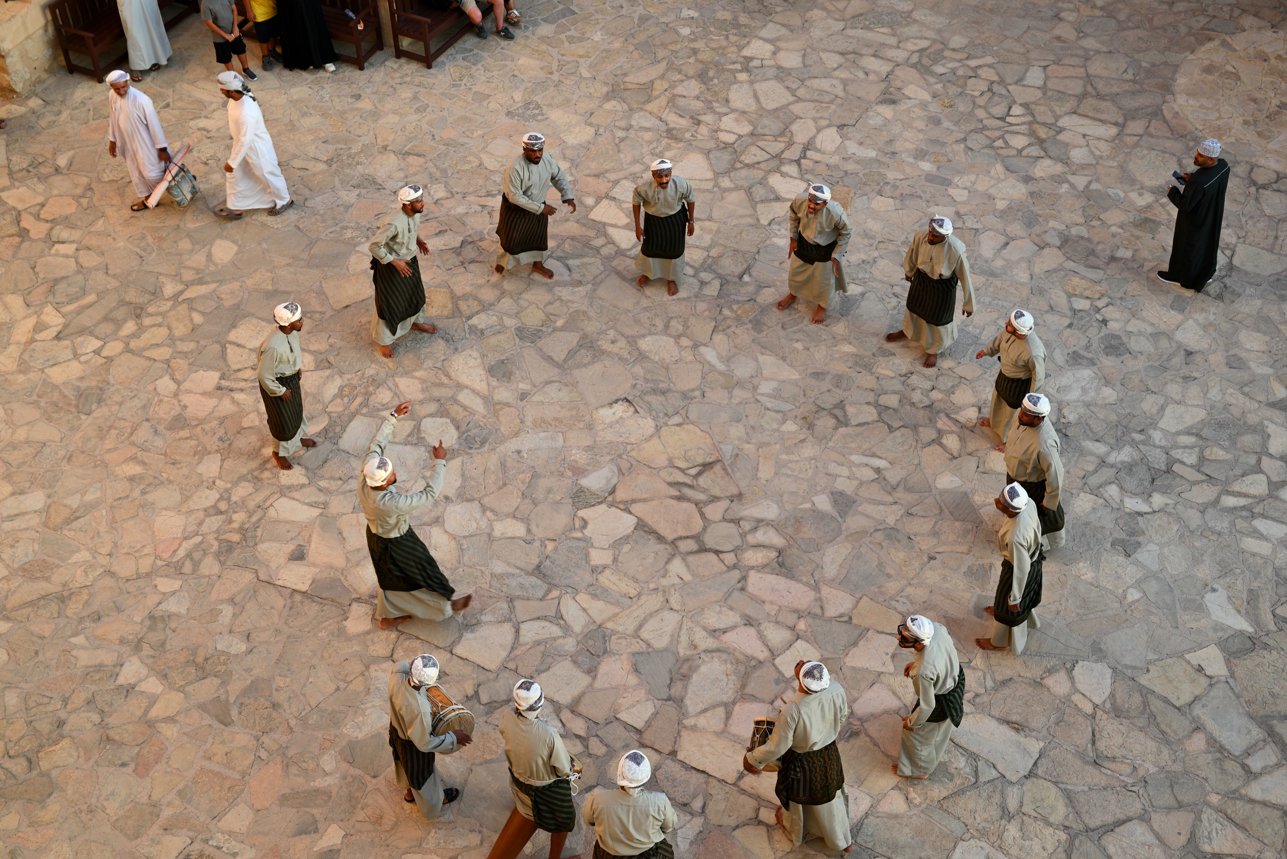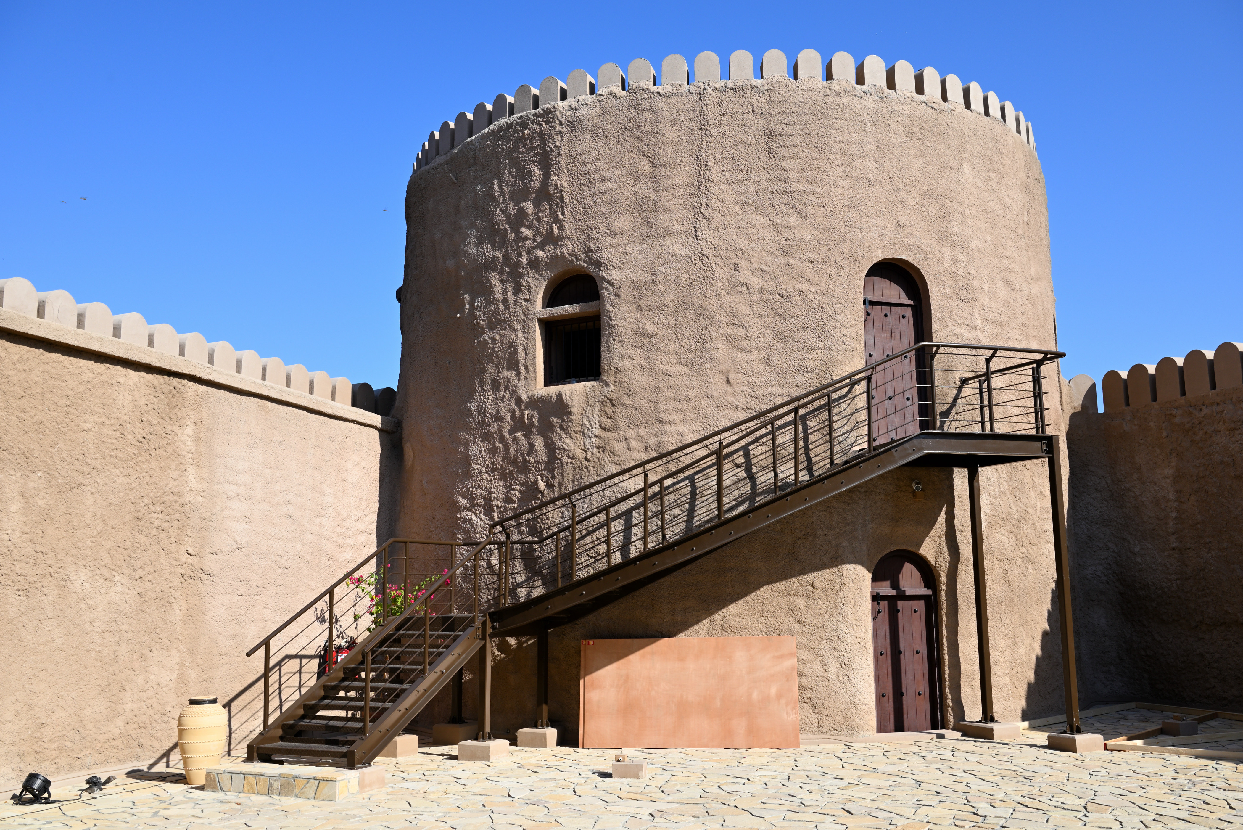 Nach diesem intensiven Markterlebnis besichtigen wir das imposante Nizwa Fort. Die dicken Mauern und die Aussichtstürme versetzen uns zurück in vergangene Zeiten. Plötzlich erklingt Musik und Männer führen einen traditionellen omanischen Tanz auf, während Kinder ausgelassen dazu spielen. Die Atmosphäre ist magisch - wie aus den Geschichten von 1001 Nacht. Nach dem Abendessen schlendern wir durch die Altstadt, wo die Männer in ihren eleganten Dishdashas und farbenfroh bestickten Kofias umhergehen. Das lebendige Treiben und die Lichter lassen uns den Tag mit einem warmen Gefühl ausklingen. Wir sind wahrhaftig im Orient angekommen.