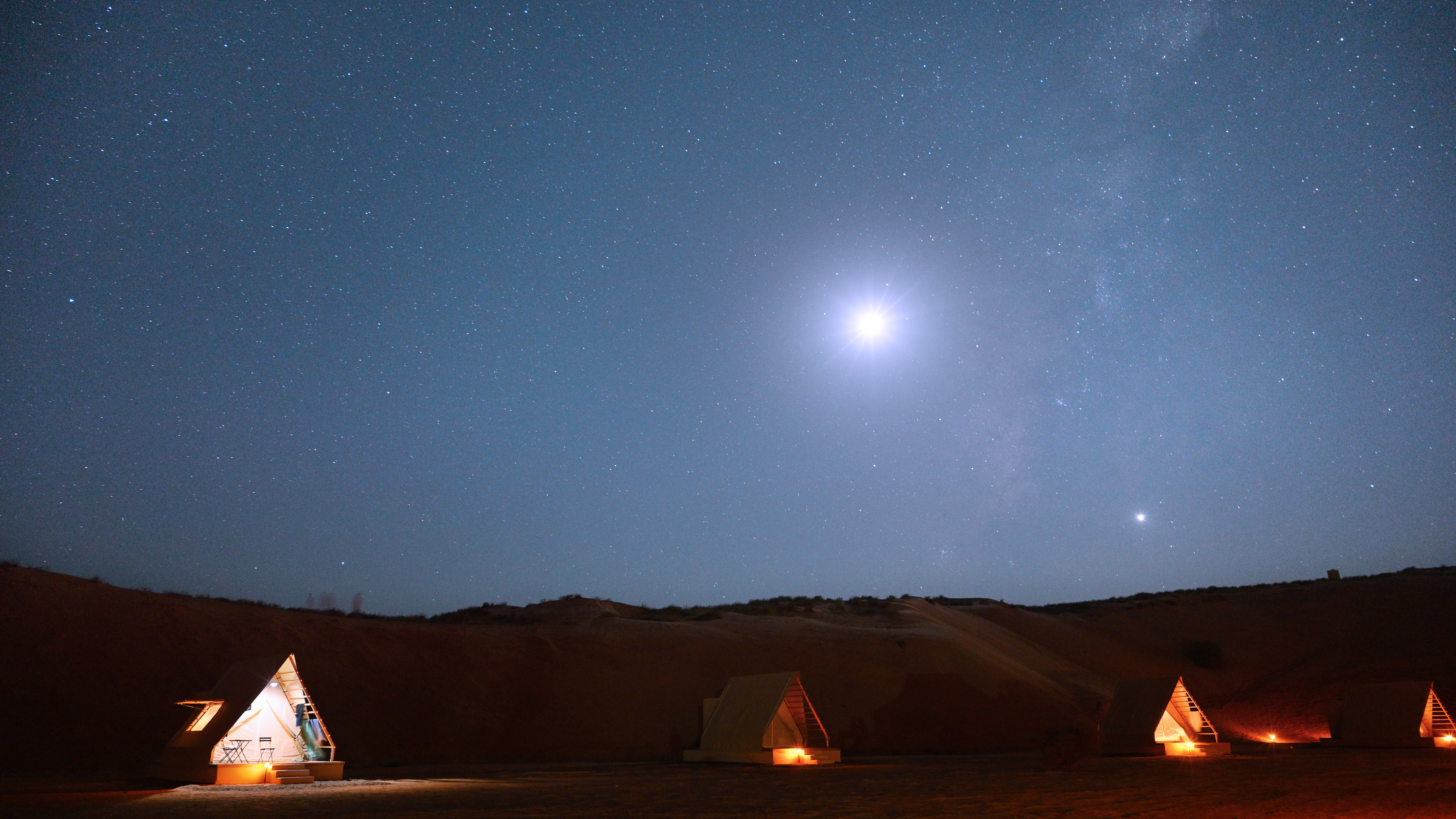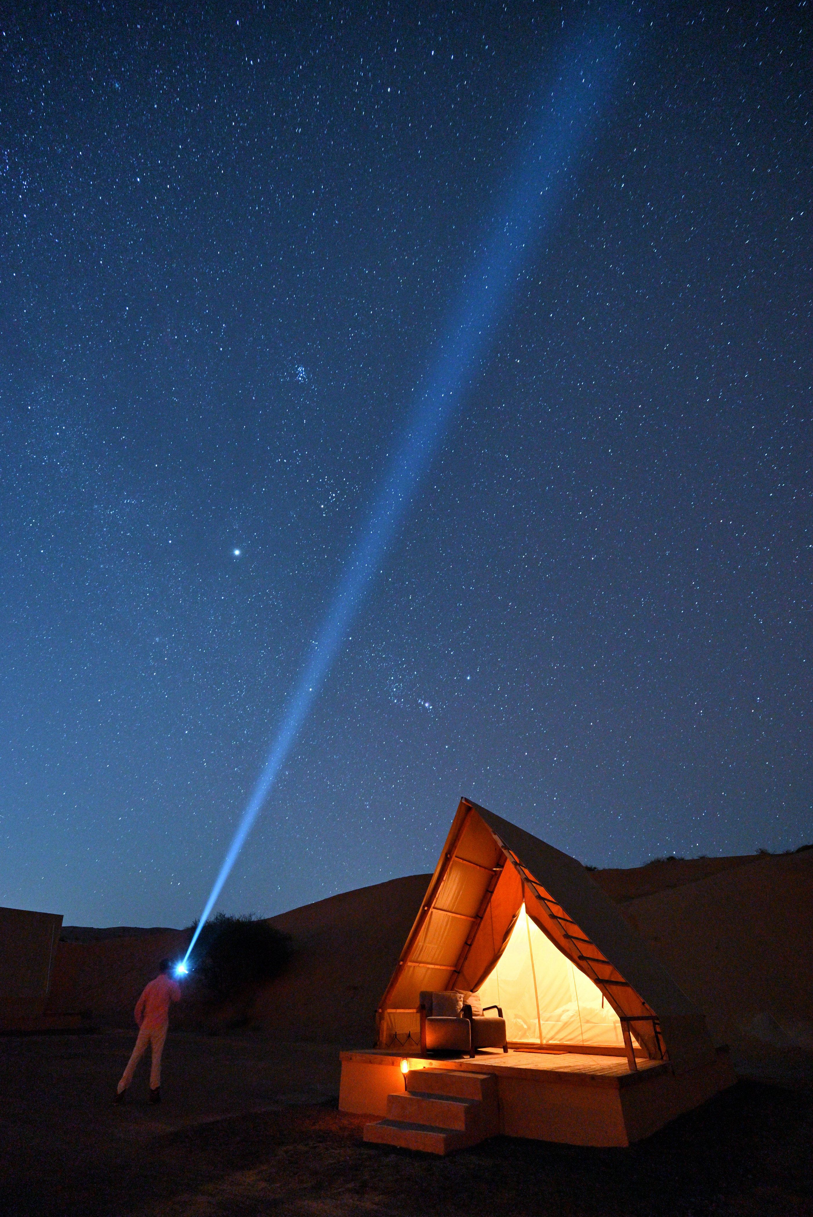 Zum Sonnenuntergang fahren wir gemeinsam mit anderen Gästen auf eine hohe Düne. Der Blick über die endlose Wüstelandschaft im sanften Licht des Abends ist schlichtweg spektakulär. Zurück im Camp genießen wir ein traditionelles Beduinenessen, das auf heißen Steinen zubereitet wird: zartes Kamelfleisch und ein süßer Nachtisch aus Brot, Kamelmilch und Dattelhonig lassen uns die Aromen der Wüste schmecken. Alles bio aus eigenem Anbau oder Zucht, wie uns die Inhaber erzählen. Der Abend endet mit einem Blick in den Sternenhimmel, der über uns wie ein Diamantenteppich funkelt. Die Milchstraße zieht sich wie ein leuchtendes Band durch die Dunkelheit, und wir fühlen uns klein und gleichzeitig verbunden mit dieser unendlichen Weite. Unser luxuriöses Glamping-Zelt mit komfortablem Bett und eigenem Badezimmer bietet uns eine perfekte Mischung aus Abenteuer und Komfort. Dennoch erleben wir im Camp das Traditionelle - genau das, was uns neben dem Komfort bei der Wahl dieses Camps wichtig war. Mit den Geräuschen der Wüste im Hintergrund schlafen wir in aller Ruhe unter einem Himmel voller Sterne ein.