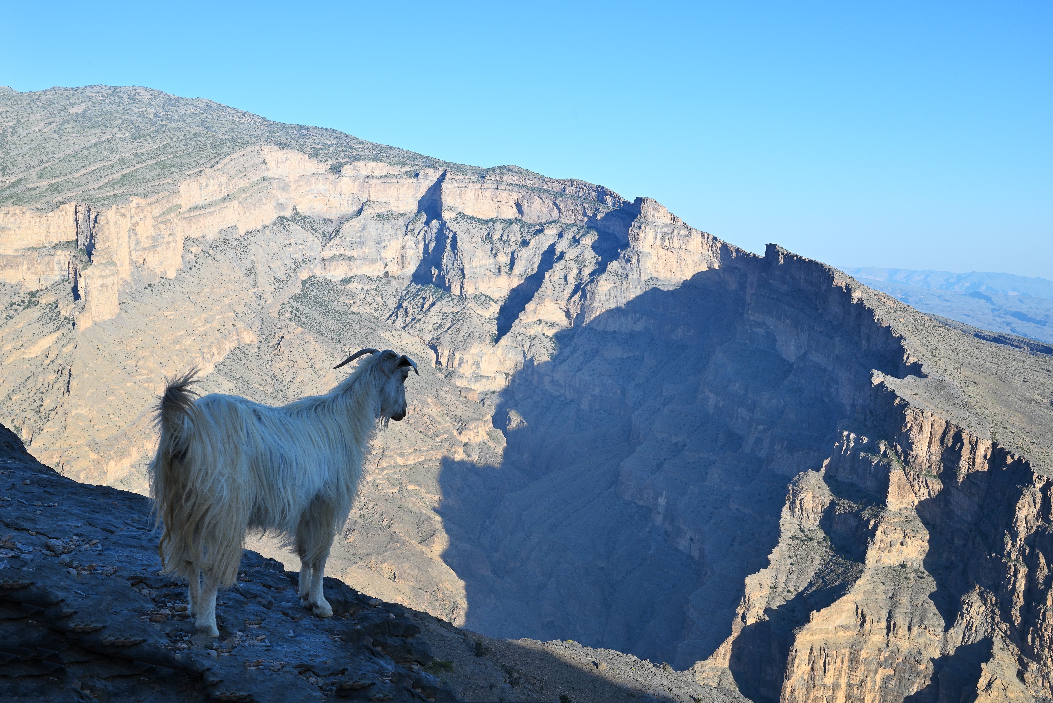 Der Tag beginnt mit einem unvergesslichen Sonnenaufgang am Rand des Jebel Shams Canyons. Die ersten Strahlen brechen über die schroffen Felswände, tauchen die Landschaft in ein leuchtendes Gold und lassen uns ehrfürchtig schweigen. Neben einigen Ziegen sind an diesem frühen Morgen auch schon die Camper erwacht, die am Rande des Canyon ihr Nachtquartier aufgeschlagen haben.