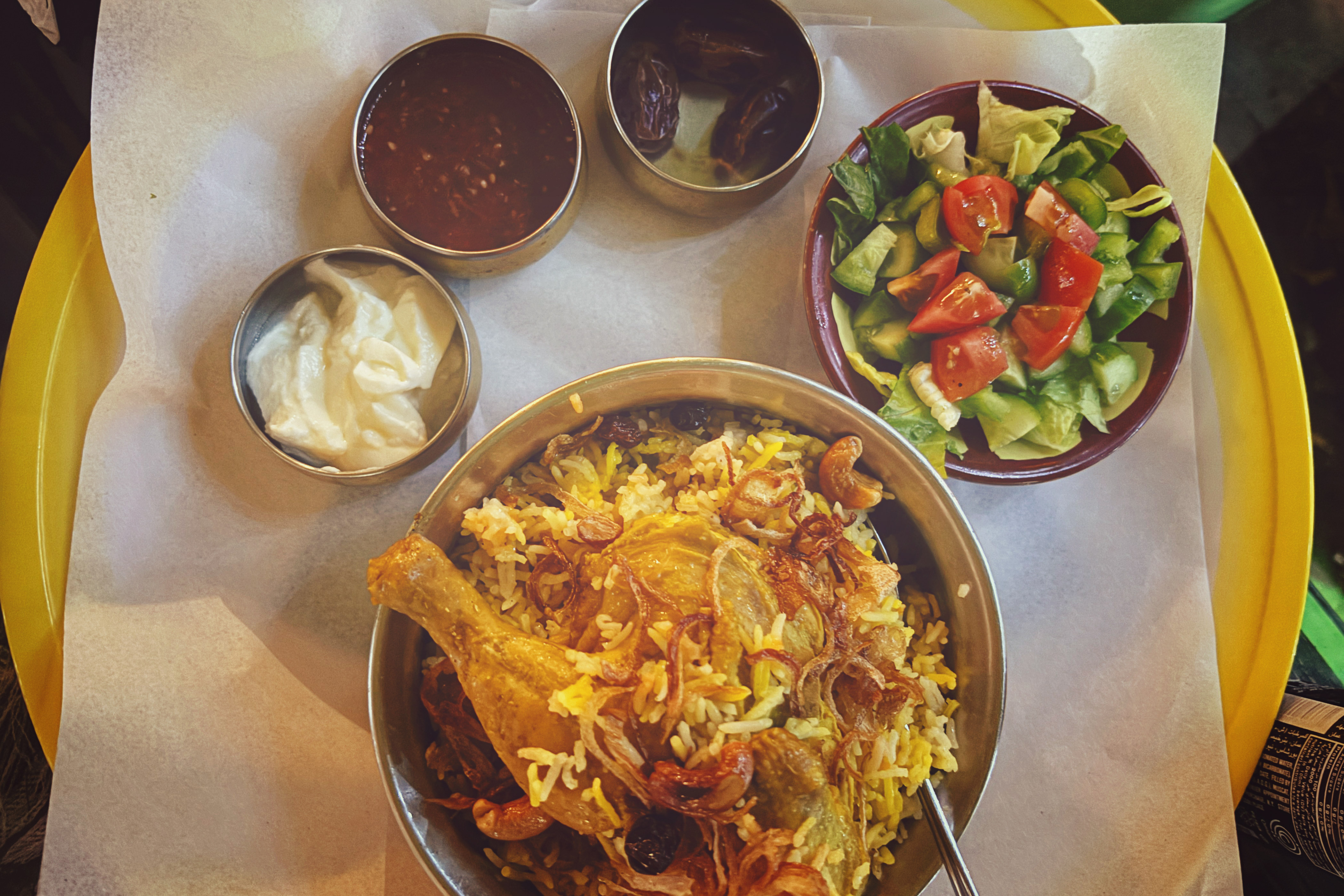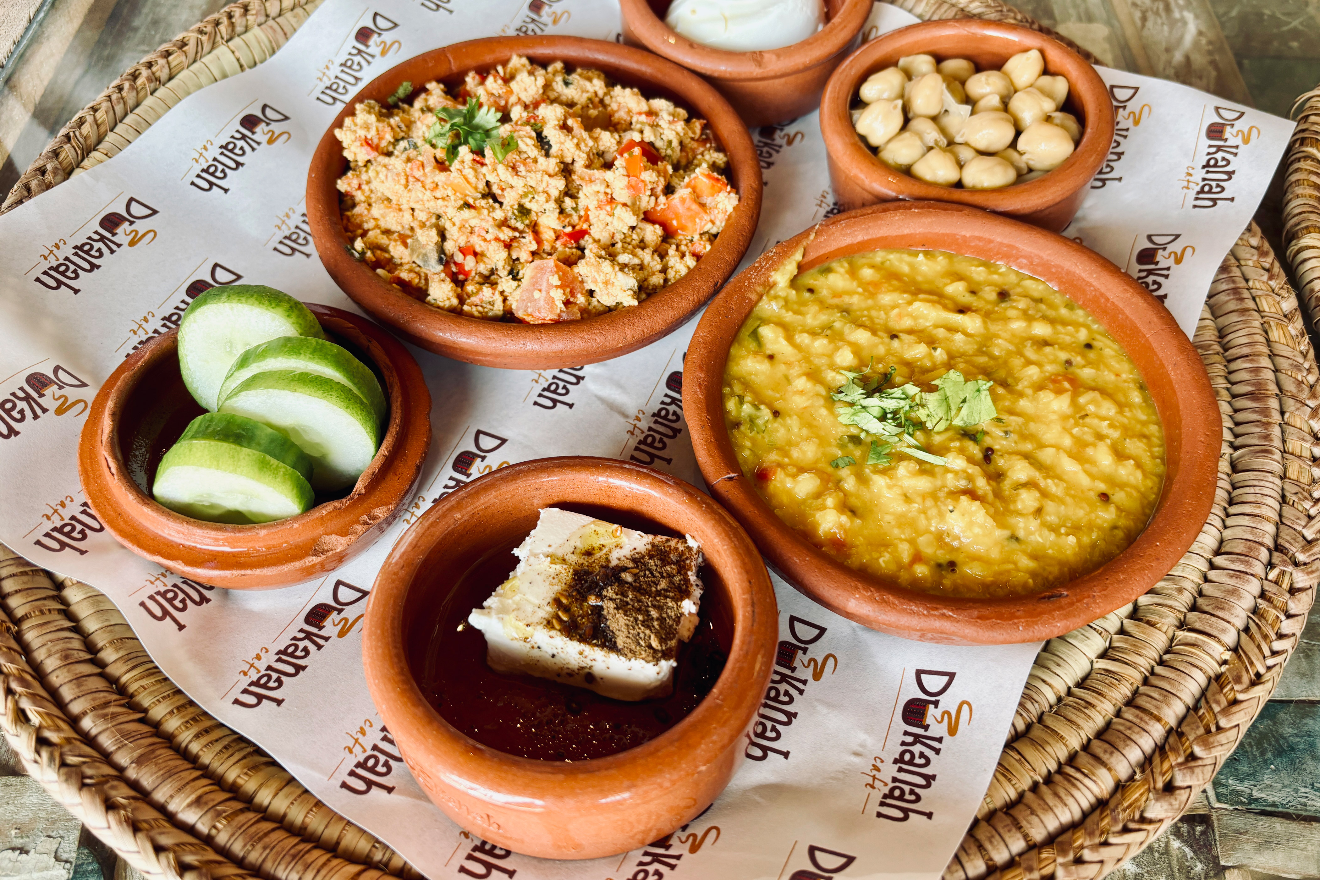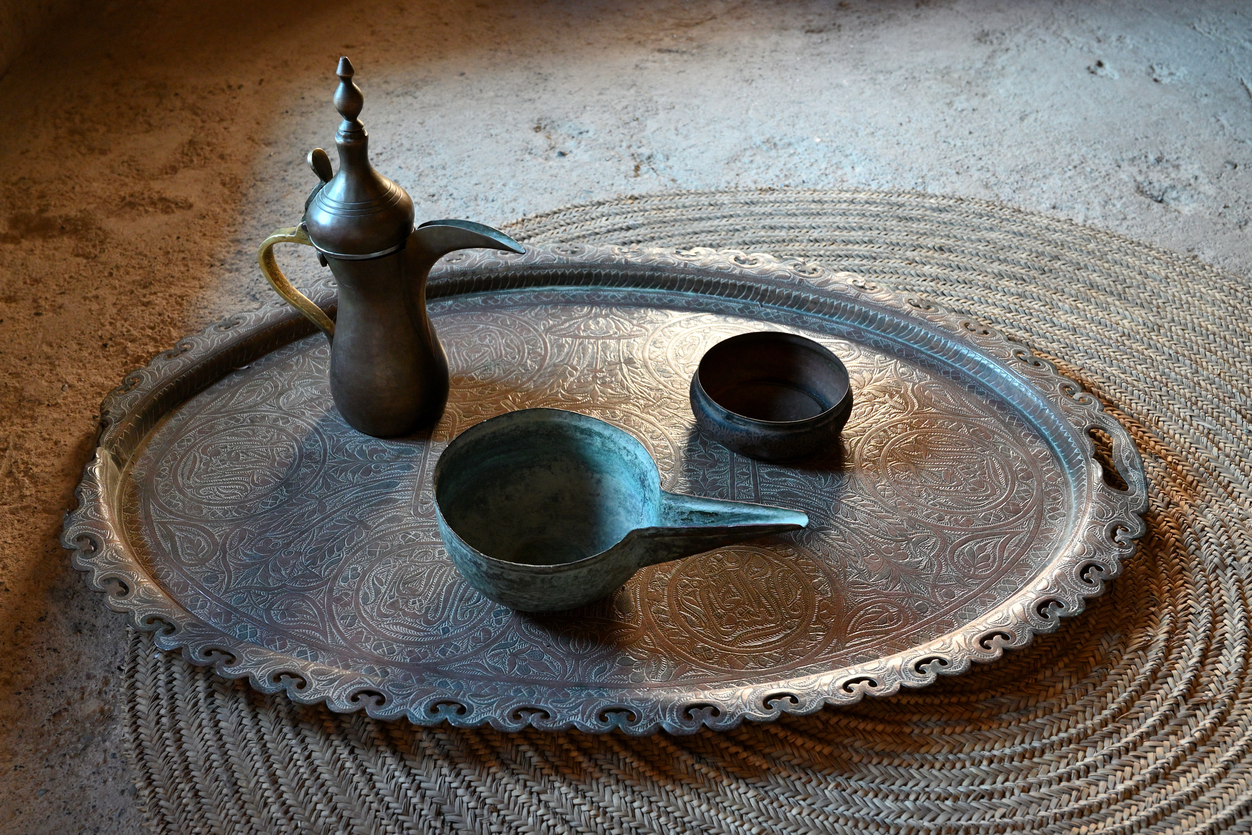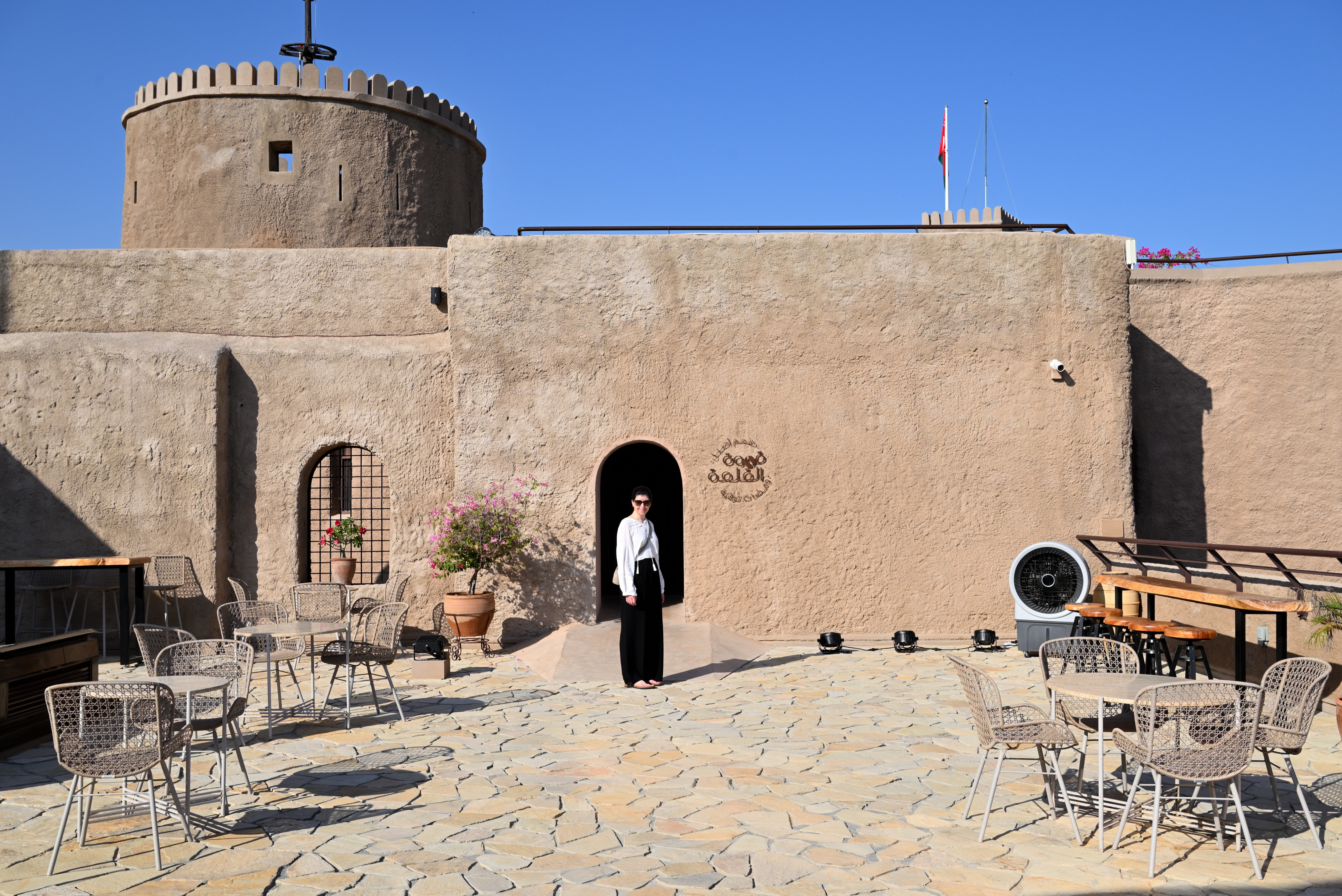 Nach diesem royalen Moment kehren wir zurück nach Maskat, um ein traditionelles omanisches Frühstück im Dukanah Cafe zu genießen. Der Duft von Khubz Omani und süßem Karak Tea füllt die Luft, während wir uns durch eine köstliche Auswahl an Speisen probieren. Es gibt Schakschuka, Linsen Dal, Ziegenkäse, Honig, Kichererbsen, Oliven, Gurken und frische Datteln.