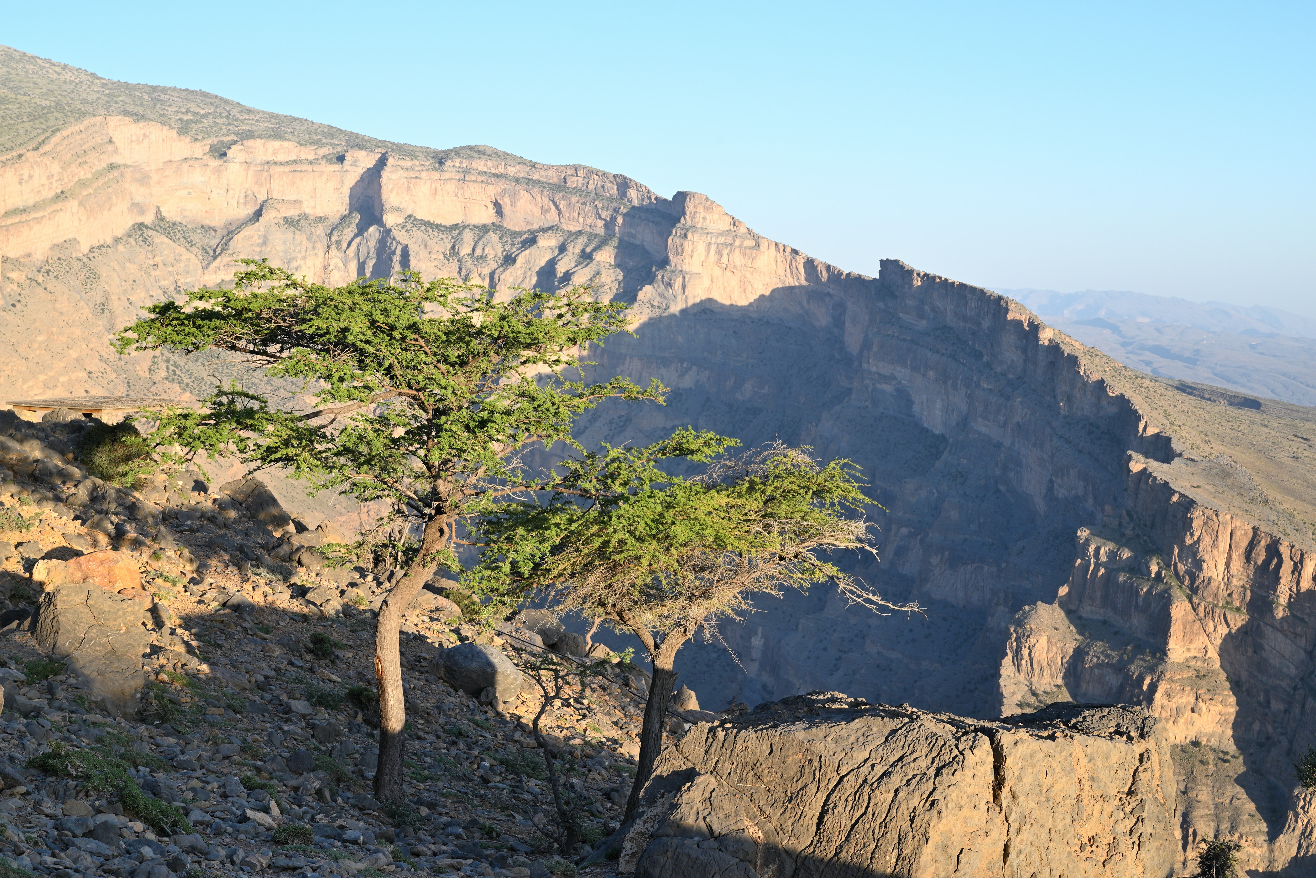 Am sechsten Tag verabschieden wir uns mit Wehmut von unserem lieb gewonnenen Nizwa und brechen auf zu einem weiteren Highlight unserer Reise: dem Jebel Shams. Unterwegs halten wir in Tanuf, wo wir durch ein Ruinenviertel schlendern und in den Wadi Tanuf eintauchen. Eine Stelle im Canyon raubt uns den Atem - das Sonnenlicht fällt schräg zwischen die Felswände und taucht die Bäume in ein goldenes Leuchten. Die Fahrt ins Wadi ist nicht ganz ohne Herausforderungen: Der tiefe Kies bringt unser Fahrzeug ins Schlingern, und unsere Herzen (zumindest die der Beifahrer ;-)) rutschen uns fast in die Hose, immer in Sorge Steckenbleiben zu können. Aber alles halb so wild und dafür ein einmaliges Erlebnis!
