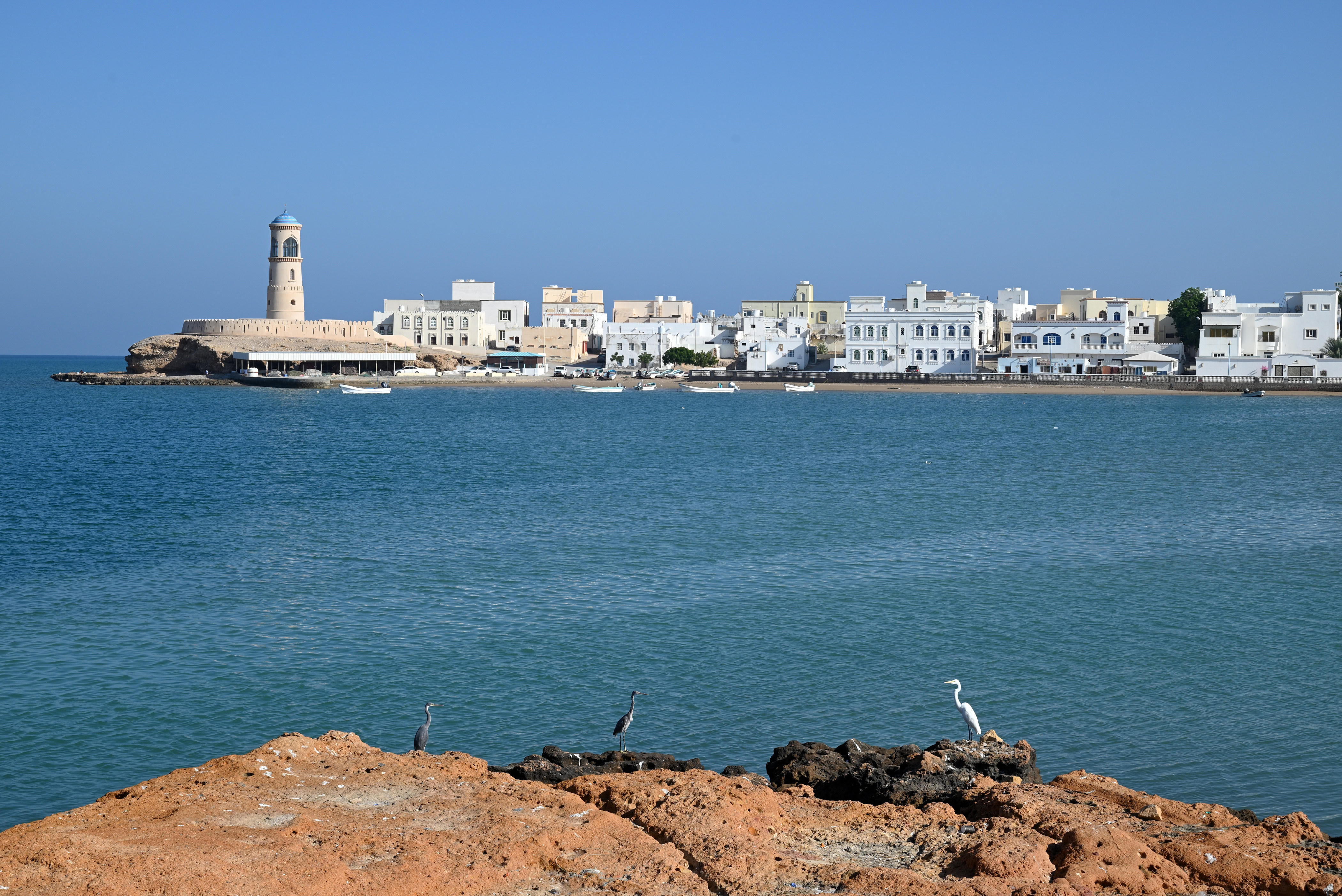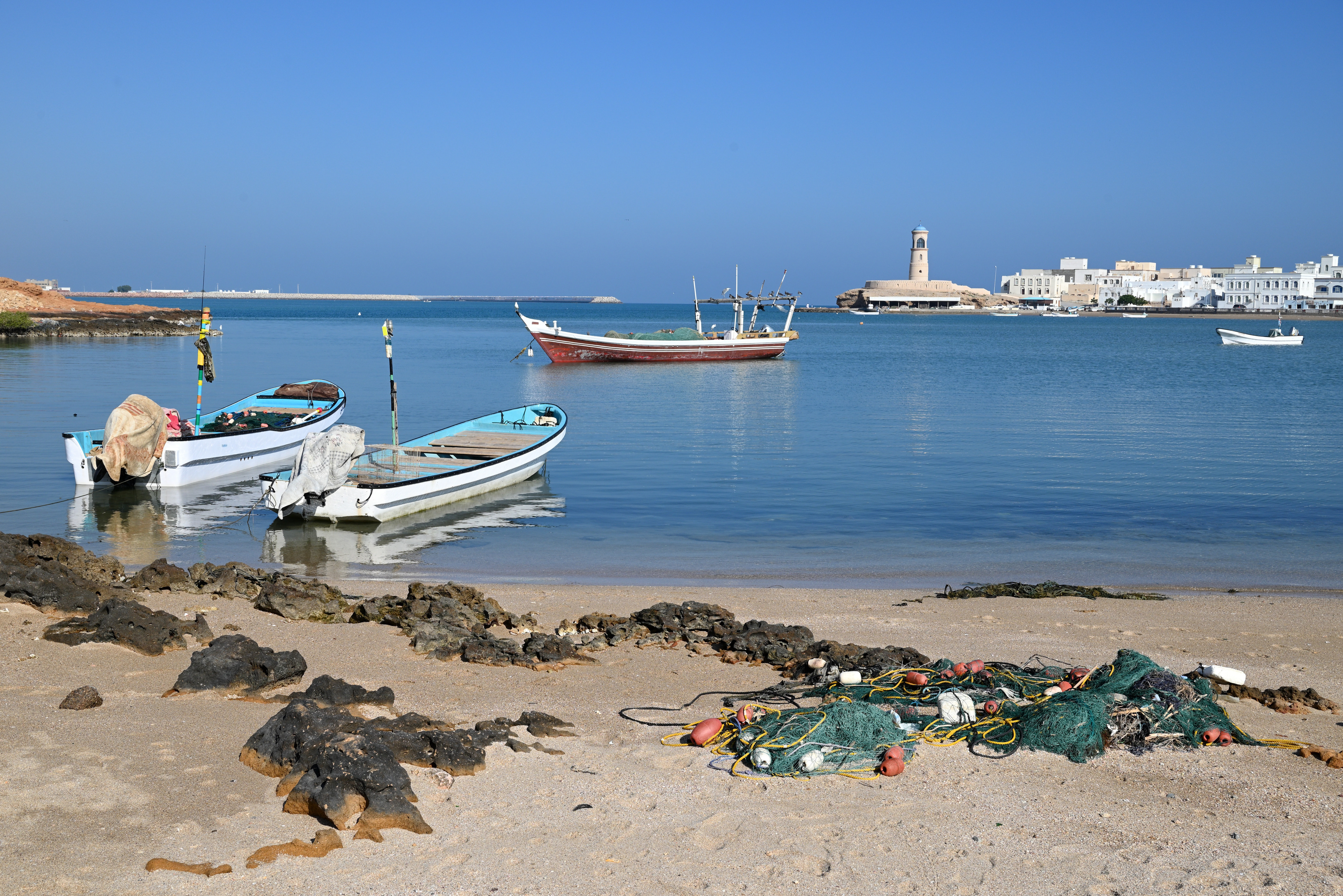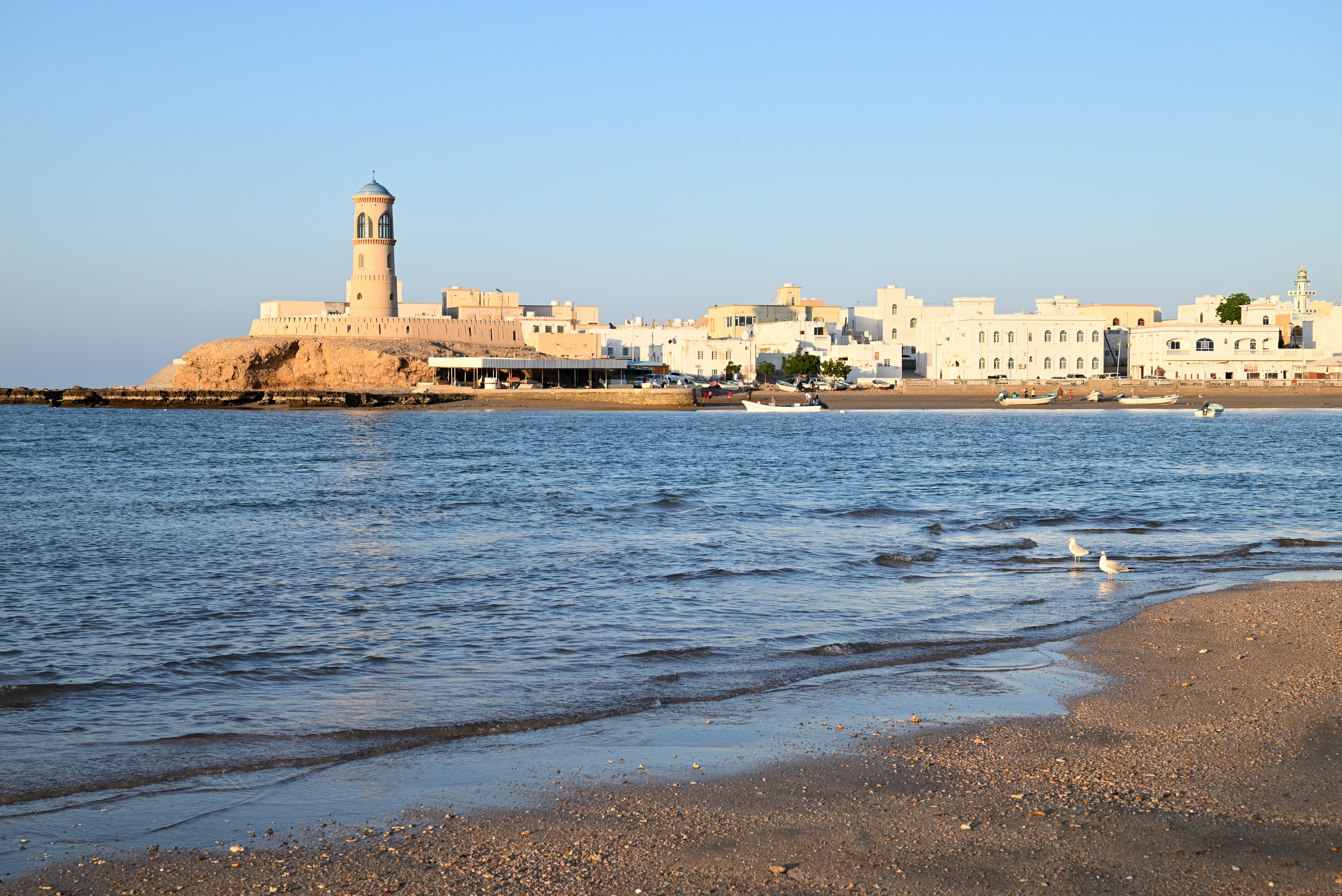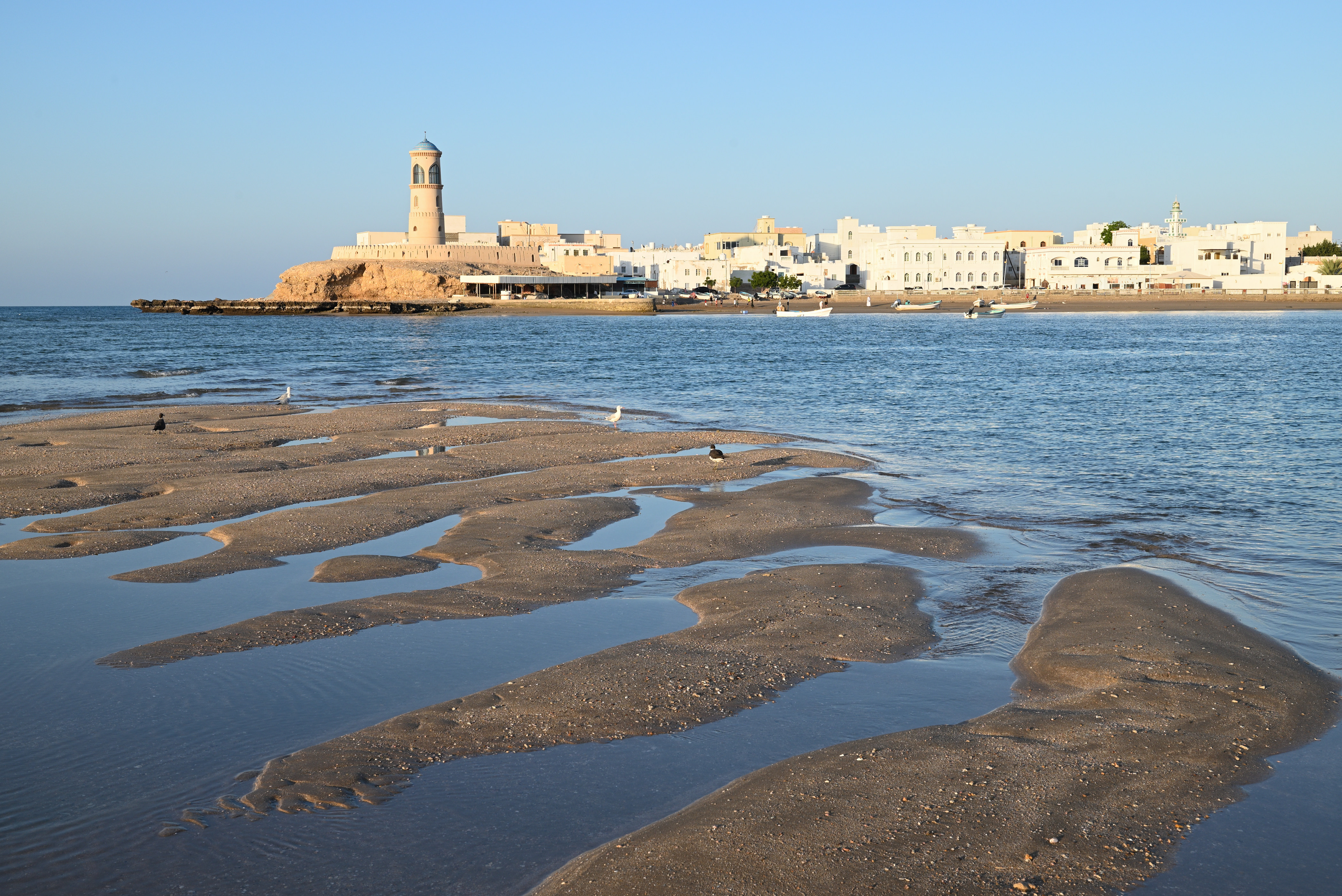 In Sur angekommen, checken wir in unser Hotel ein und stärken uns in einem kleinen Restaurant nebenan. Der starke türkische Kaffee, der traditionell mit dem Kaffeesatz in der Tasse serviert wird, weckt uns wieder auf und gibt uns neue Energie. Am Nachmittag besuchen wir die Dhau-Werft, wo wir den Handwerkern bei der Fertigung der klassischen Holzschiffe zuschauen. Es ist faszinierend zu sehen, wie hier jahrhundertealte Traditionen lebendig bleiben. Später spazieren wir am Strand entlang, der von der Silhouette des Leuchtturms und der sanft geschwungenen Bucht geprägt wird. Die Abendstimmung taucht die Stadt in ein warmes Licht, und die Meeresbrise sorgt für einen perfekten Abschluss des Tages.
