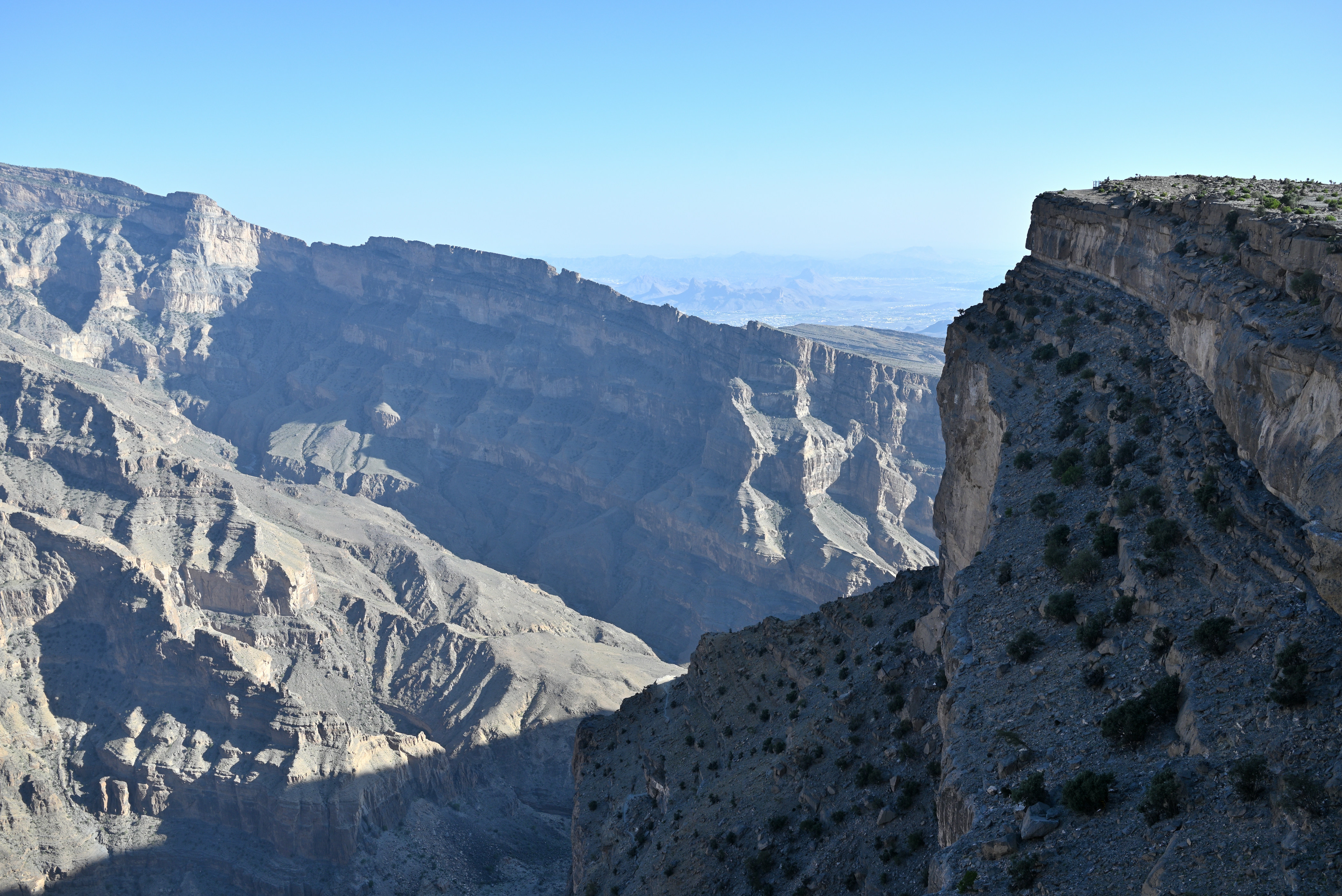 Nach diesem kleinen Abenteuer setzen wir unsere Fahrt fort. Die Straße auf die Hochebene ist zunächst gut ausgebaut, einige Kilometer wird sie zur Schotterpiste, zum Schluss hin dann aber wieder zu einer geteerten Straße. Diese reicht schließlich bis zum „Grand Canyon“ des Oman am Jebel Shams. Im Sama Heights Resort checken wir ein, bevor wir zu den vielen Aussichtspunkten fahren. Die tiefen Schluchten und die unendlichen Weiten des Wadi Ghul lassen uns staunend innehalten, während wir die Aussicht in einem kleinen Café genießen.