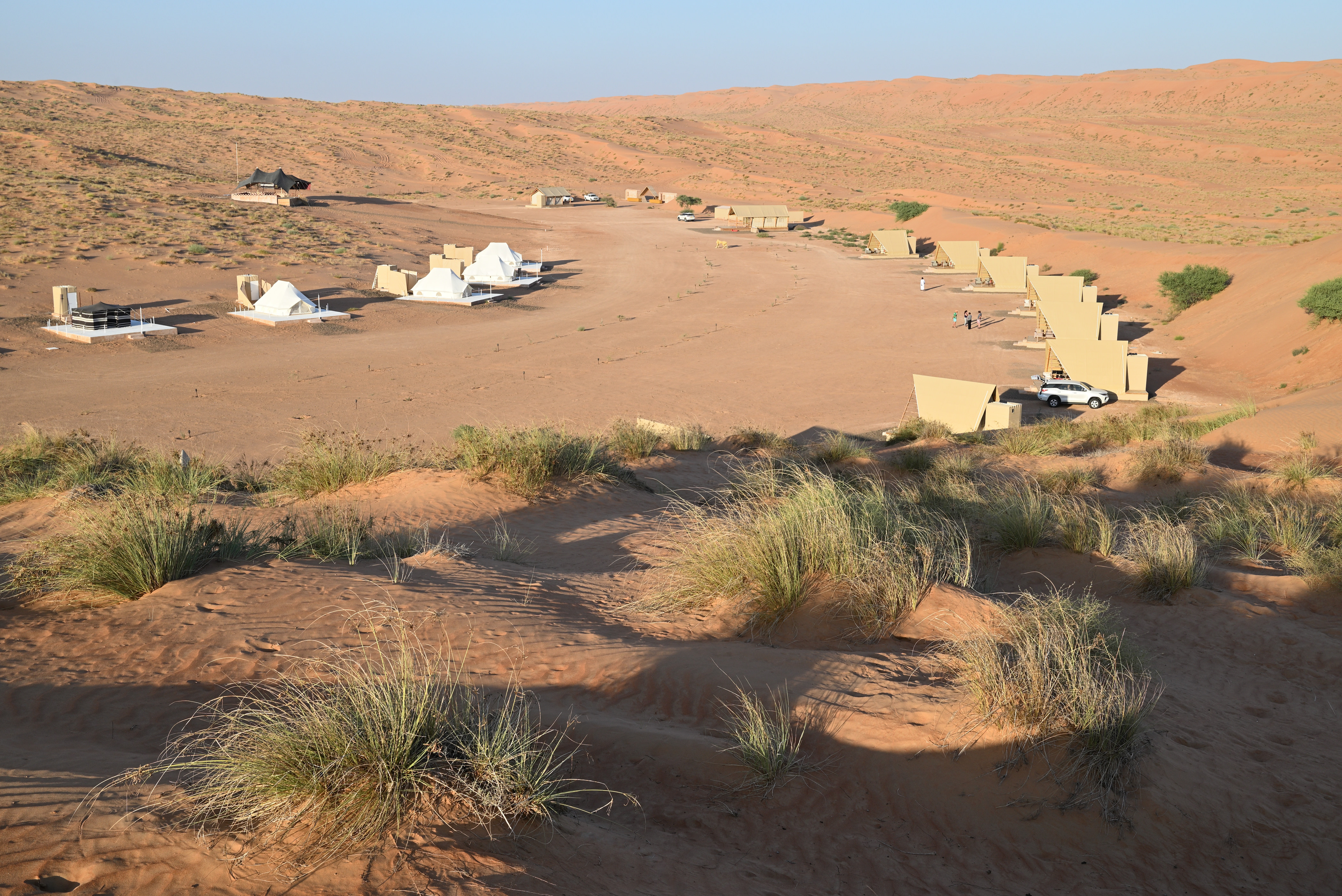 Am frühen Nachmittag treffen wir uns mit unserem Fahrer und den anderen Gästen am vereinbarten Treffpunkt. Gerne wären wir selbst gefahren, aber unser Auto ist für die Herausforderung des tiefen Wüstensands nicht geeignet. Schnell wird noch etwas Luft aus den Reifen der Autos gelassen und dann geht es in einer Kolonne hinein in die unendlichen Weiten der Wahiba Sands. Während die Musik im Auto spielt, zieht die goldene Dünenlandschaft und die ersten Kamele an uns vorbei. Kurz vor dem Camp erwartet uns eine steile Düne, die uns den Atem raubt - der Sand spritzt, die Reifen drehen durch, aber schließlich schaffen wir es hinauf. Unser abgelegenes Wüstencamp The Adventurer Camp ist ein kleines Paradies. Am Nachmittag erkunden wir die Umgebung, die von einer stillen, überwältigenden Schönheit geprägt ist.