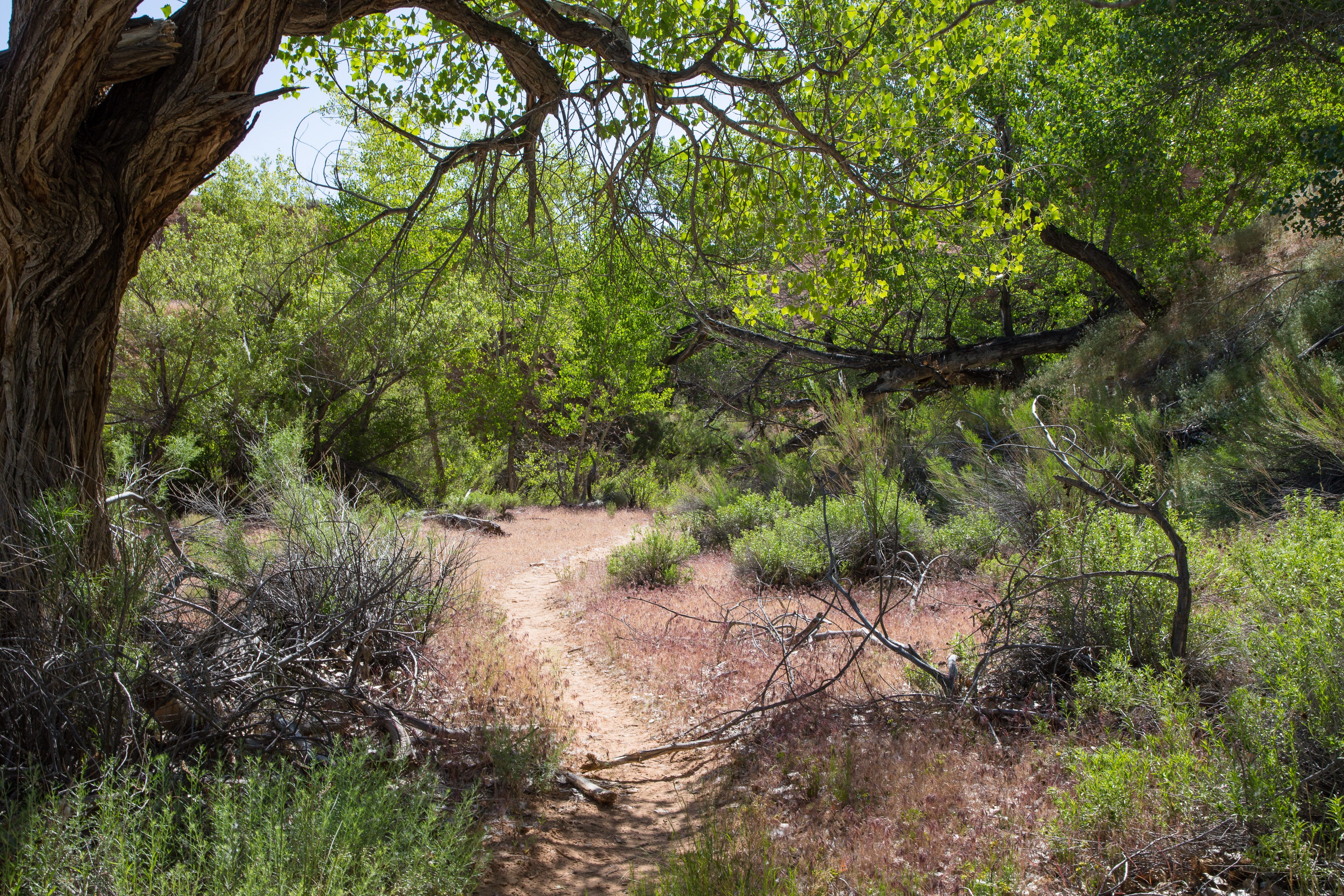 Von dort an ging es die meiste Zeit durch Wälder in der Nähe des Coyote Creek. Oft war der schmale Pfad kaum erkennbar und die vielen Biegungen im Canyon erschwerten zusätzlich die Navigation. Zur Not konnte man sich jedoch immer am Coyote Creek orientieren, da dieser direkt zum Coyote Gulch führt und während der Wanderung mehrmals überquert werden muss. Aufpassen muss man lediglich, dass man nicht versehentlich in einen der Seitencanyons einbiegt.