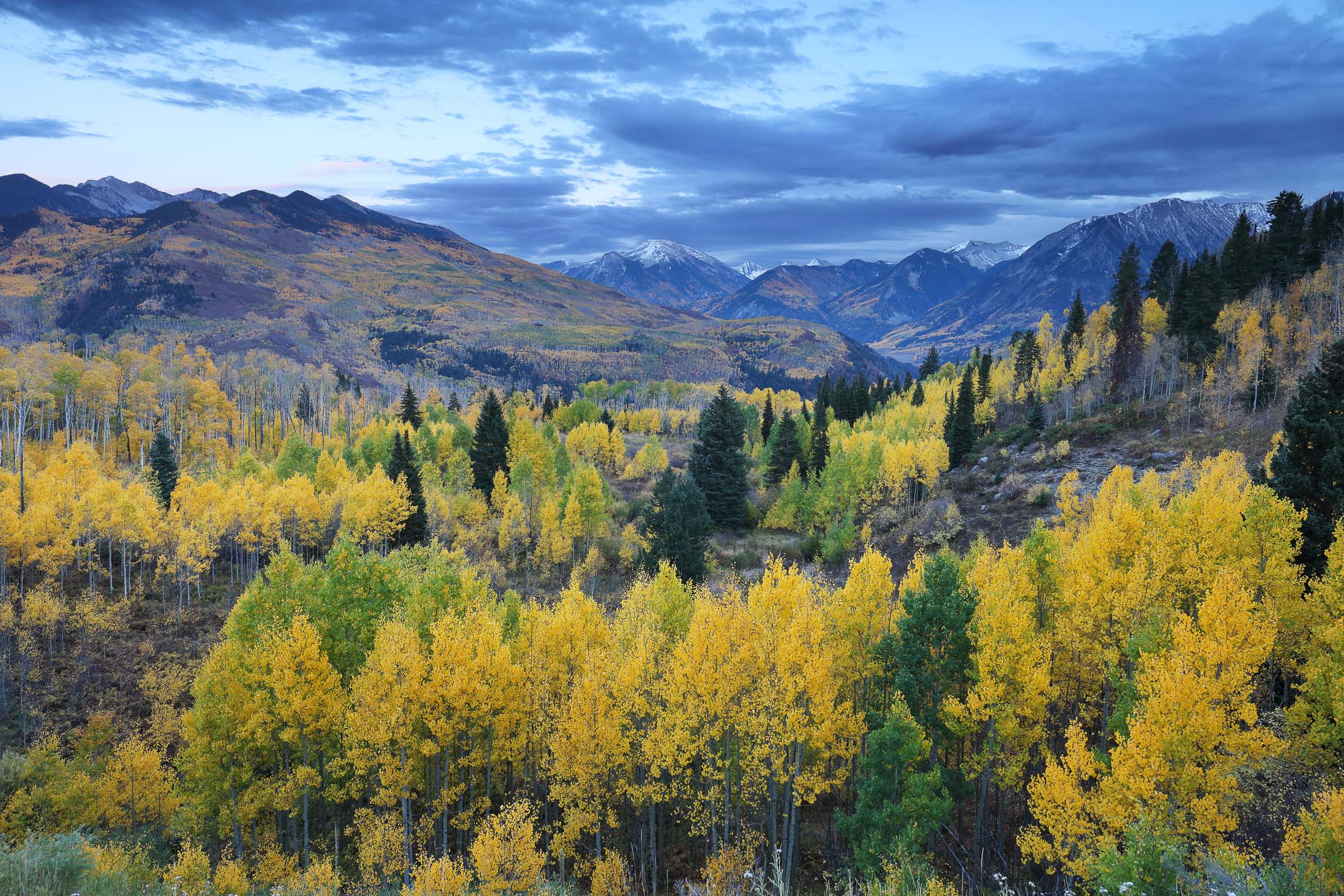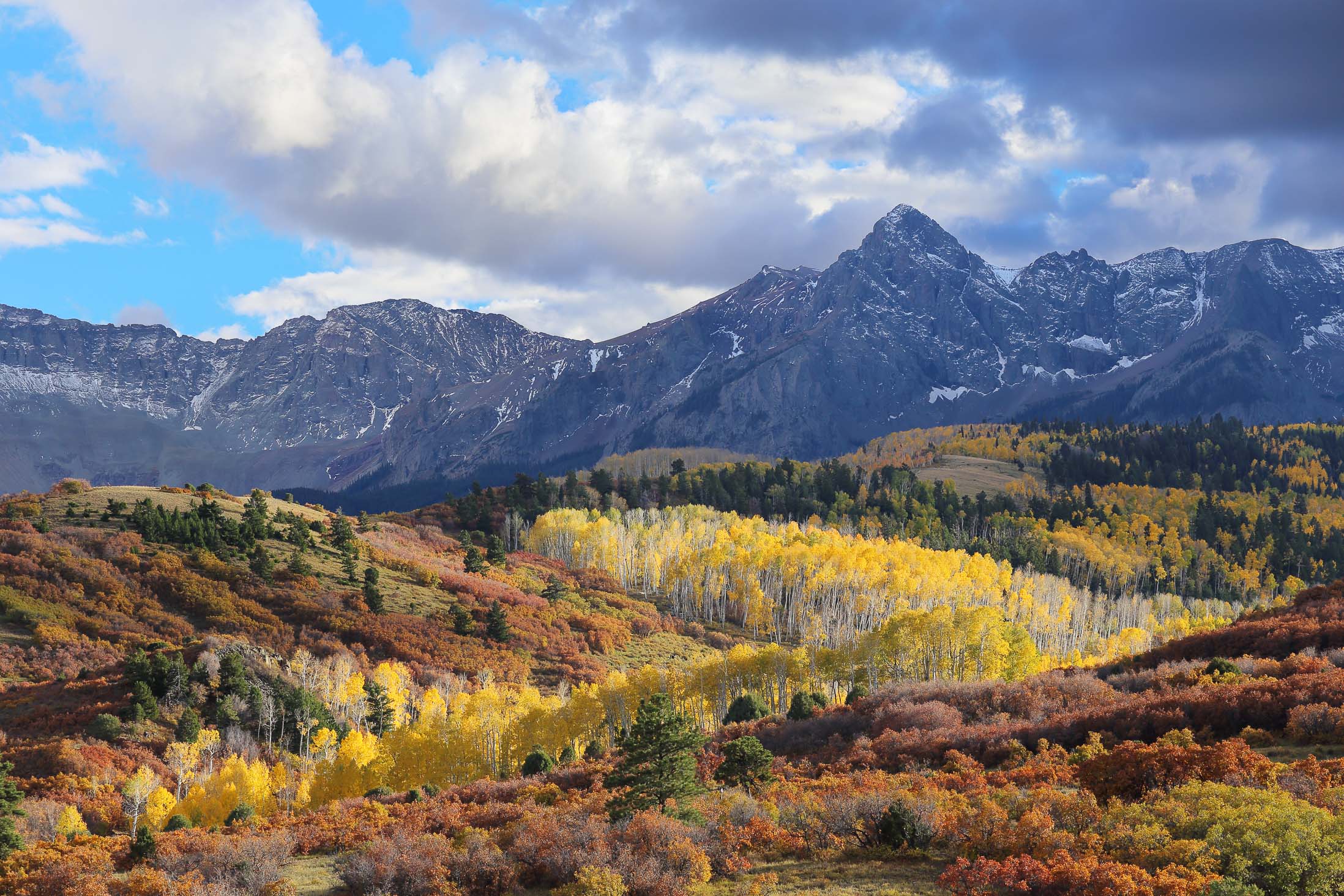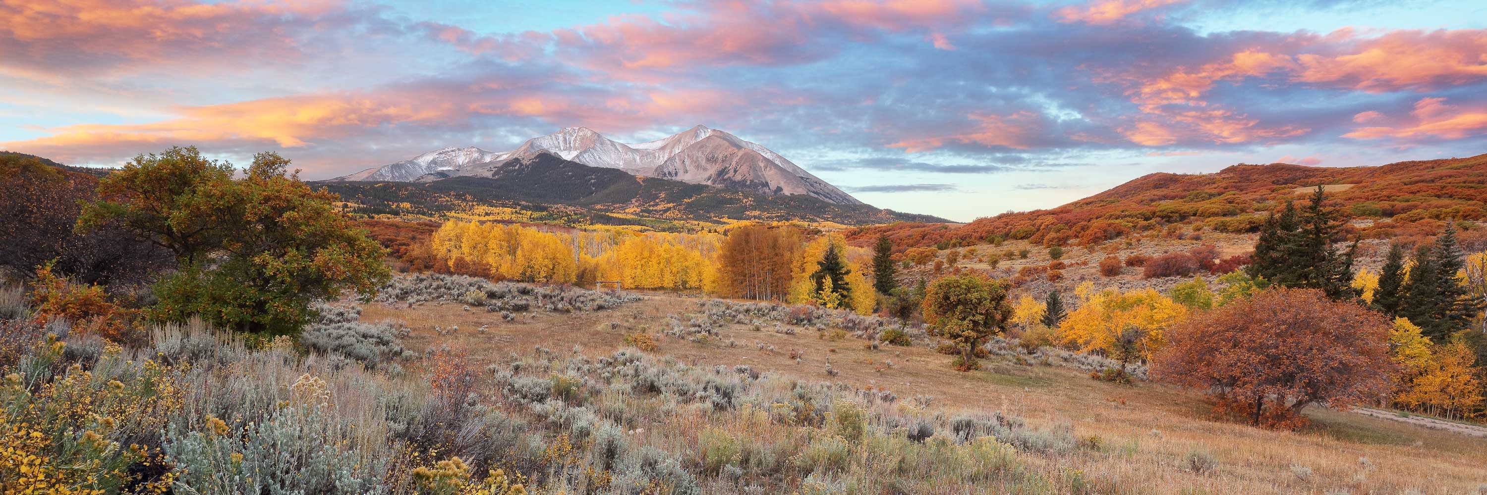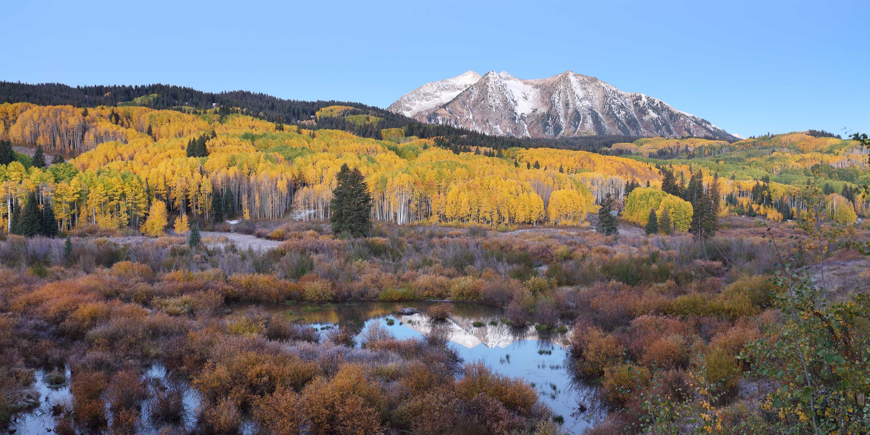 Im September und Oktober tauchen zahlreiche Aspen Bäume den Bundesstaat Colorado für zwei Wochen in ein leuchtendes gelb-goldenes Blättermeer. Insbesondere in den Gebieten um Aspen, Crested Butte, Ridgway und Telluride lässt sich das Naturschauspiel besonders gut beobachten. Je nachdem wie weit die Herbstfärbung fortgeschritten ist, sind die Aspen Wälder entweder grün-gelblich, gelb-golden, gelb-orange oder dunkelgelb-bräunlich gefärbt. Aber nicht nur die Aspen färben sich im Herbst, sondern auch viele weitere Bäume und kleinere Sträucher wie Bigtooth, Wasatch Maple, Western Chokecherry, Three-leaved Sumac und “Skunkbrush” sorgen für schöne Farben. Vor allem die rötlich-braune Färbung des dreiblättrigen Sumach harmoniert sehr gut mit dem Gelb der Aspen Bäume. Besonders schön sehen die Landschaften zudem aus, wenn die Berge nach dem ersten Herbststurm bereits mit Schnee bedeckt sind.