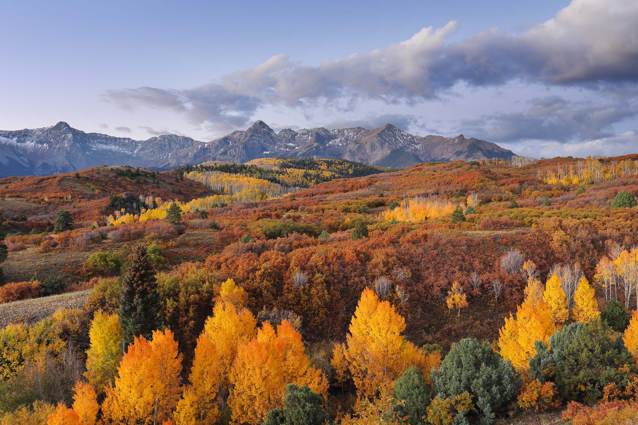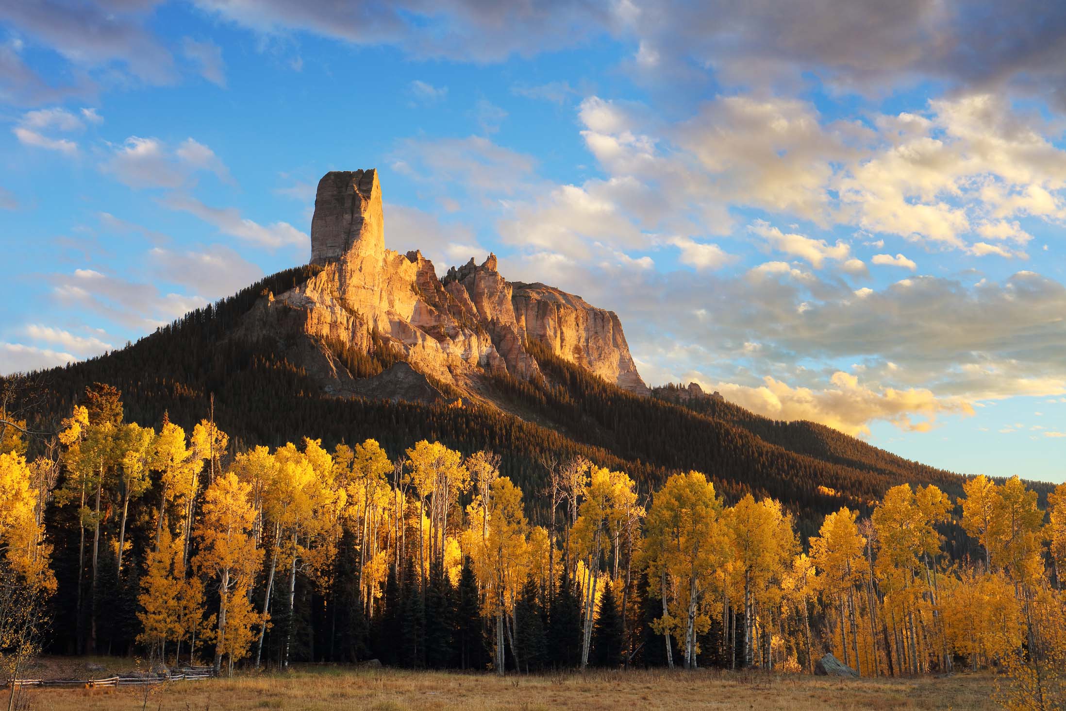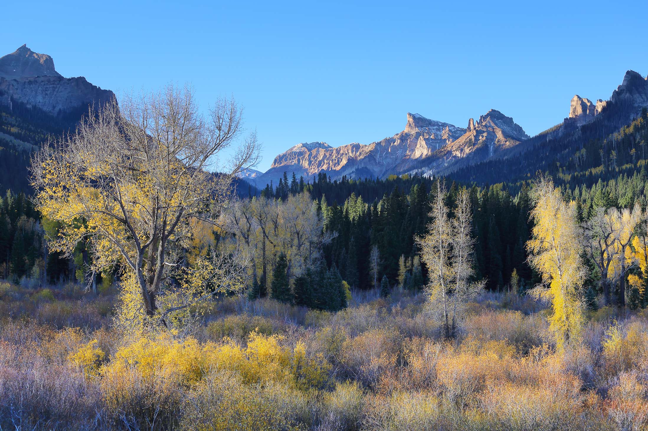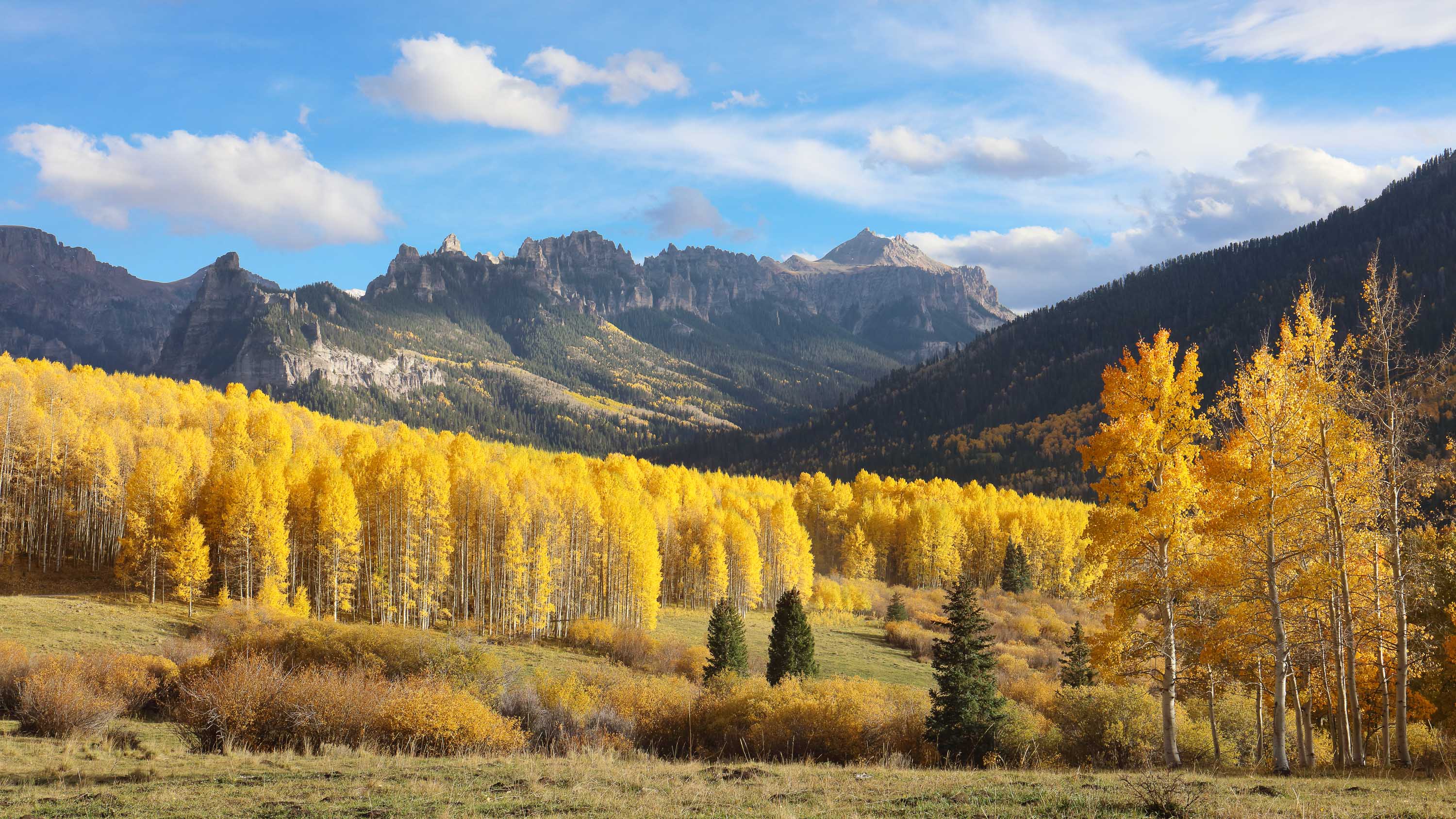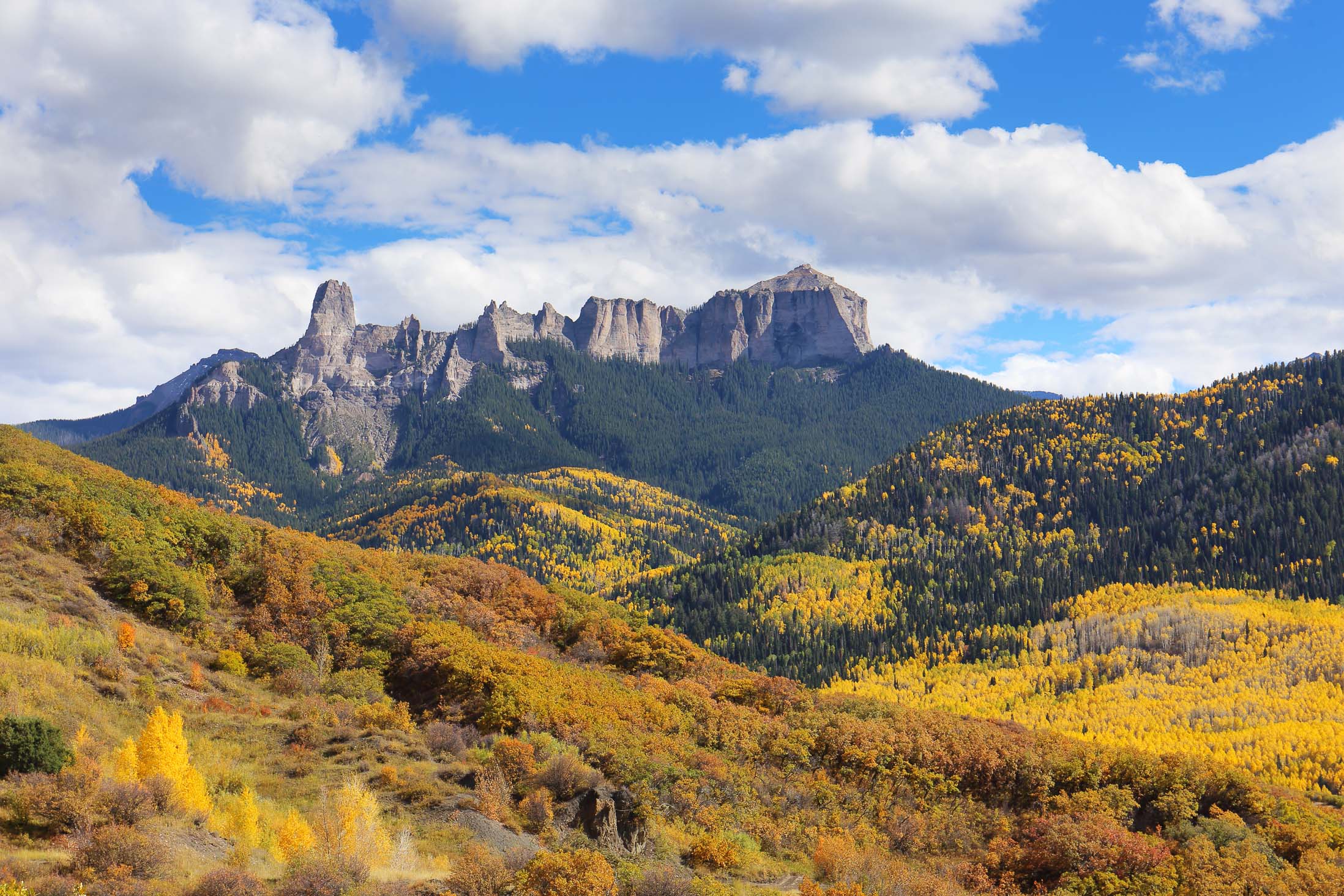 Im September und Oktober tauchen zahlreiche Aspen Bäume den Bundesstaat Colorado für zwei Wochen in ein leuchtendes gelb-goldenes Blättermeer. Insbesondere in den Gebieten um Aspen, Crested Butte, Ridgway und Telluride lässt sich das Naturschauspiel besonders gut beobachten. Je nachdem wie weit die Herbstfärbung fortgeschritten ist, sind die Aspen Wälder entweder grün-gelblich, gelb-golden, gelb-orange oder dunkelgelb-bräunlich gefärbt. Aber nicht nur die Aspen färben sich im Herbst, sondern auch viele weitere Bäume und kleinere Sträucher wie Bigtooth, Wasatch Maple, Western Chokecherry, Three-leaved Sumac und “Skunkbrush” sorgen für schöne Farben. Vor allem die rötlich-braune Färbung des dreiblättrigen Sumach harmoniert sehr gut mit dem Gelb der Aspen Bäume. Besonders schön sehen die Landschaften zudem aus, wenn die Berge nach dem ersten Herbststurm bereits mit Schnee bedeckt sind.