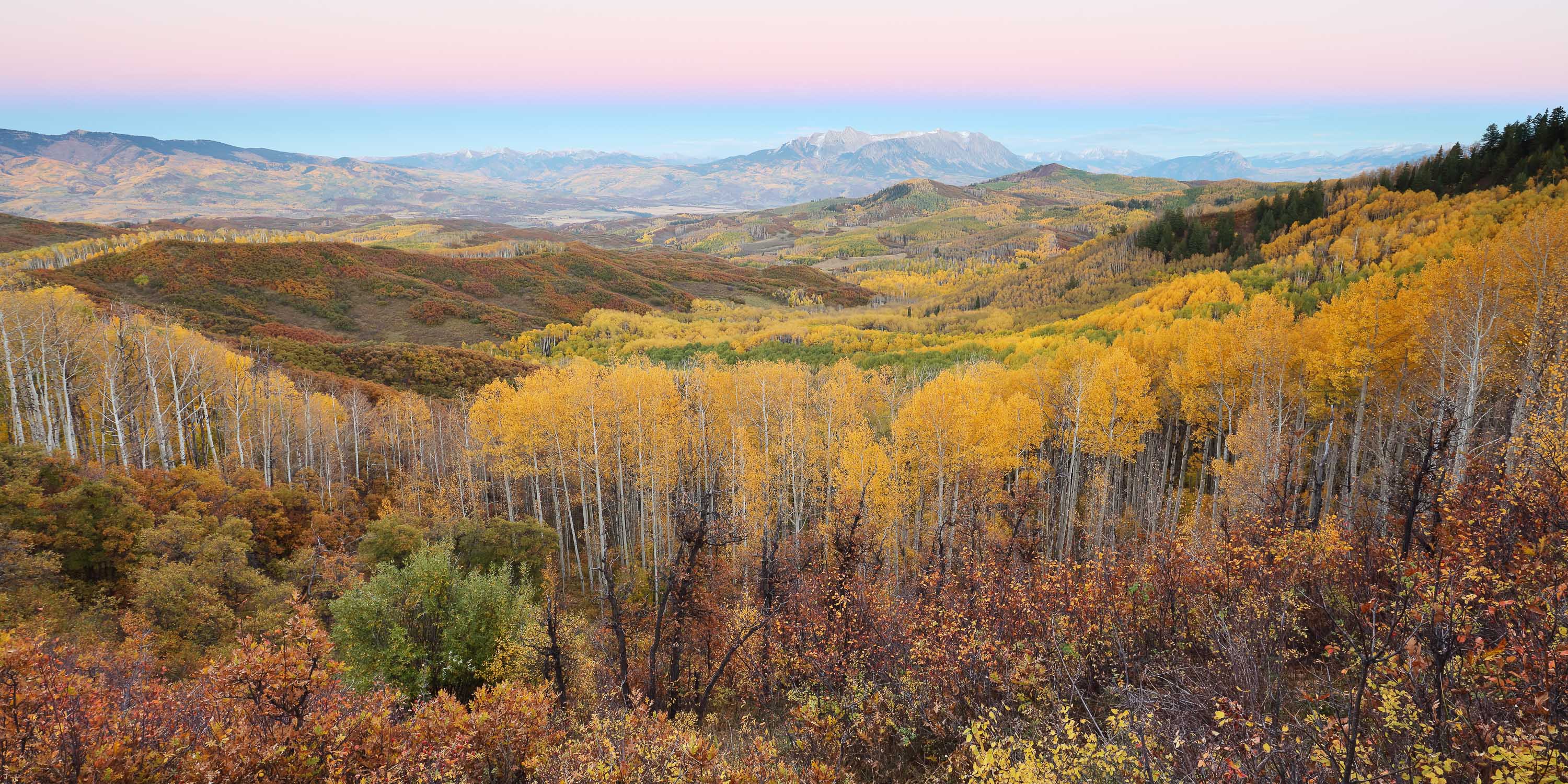 Auf dem Weg von Carbondale nach Somerset führt der Colorado State Highway 133 in den Elk Mountains über den McClure Pass. An der Passhöhe gibt es einen Aussichtspunkt in Richtung Crystal River Valley. Ab Nachmittag werden die Aspen Bäume von der Sonne von hinten angestrahlt und beginnen regelrecht zu glühen.