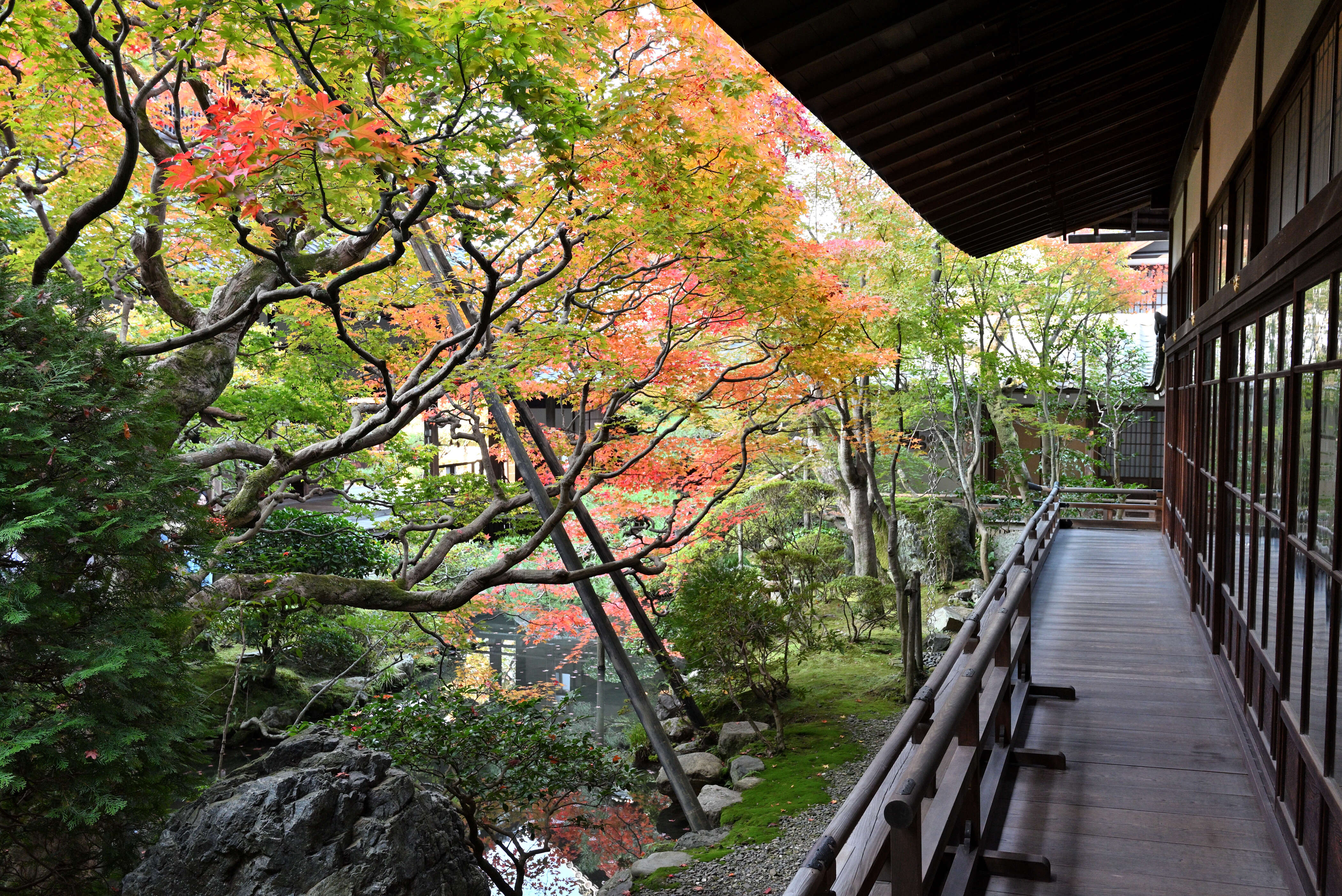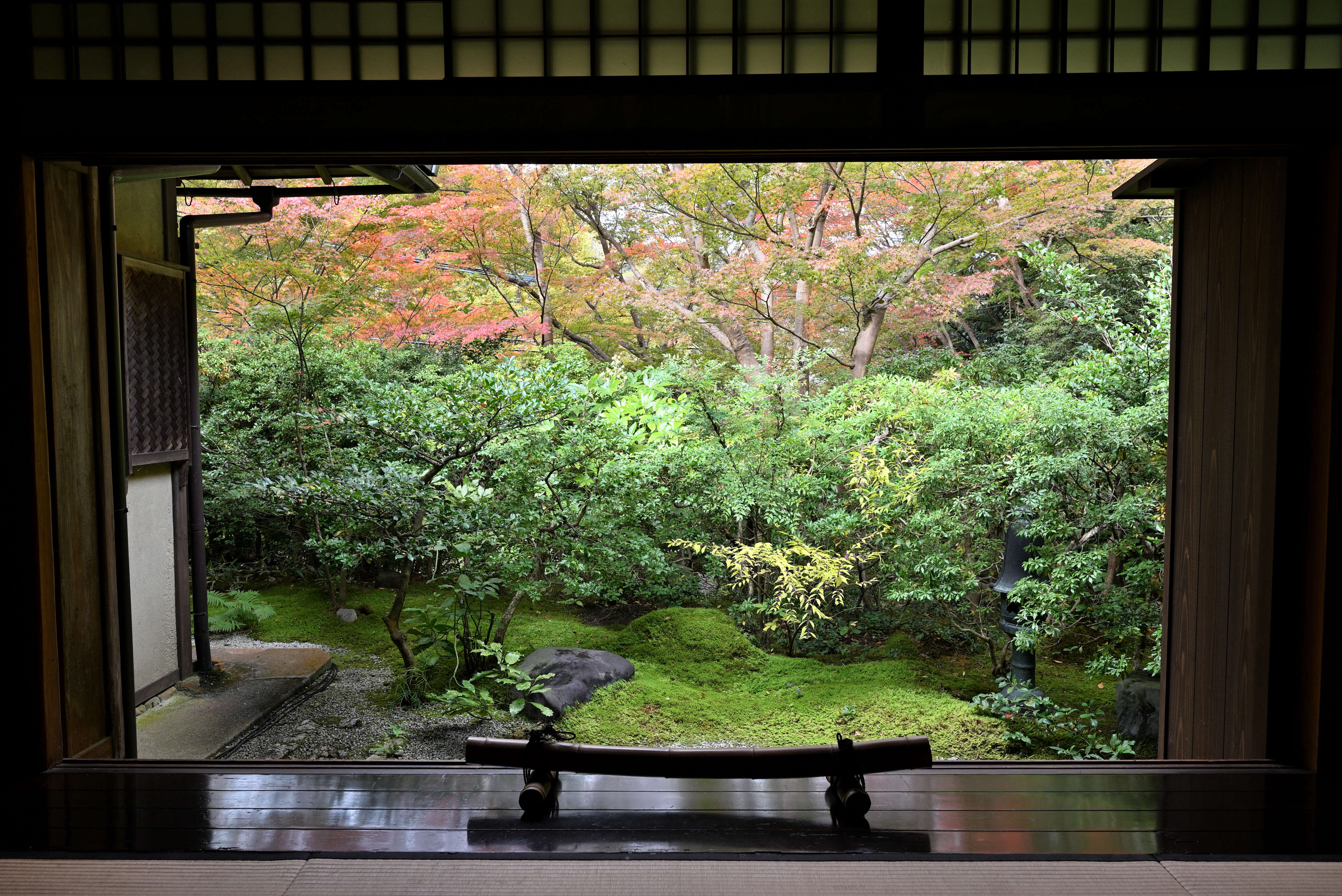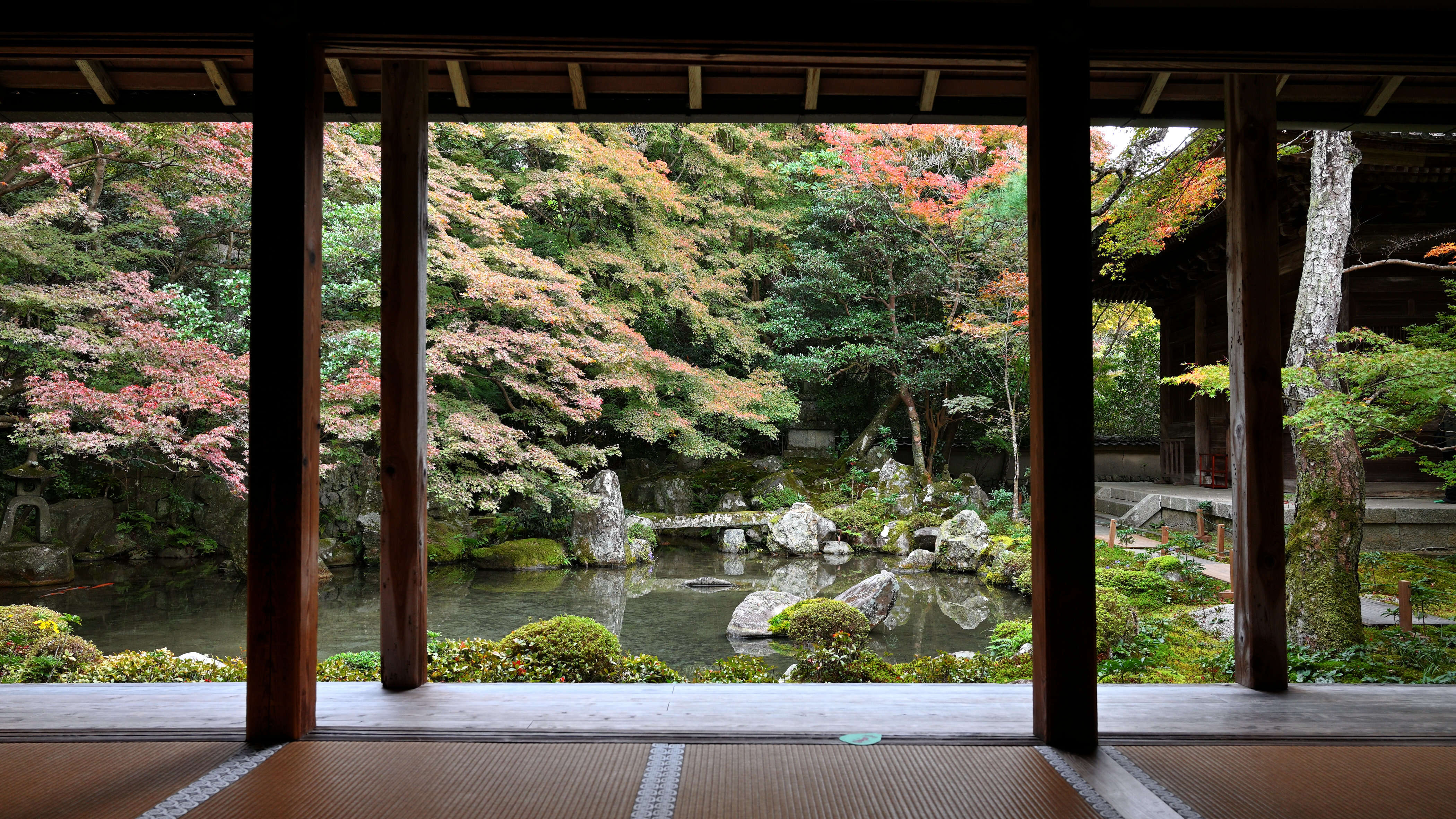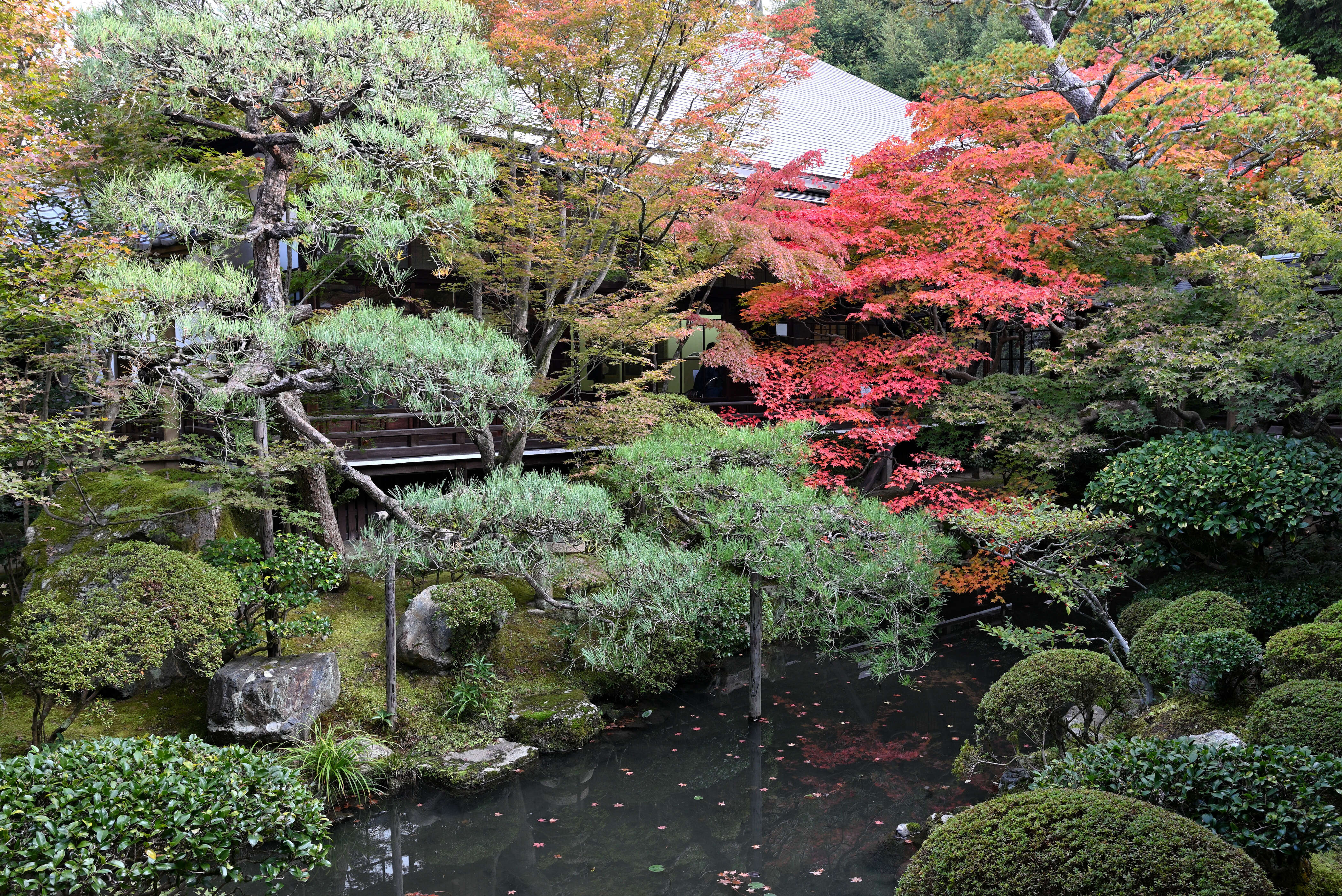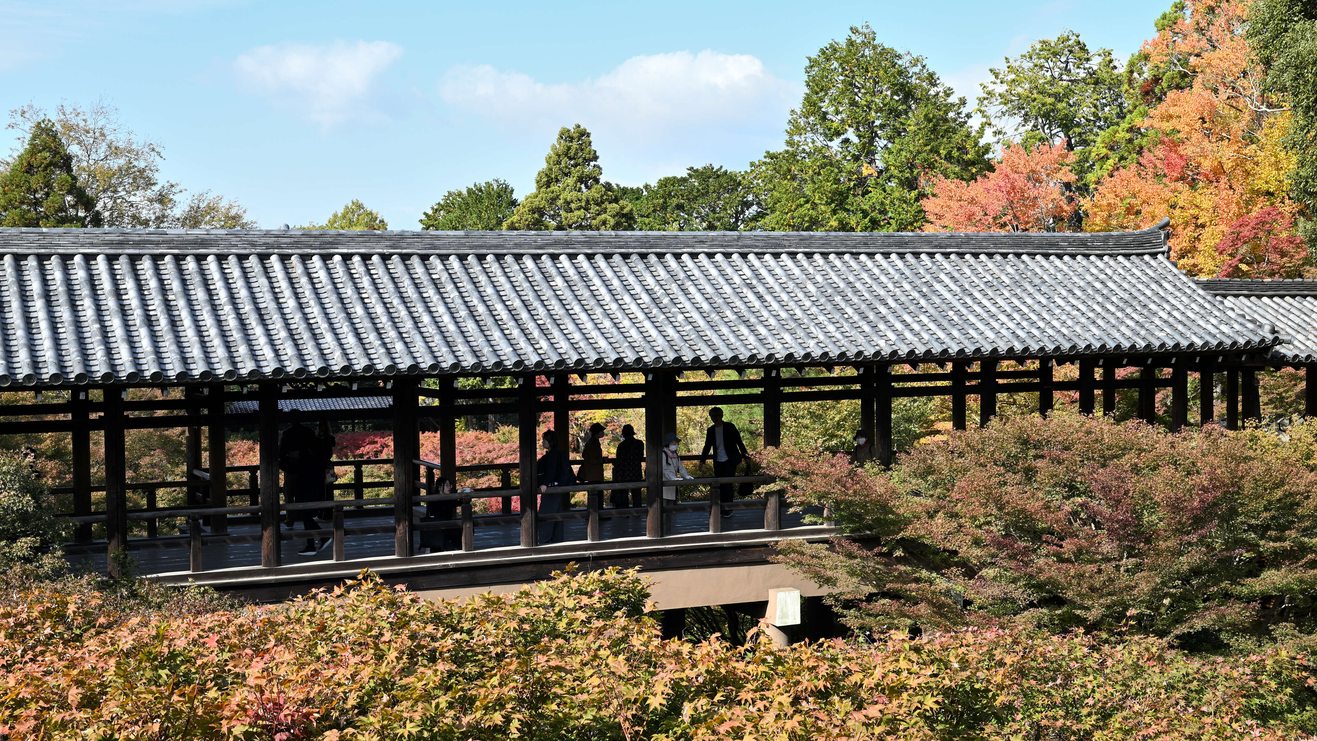 Im Enkō-ji Tempel eröffnen offene Räume wunderschöne Blicke auf herbstliche Gärten. Der Rurikō-in Tempel begeistert mit Spiegelungen der Bäume auf einem Tisch im Innenraum. Zufällig entdecke ich den Renge-ji Tempel, ruhig, zenartig, bevor ich Kyoto Station und den Skywalk besuche.