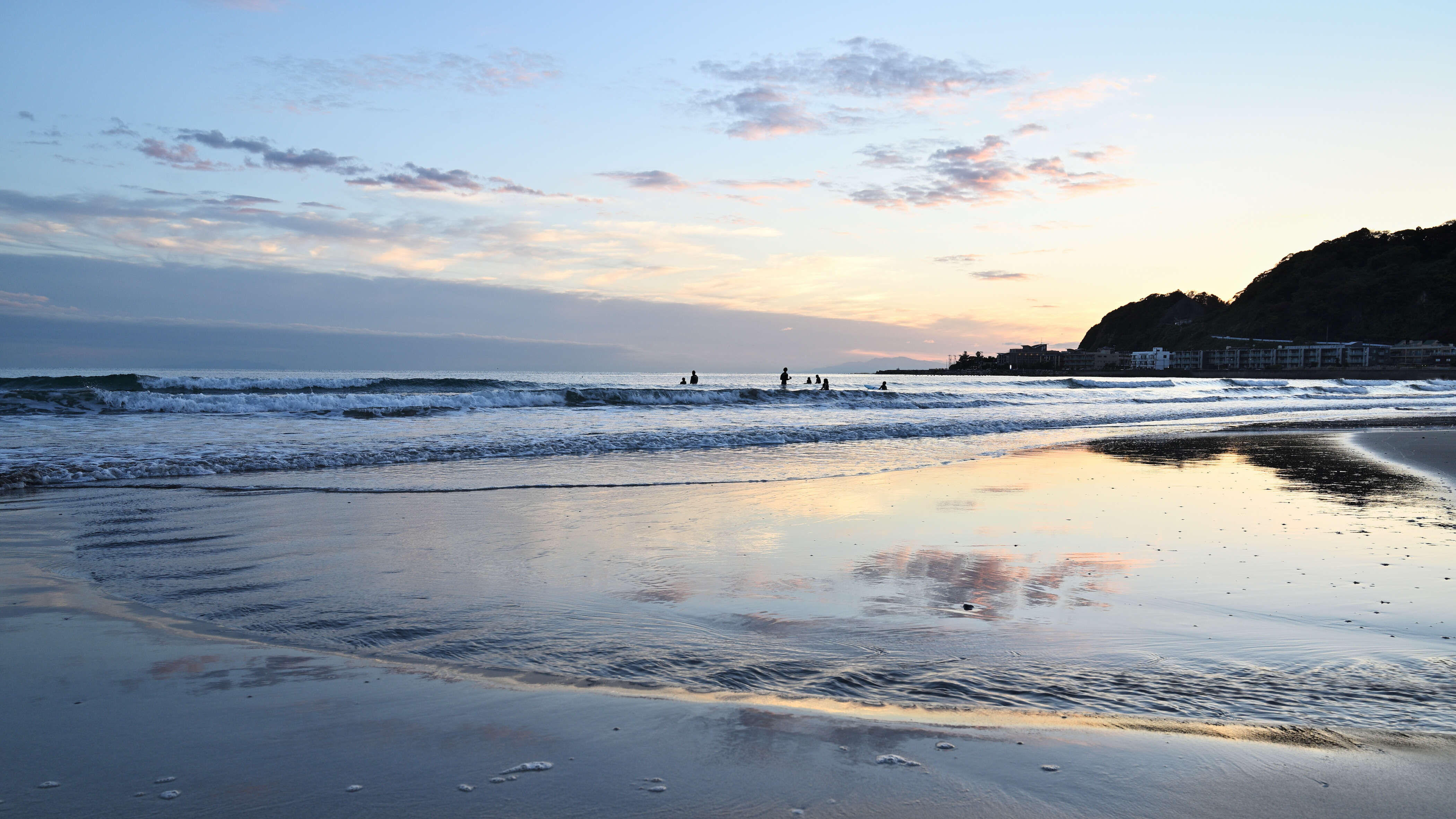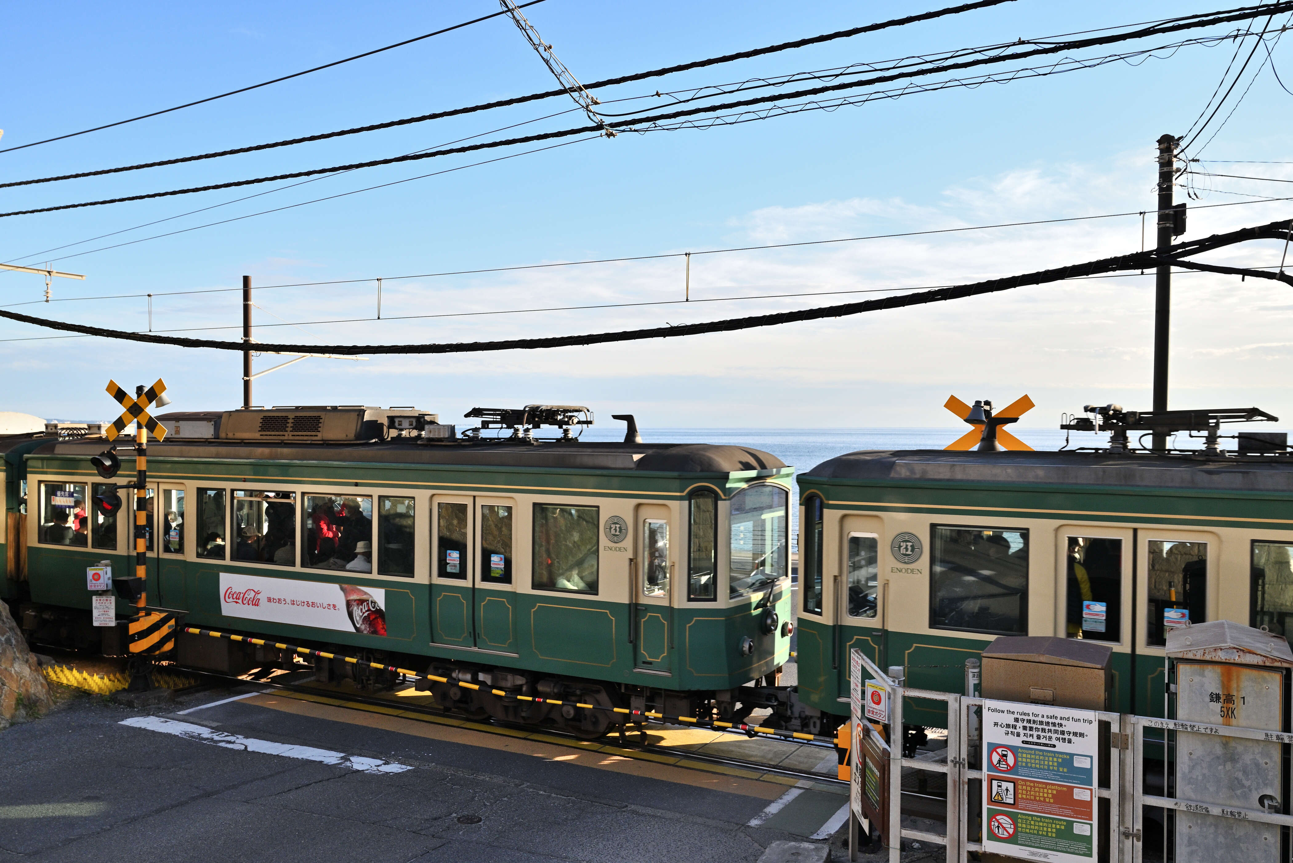 Noch einmal die Pagode am Morgen, dann Onsen-Frühstück und ein letzter Spaziergang. Die Zugfahrt nach Kamakura verläuft reibungslos – viermal umsteigen, alles pünktlich. Am Bahnübergang Kamakurakōkō-Mae fotografierte ich Züge, dann Spaziergang am Strand und Sonnenuntergang über dem Meer. Die Szene am Bahnübergang wurde in zahlreichen japanischen Animes, Fernsehsendungen, Filmen und Werbespots gezeigt - entsprechen voll ist es.