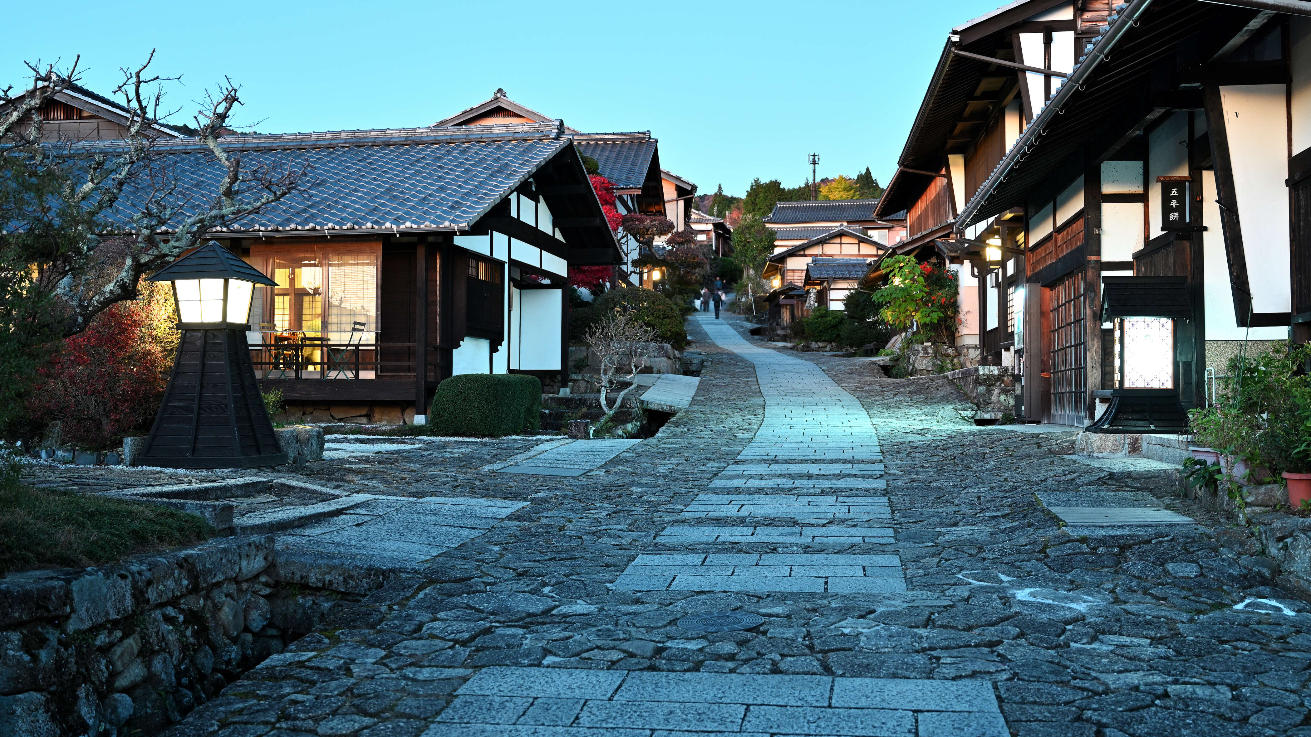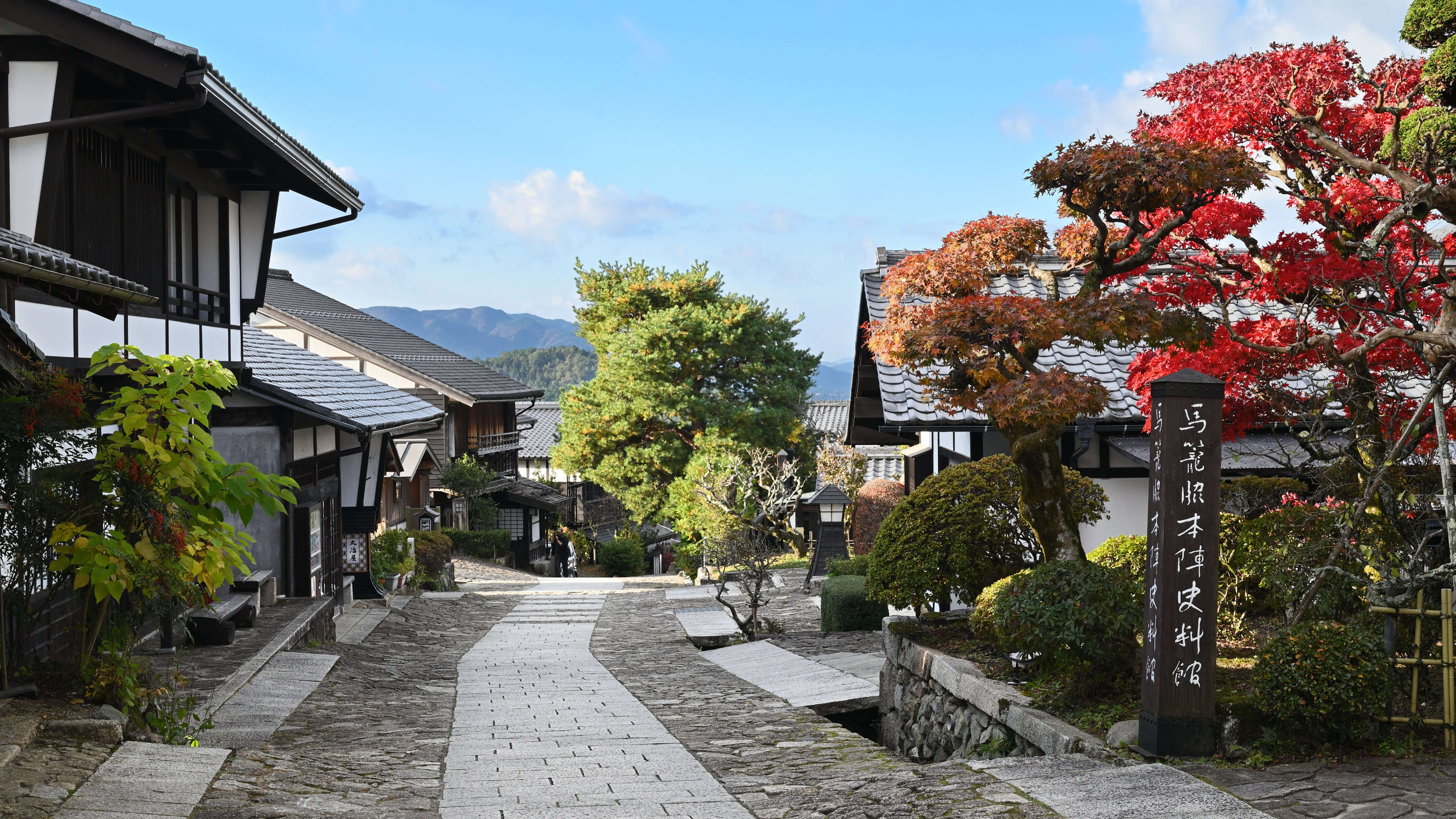 Ich wandere von Magome nach Tsumago auf dem Nakasendō-Trail. Das kleine Dorf wirkt wie aus der Zeit gefallen. Unterwegs sehe ich einen Affen, der sich frech eine Kaki vom Baum pflückt – Japan wie aus einem Film.