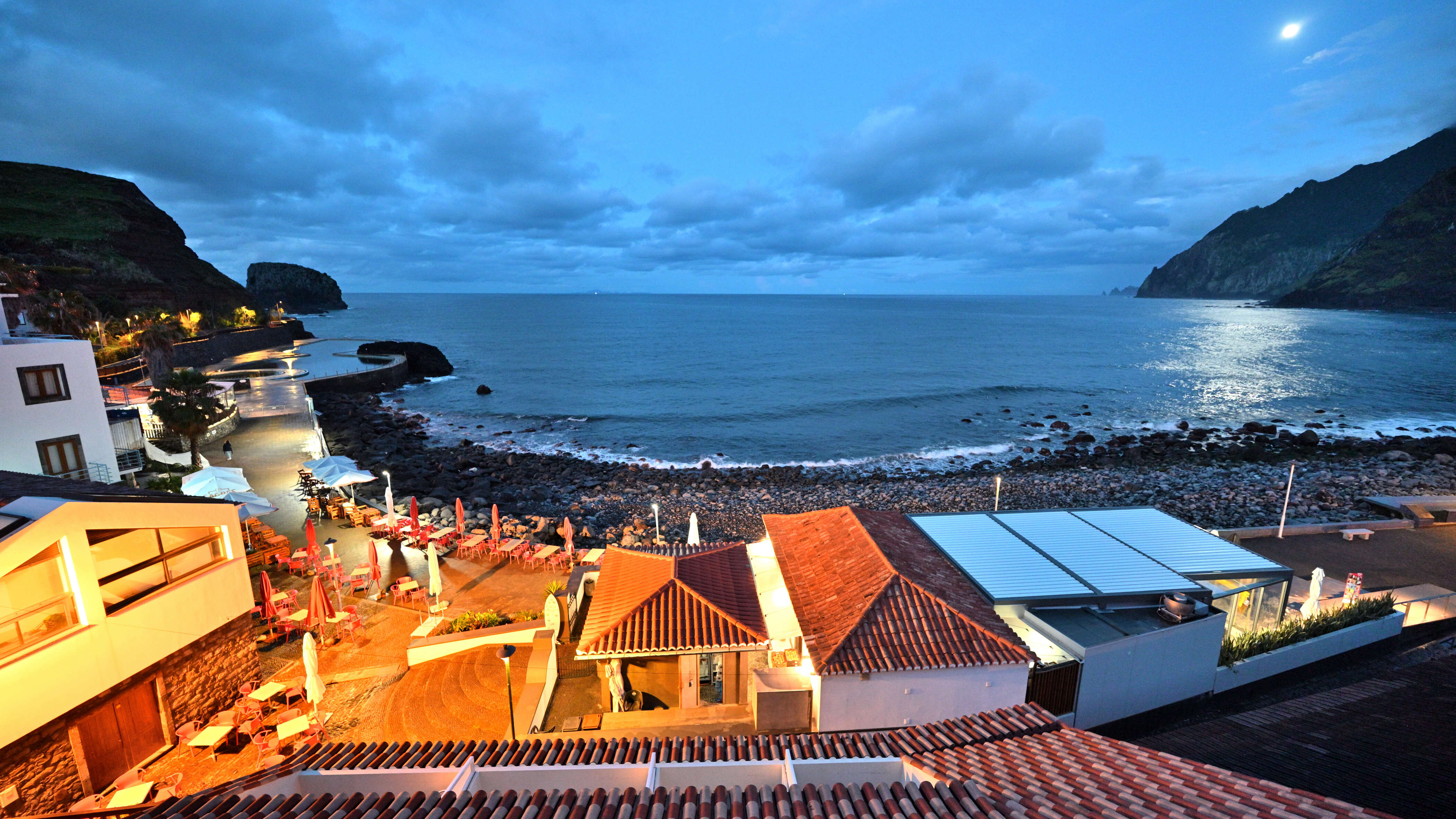 Am Nachmittag zieht es uns nochmal in die Berge – eine spontane Wanderung durch dichte Lorbeerwälder belohnt mit Stille und Ausblick. Auf dem Rückweg über Ribeira da Janela stoppen wir am Miradouro da Eira da Achada – ein letzter, dramatischer Blick auf die Nordküste, bevor es wieder abwärts geht. Abends erwartet uns ein kulinarisches Highlight in Santa Maria Madalena: Espetada – saftig gegrilltes Rindfleisch am Lorbeerzweig. Später in Porto Moniz wird zufällig eine neue Bar eingeweiht – mit Feuerwerk direkt vor unserer Unterkunft. Madeira weiß, wie man überrascht.
