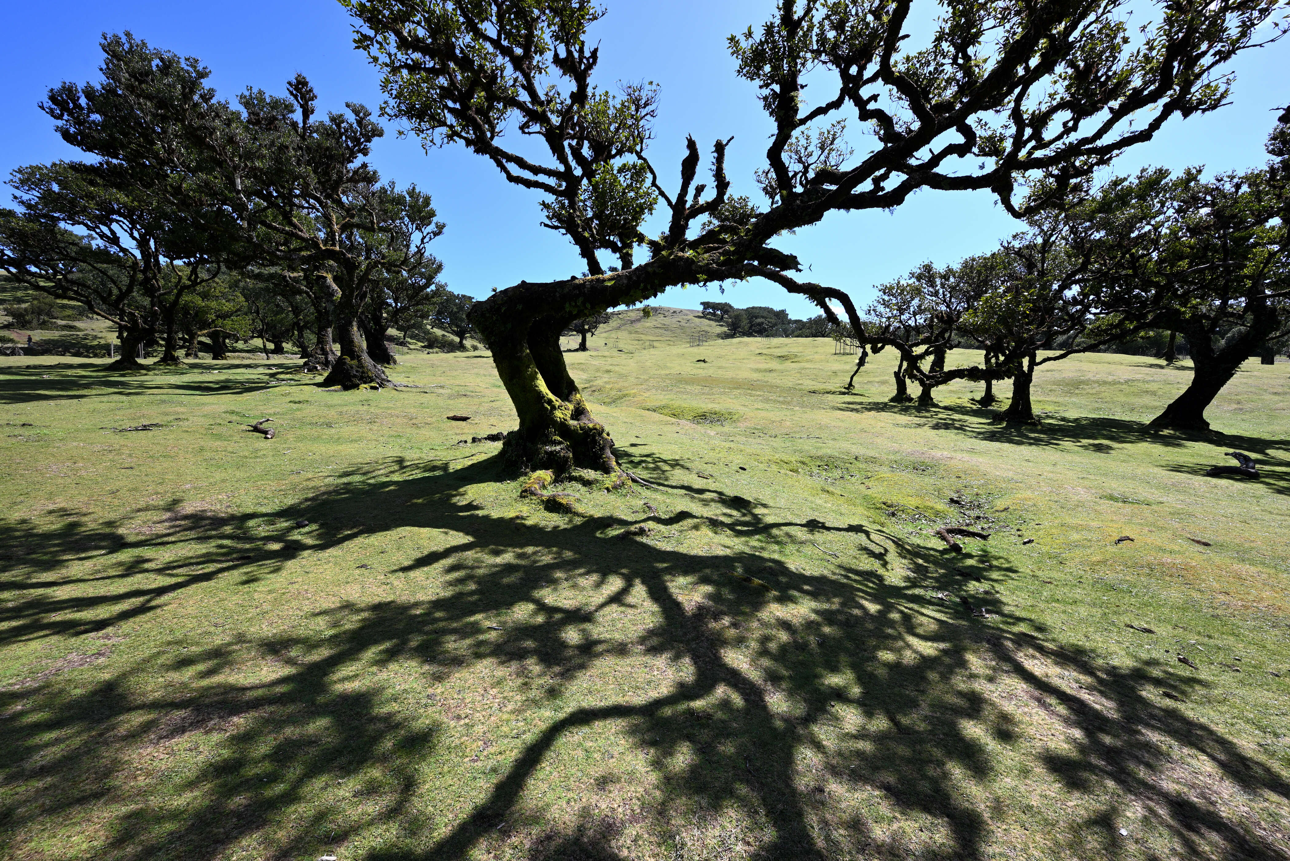 Der Morgen beginnt mit Höhenluft. Über gewundene Straßen erreichen wir die Hochebene von Paul da Serra und stoppen am Aussichtspunkt Fonte do Bispo. Die beliebte Wanderung PR6 zu den „25 Quellen“ lassen wir links liegen – der Parkplatz ist schon am frühen Morgen voll. Stattdessen führt uns der Weg zum Fanal-Wald. Kein Nebel, aber dafür ein magisches Spiel aus Licht und Schatten, das durch die knorrigen Äste der Lorbeerbäume tanzt.