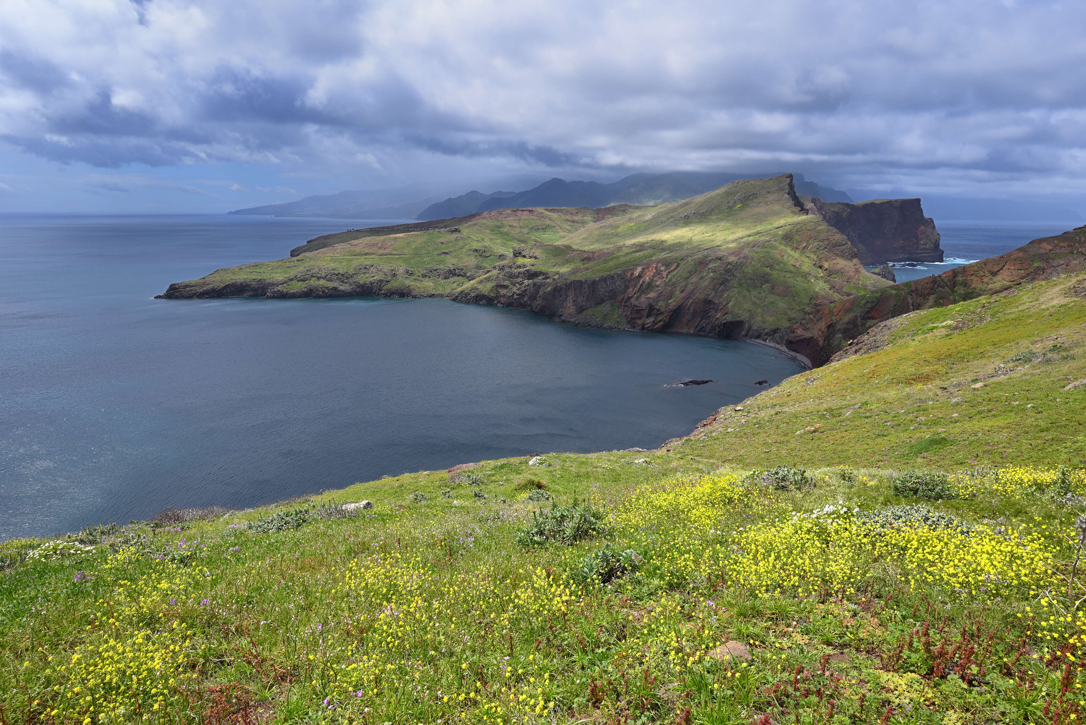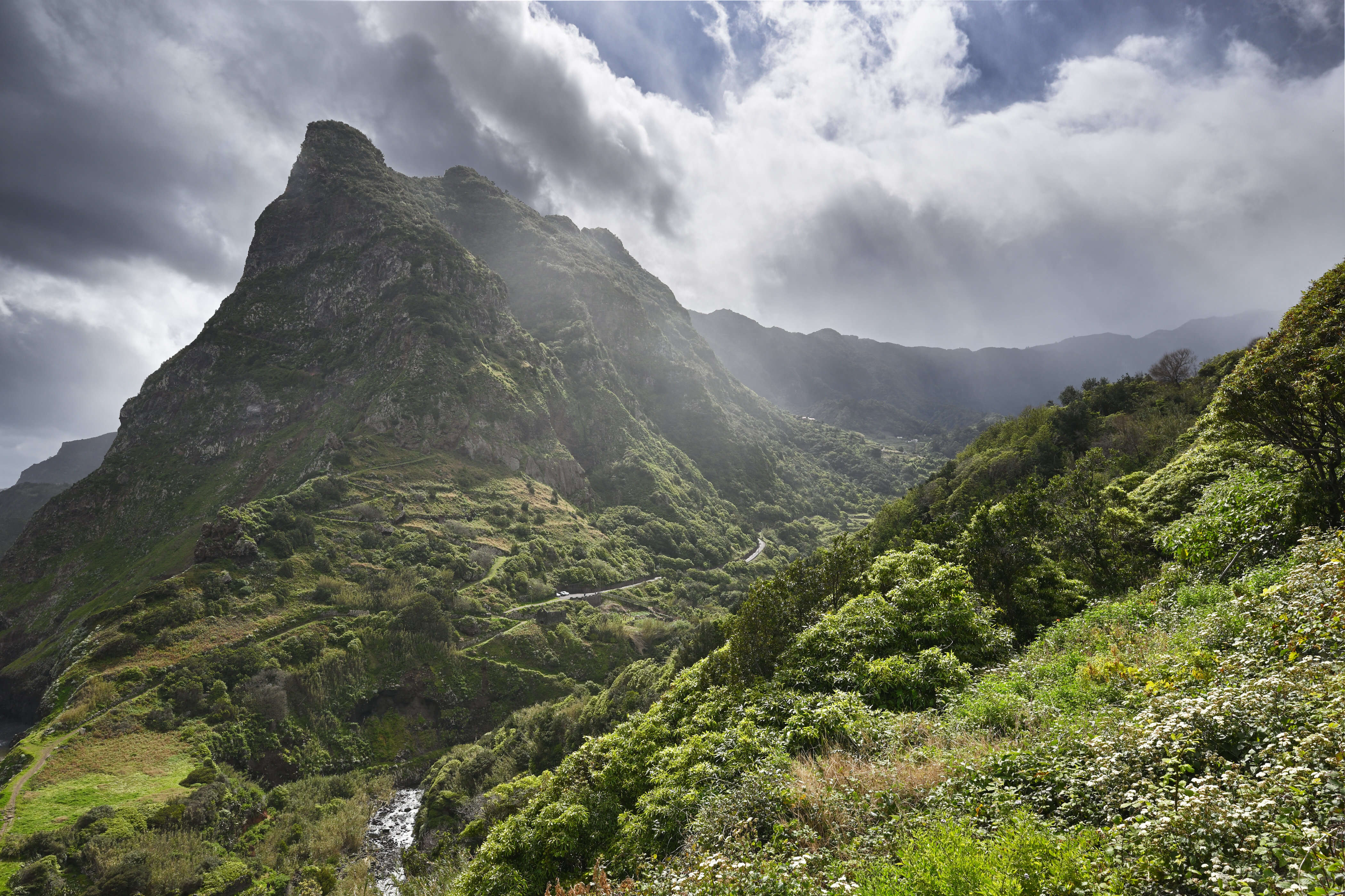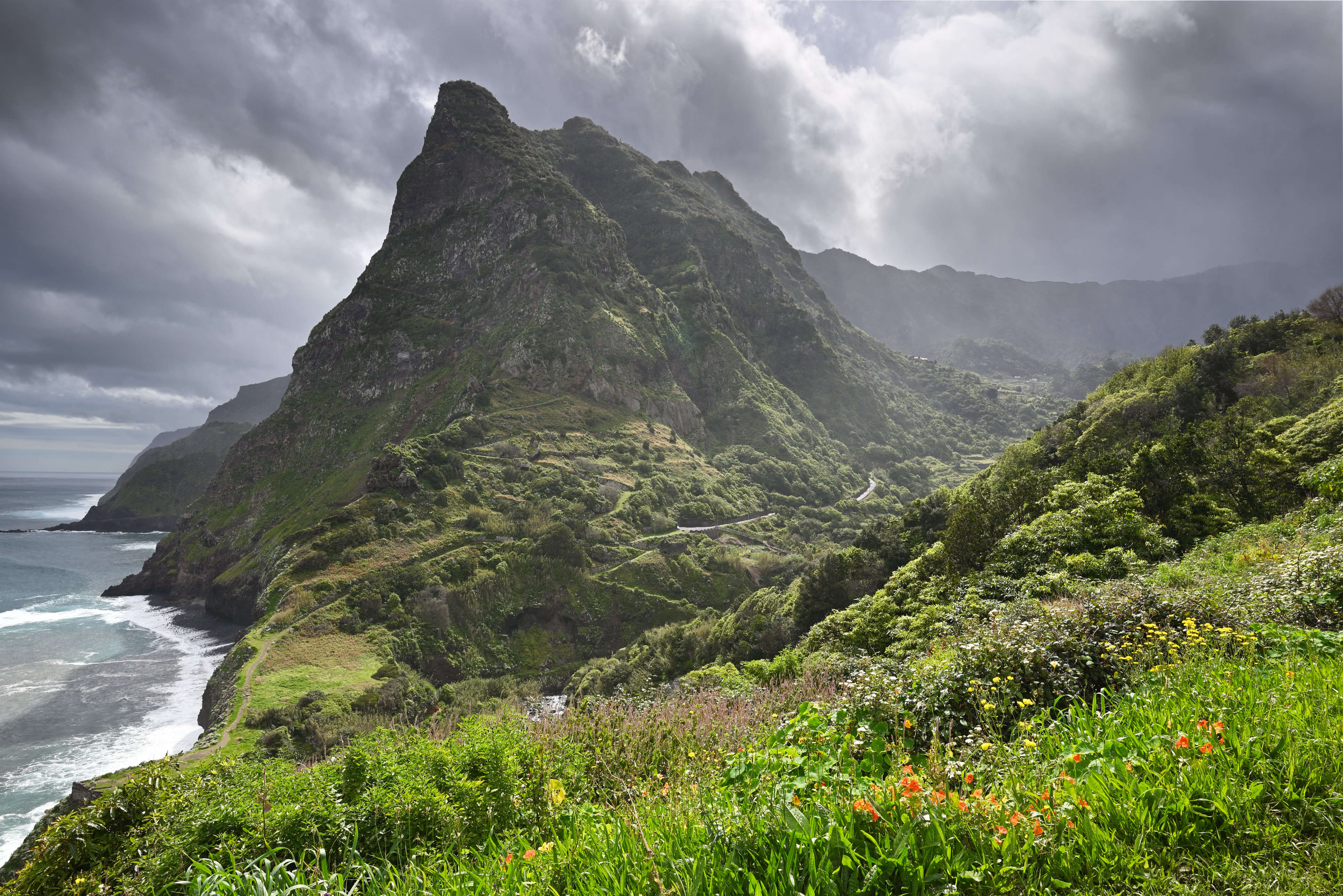 Ein Tag voller Ausblicke. Entlang der Nordküste reihen sich Miradouros wie Perlen auf einer Kette: São Cristovão, Beira da Quinta, Nossa Senhora dos Bons Caminhos – jeder Ort ein neues Panorama. Das Wetter wechselt im Minutentakt, Sonne und Regen tanzen ein wildes Spiel, das die Landschaft in dramatisches Licht taucht.