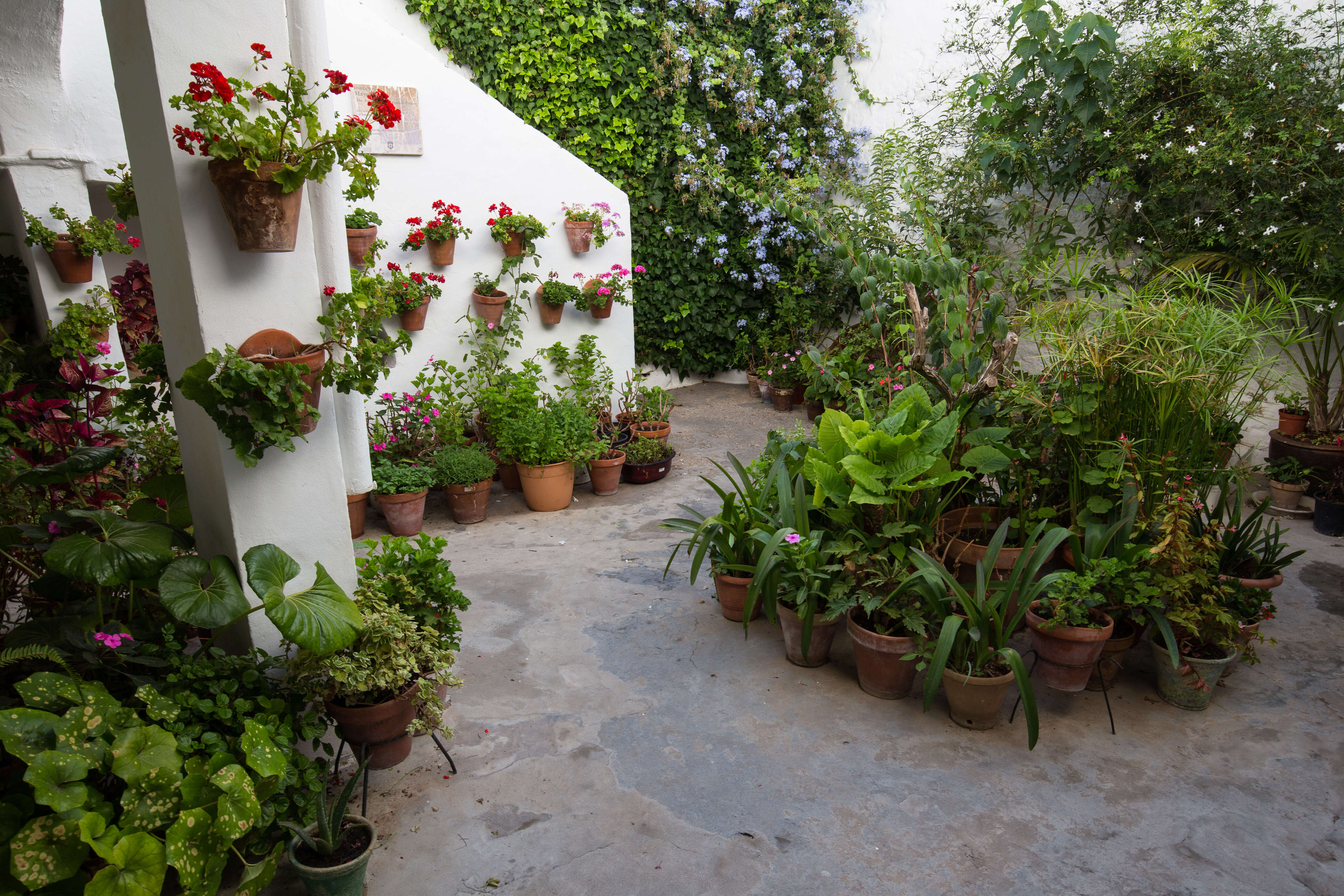 - versteckter Innenhof mit Blumentöpfen