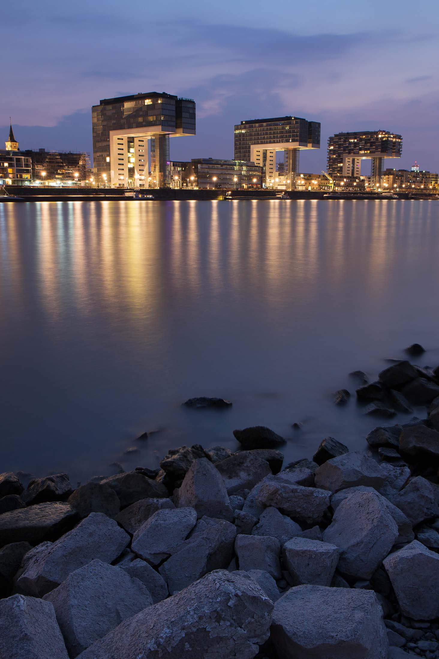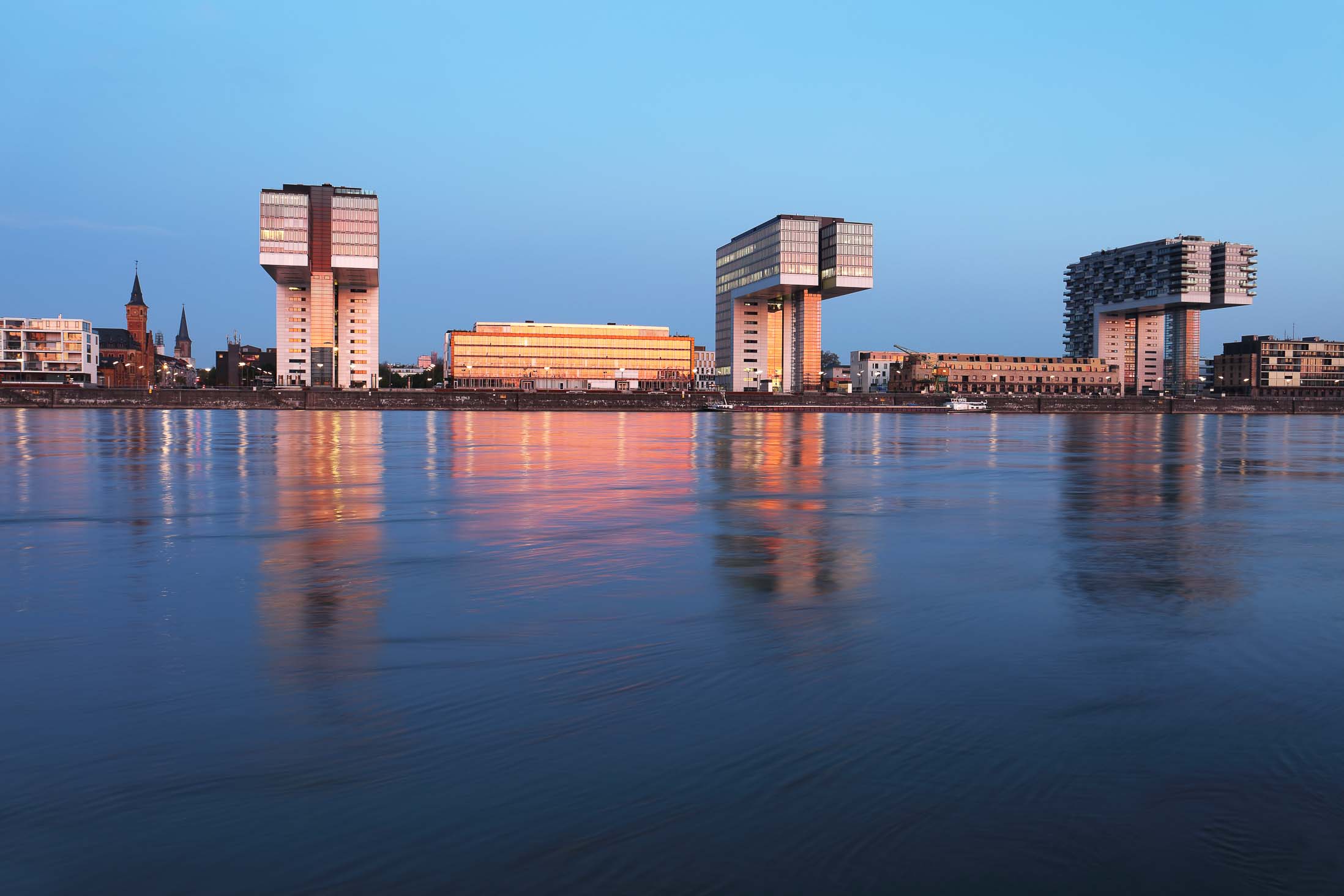 - Die Kranhäuser spiegeln sich im Rhein
