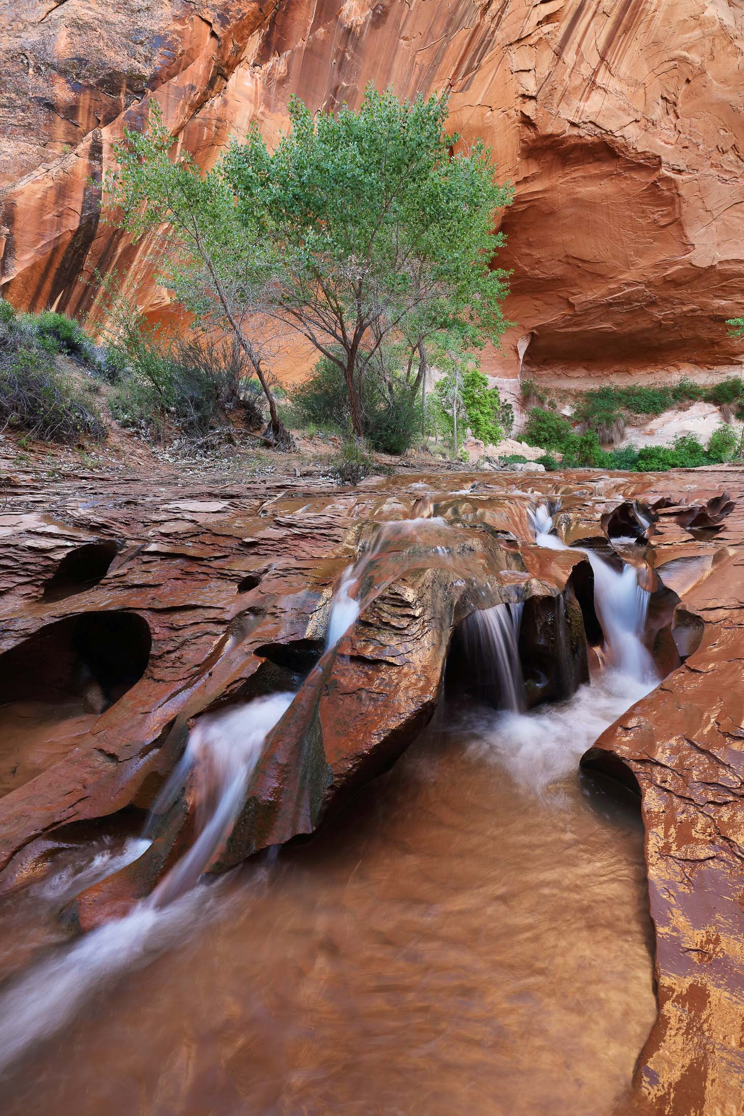 Nach der Pause wanderte ich flussabwärts tiefer in die Schlucht. Ab jetzt wird der Canyon immer wilder und die Felswände ragen immer weiter in die Höhe. Die meiste Zeit wandert man nun im kühlenden Wasser des Baches. Nach einiger Zeit erreichte ich die Swiss Cheese Falls [GPS: 37°24'54"N, 111° 2'1"W] und die Coyote Natural Bridge [GPS: 37°24'58"N, 111° 1'39"W]. Die Swiss Cheese Falls sind sehr fotogene, kleine Kaskaden und die Coyote Natural Bridge ist ein Felsbogen, unter welchem der Coyote Creek direkt hindurchfließt. Durch das reflektierende Nachmittagslicht erstrahlte der Sandstein des Canyons in den herrlichsten Pastelltönen.