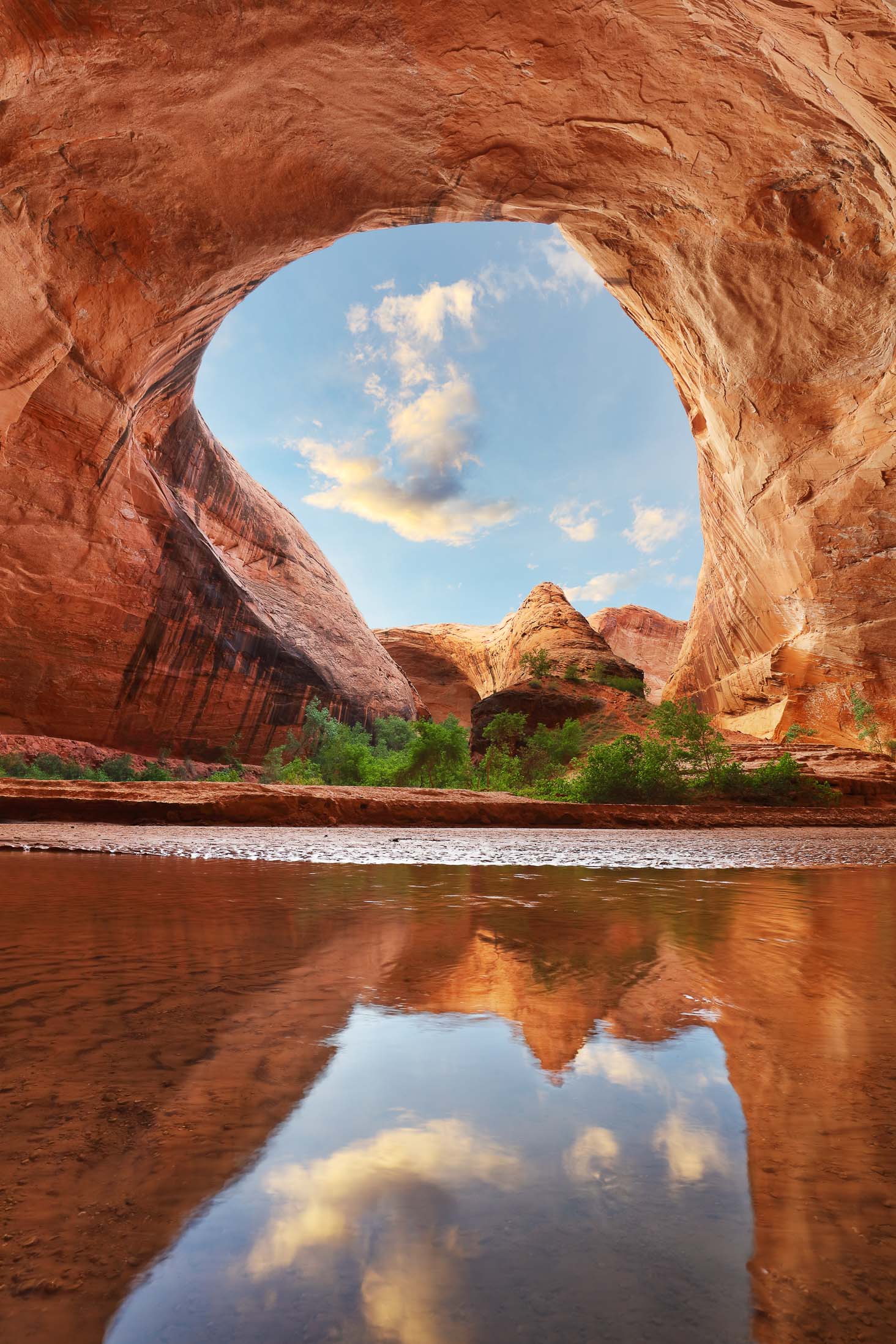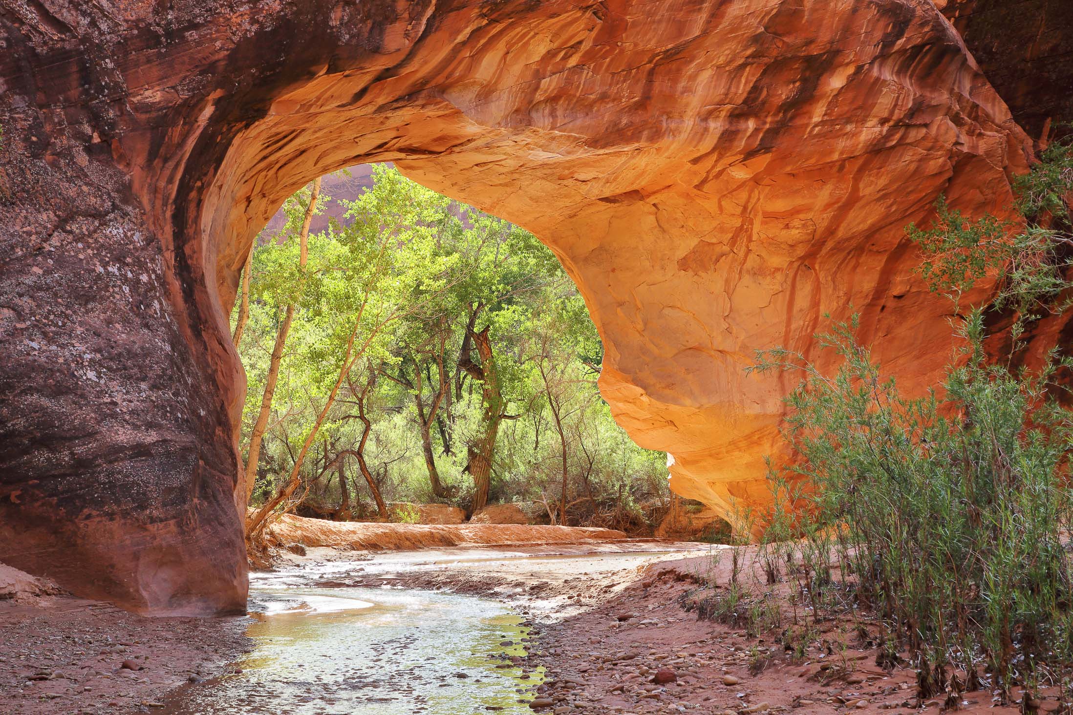 Der Coyote Gulch befindet sich im Grand-Staircase-Escalante National Monument und gilt als einer der schönsten Canyons im Südwesten der USA. Die bis zu 200 Meter tiefe Schlucht zeichnet sich insbesondere durch hohe vertikale Felswände, spektakuläre Arches, riesige überhängende Alcoven, Felsbögen und unzählige kleine Kaskaden aus. Des weiteren wachsen im Canyon entlang des Coyote Creek zahlreiche Cottonwood Bäume, die im Frühling und Sommer mit ihrem satten Grün einen herrlichen Kontrast zu den rotbraunen Sandsteinwänden des Canyons bilden. Im Herbst verfärben sich die Blätter der Cottonwood Bäume in leuchtendes Gelb und sorgen für eine regelrechte Farbexplosion im Canyon. Während der Coyote Gulch im oberen Bereich sehr breit ist, verengt er sich im unteren Bereich immer weiter und die Felswände werden höher und steiler. Die Hauptattraktionen im Canyon sind der Jacob Hamblin Arch mit den umliegenden riesigen Alcoven, die Coyote Natural Bridge, die Swiss Cheese Waterfalls sowie Piktogramme und Ruinen von Indianern. Für mich waren das mehr als genug Gründe, um diesen einzigartigen Canyon auf einer Reise in den Südwesten der USA zu besuchen.